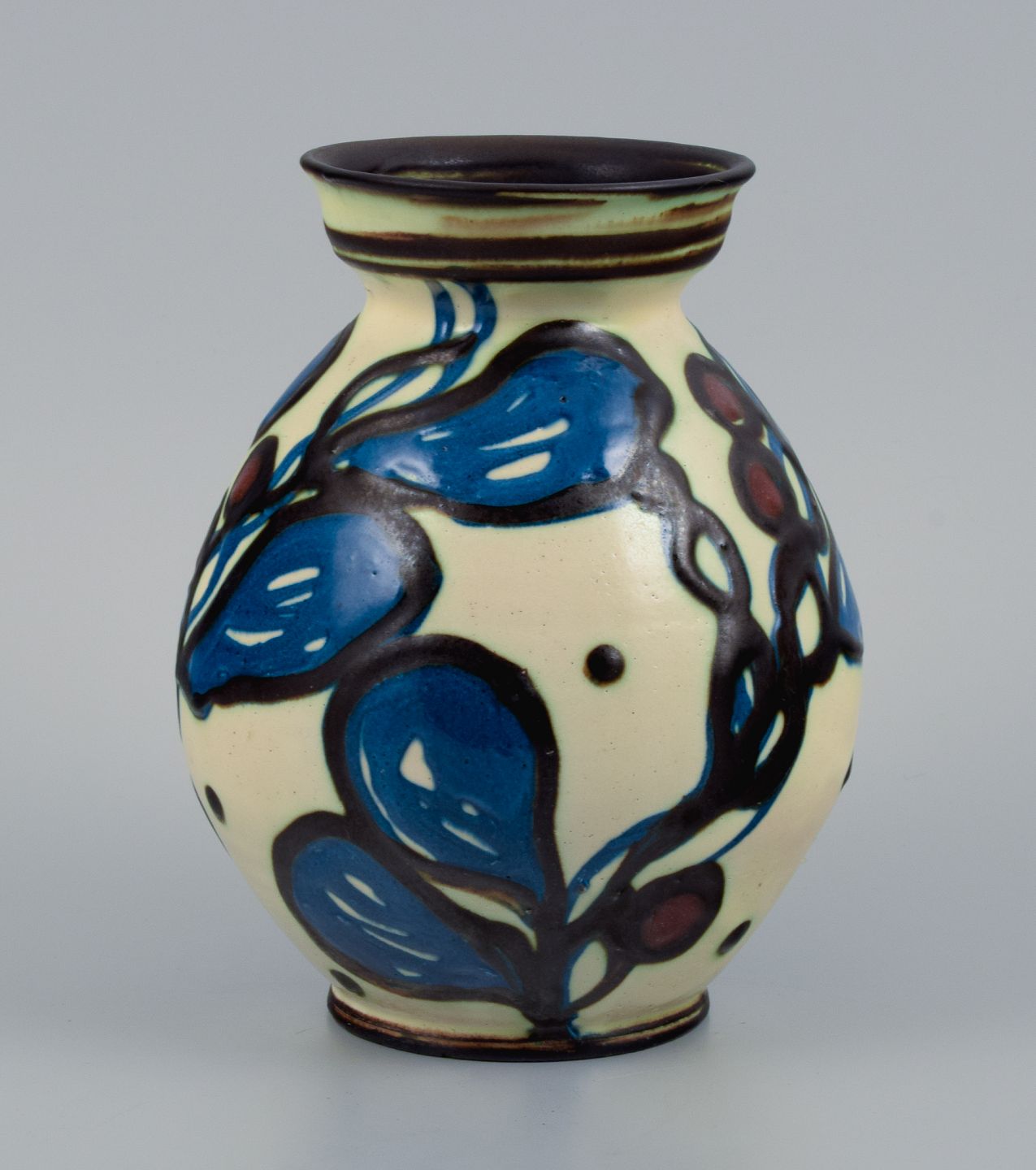Kähler, HAK, keramikvase med blomsterdekoration i kohornsteknik. Blå og sorte blomster på lys baggrund. 1930’erne. Stemplet. Perfekt stand. Mål: H 18,0 x D 14,0 cm.
