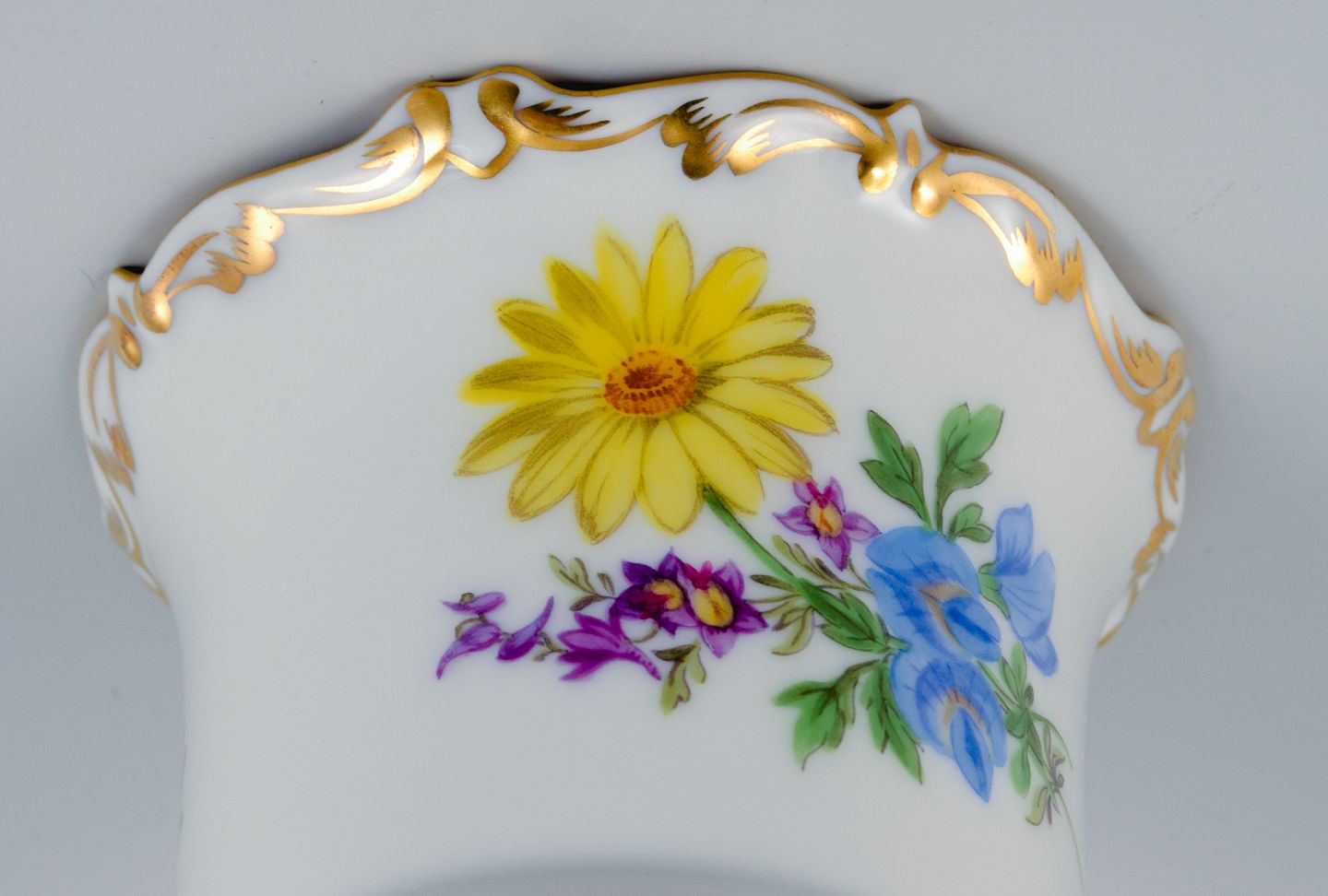 Meissen, Tyskland, lille vase på fire fødder håndmalet med blomstermotiv.