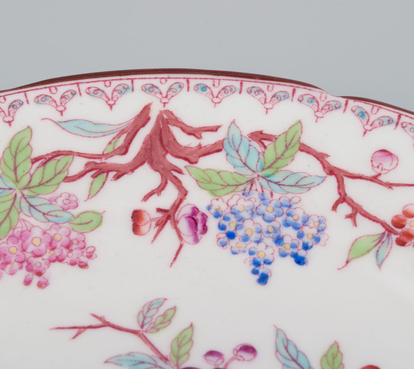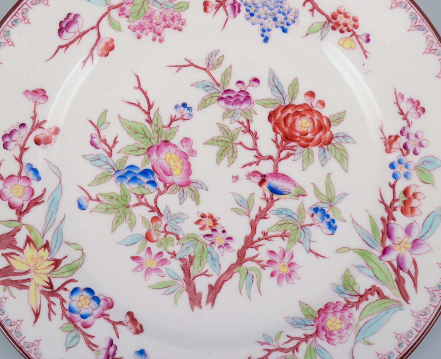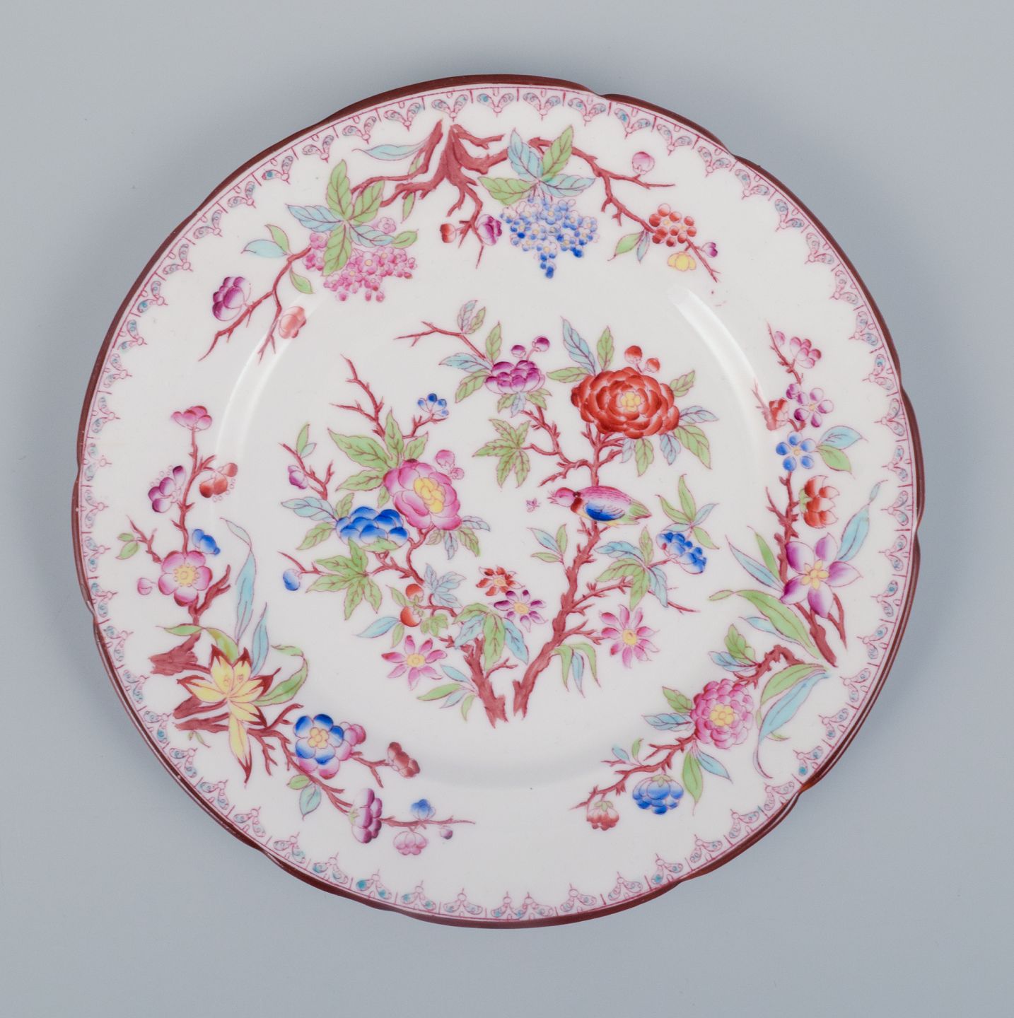 Sarreguemines, Frankrig, et sæt på seks tallerkner i porcelæn, håndmalet med blomstermotiver. Ca. 1870’erne. Stemplet. I flot stand. Den ene tallerken med hårrevne. Mål: D 18,0 cm.