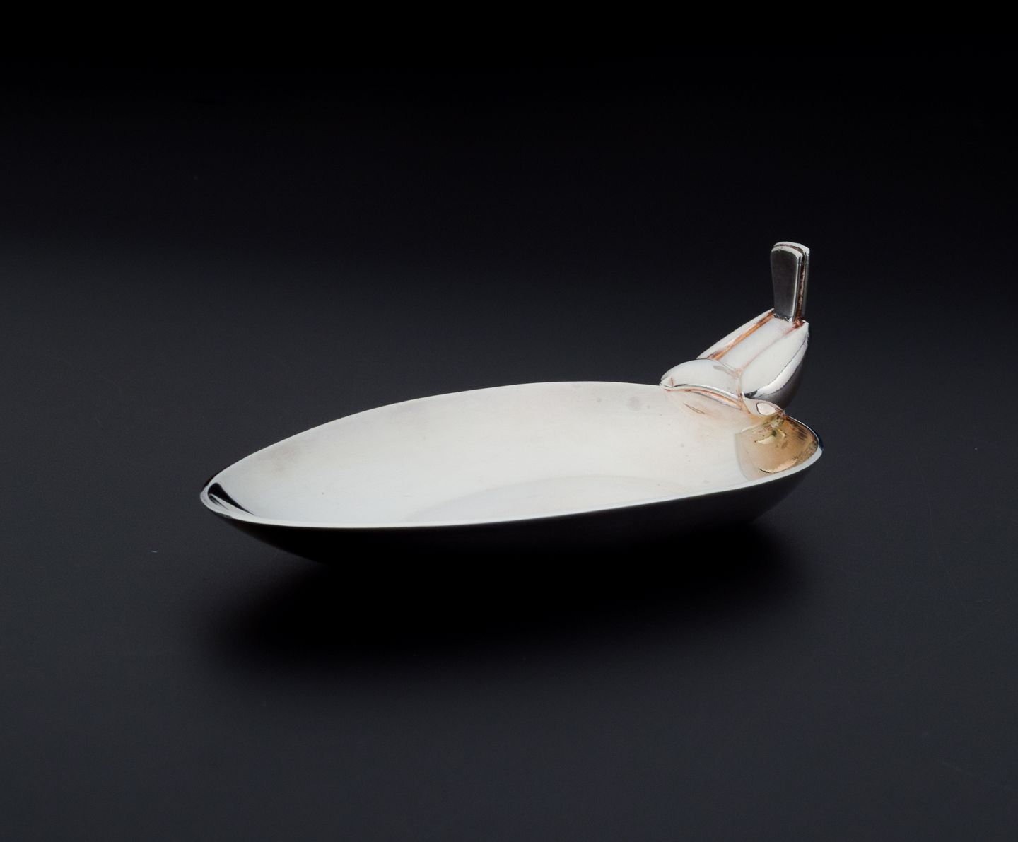 Christofle, Paris, Frankrig, lille modernistisk skål med fugl på toppen. Nysølv. Midt 1900-tallet. Stemplet. Perfekt stand. Mål: L 12,5 x D 6,8 x H 2,0 cm.