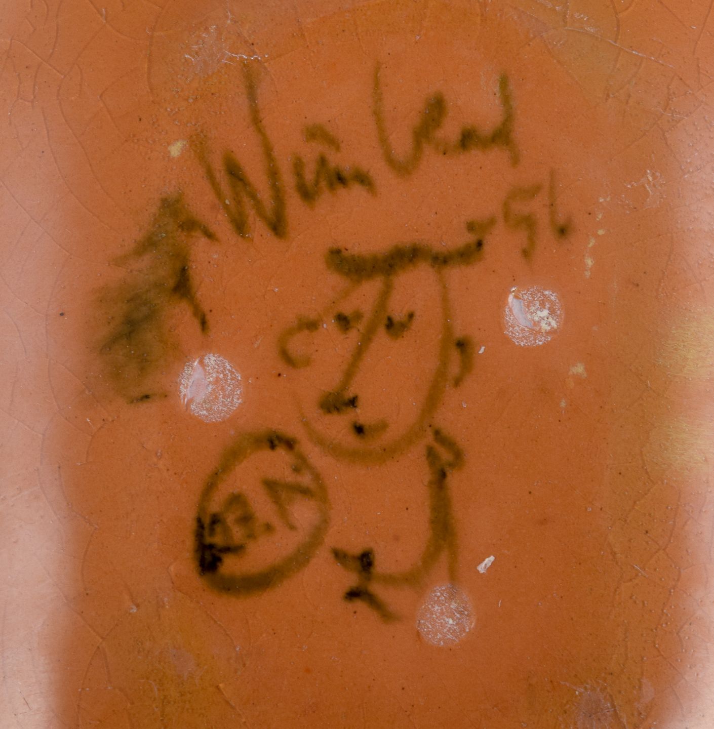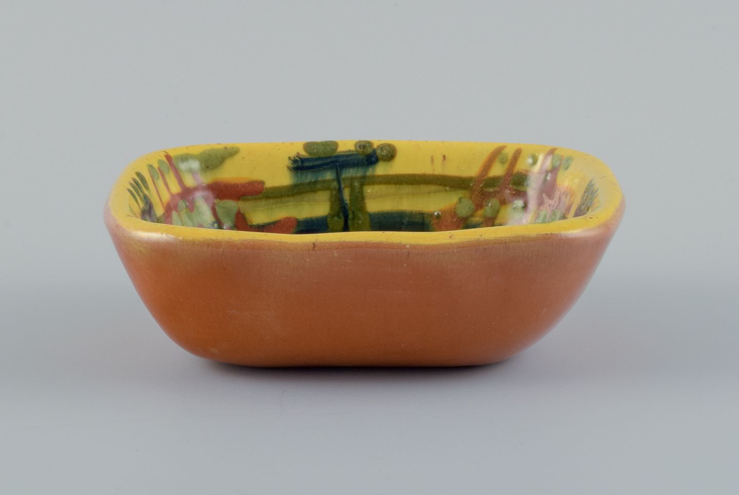 Bjørn Wiinblad (1918-2006), Danmark. Eget værksted. Unik og tidlig skål i håndmalet keramik. Abstrakt motiv i mange farver.