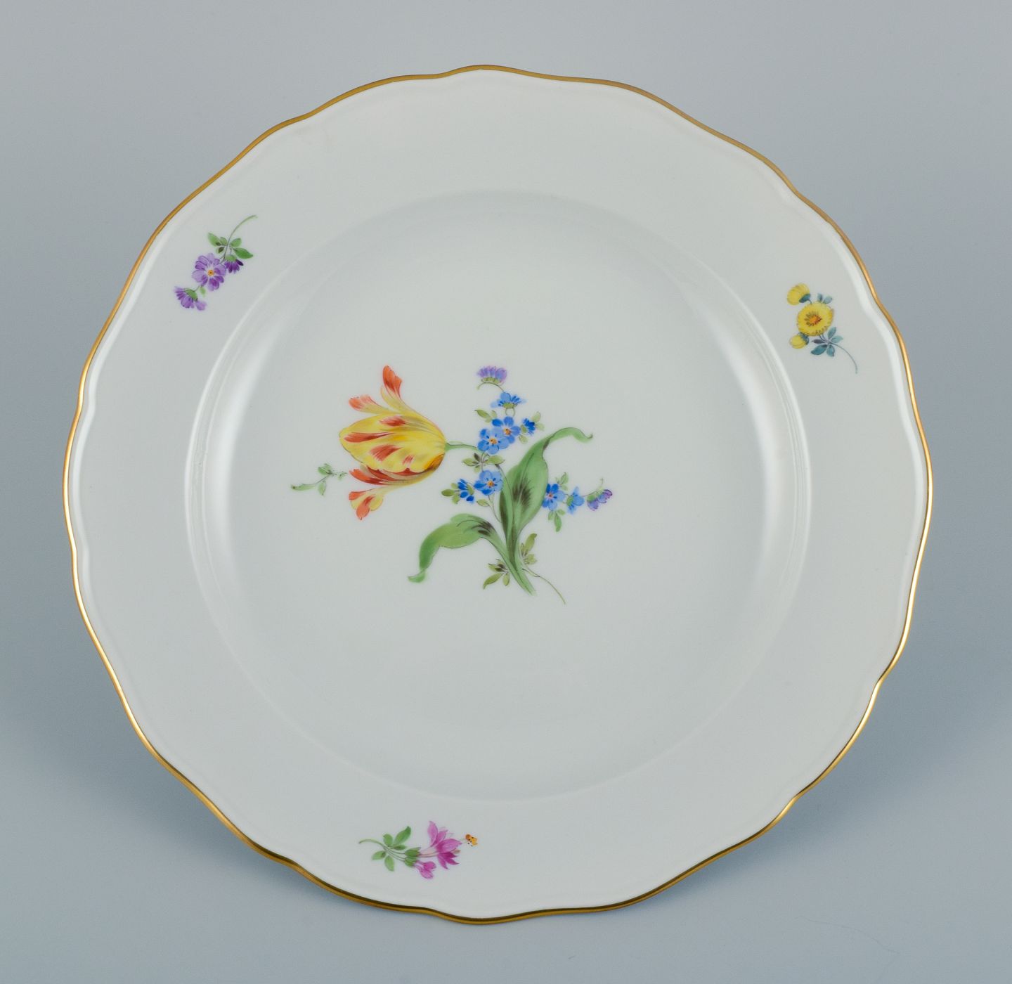 Meissen, Tyskland. Tre store middagstallerkner i porcelæn håndmalet med forskellige blomstermotiver og guldkant. Ca. 1930’erne. I perfekt stand. Tredje sortering. Stemplet. Mål: D 25,5 cm.