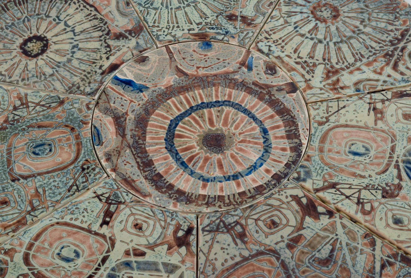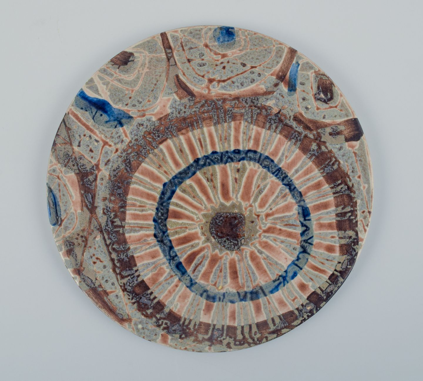 Royal Copenhagen, otte Baca fajancekakler med mønstret glasur i brun, blå, grøn og sandfarver.