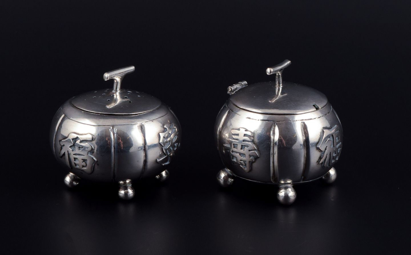 Hong Kong silver, salt and pepper set. Approx. 1920/30s. Both marked with Chinese characters in relief. In excellent condition. Pepper shaker dimensions: H 4.5 x D 5.0 cm.