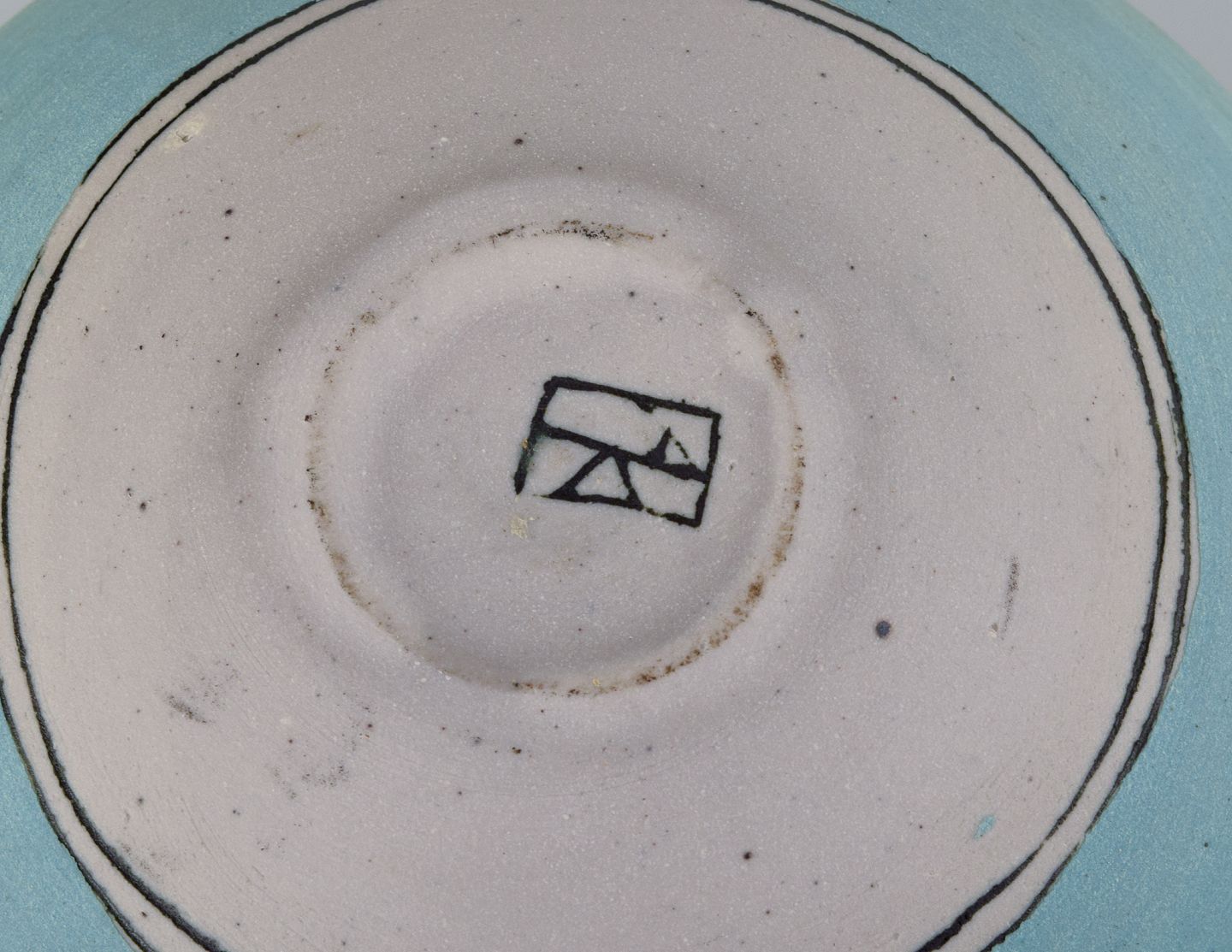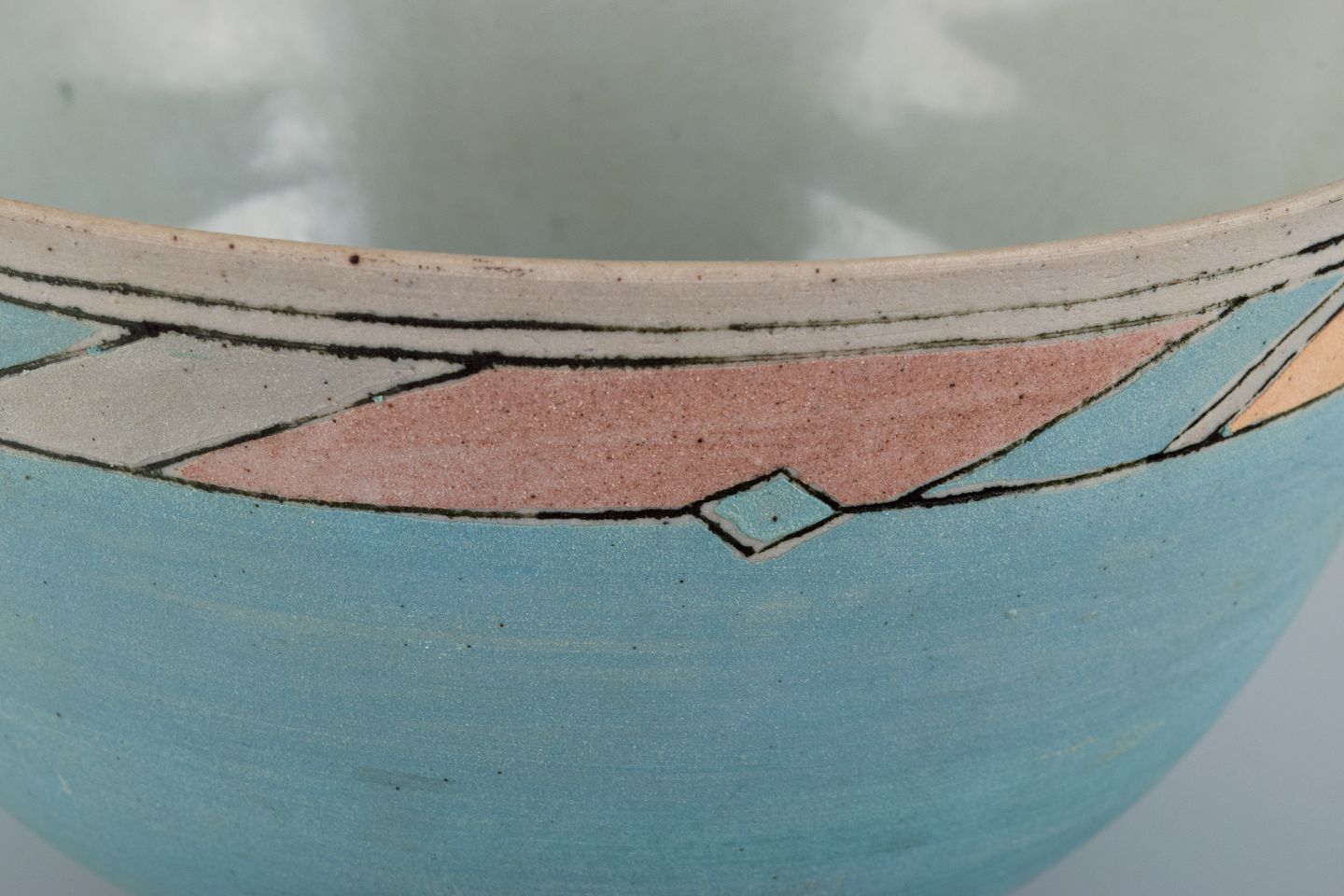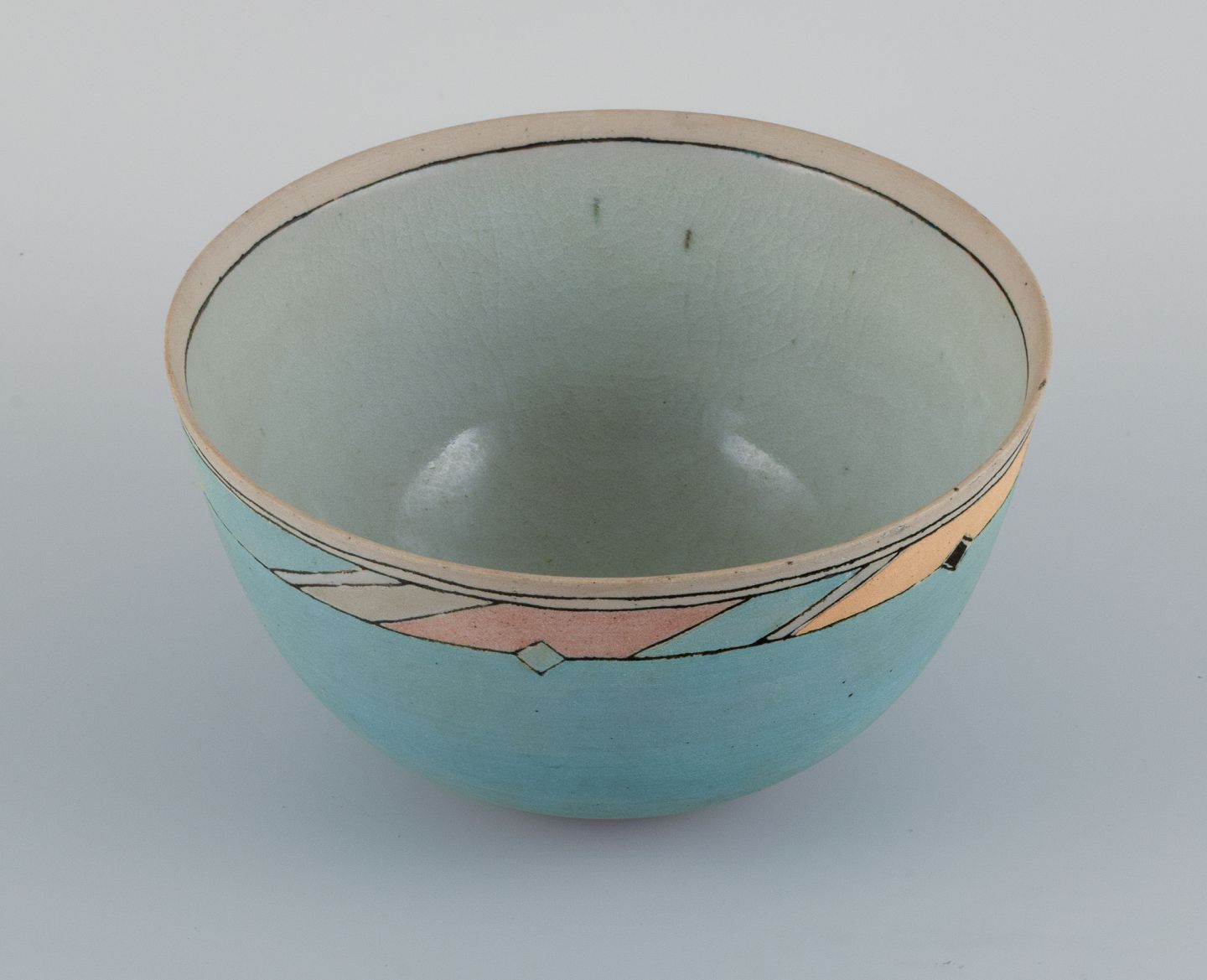 Ane-Katrine von Bülow, dansk samtidskeramiker. Unikaskål i turkis med geometriske felter. Ca. 2000. Signeret. Mål: D 17,0 x H 9,5 cm.