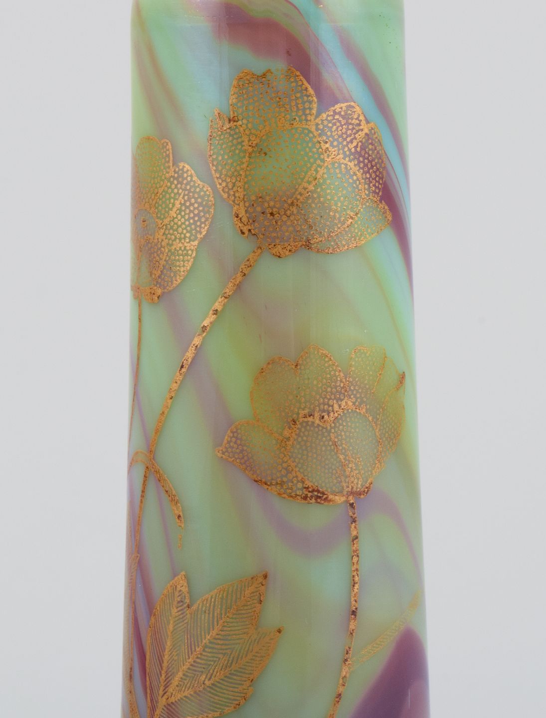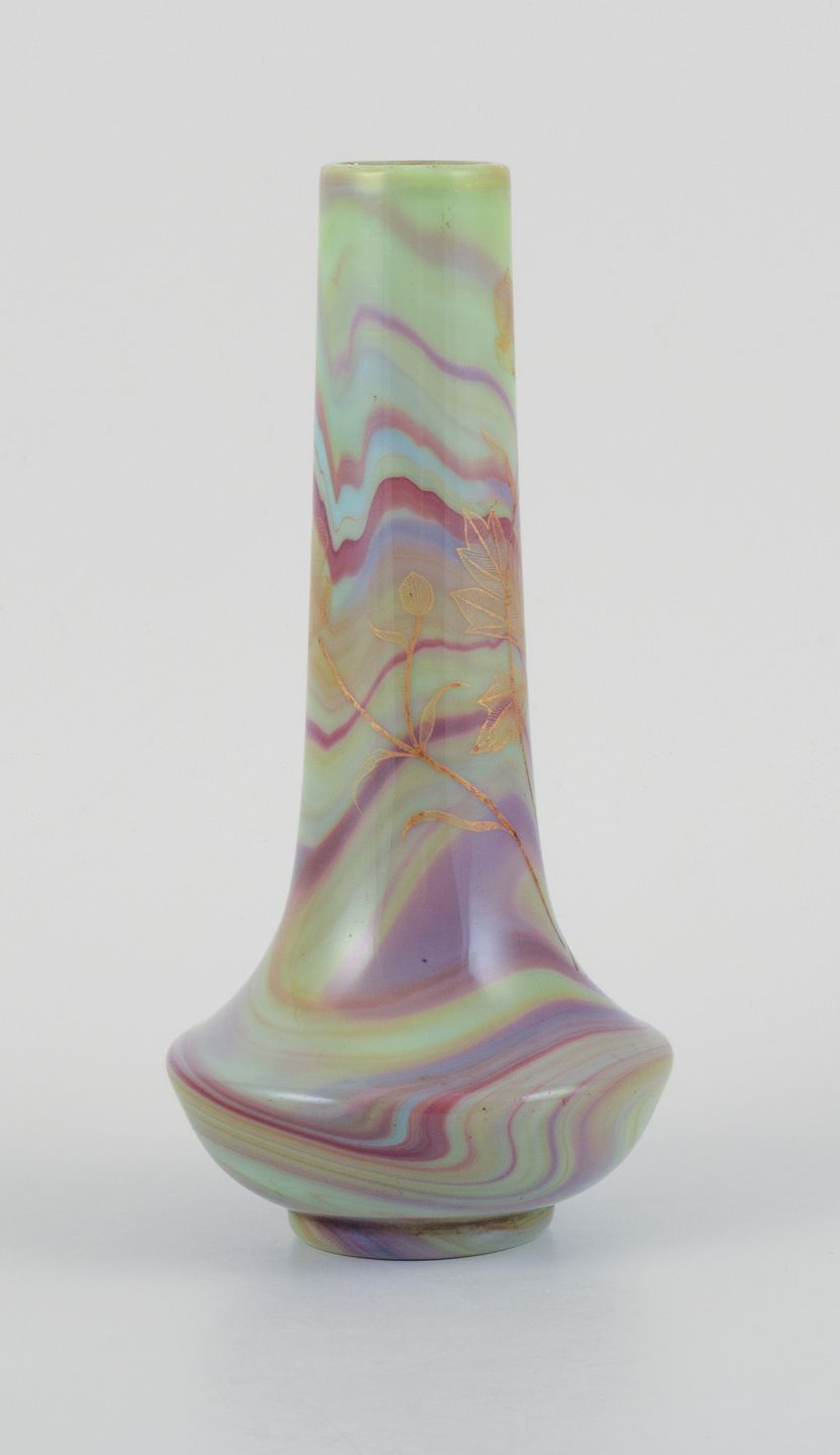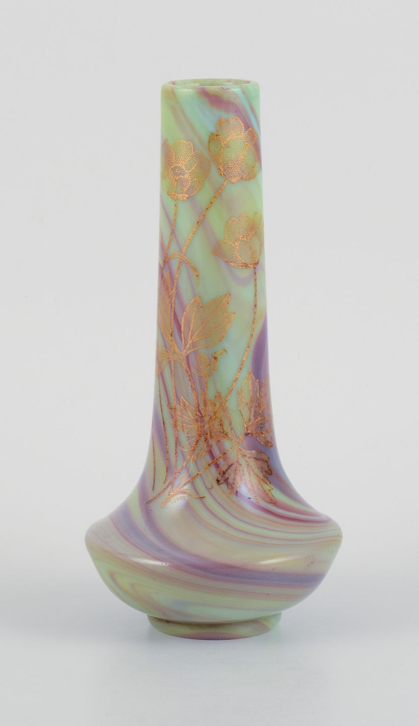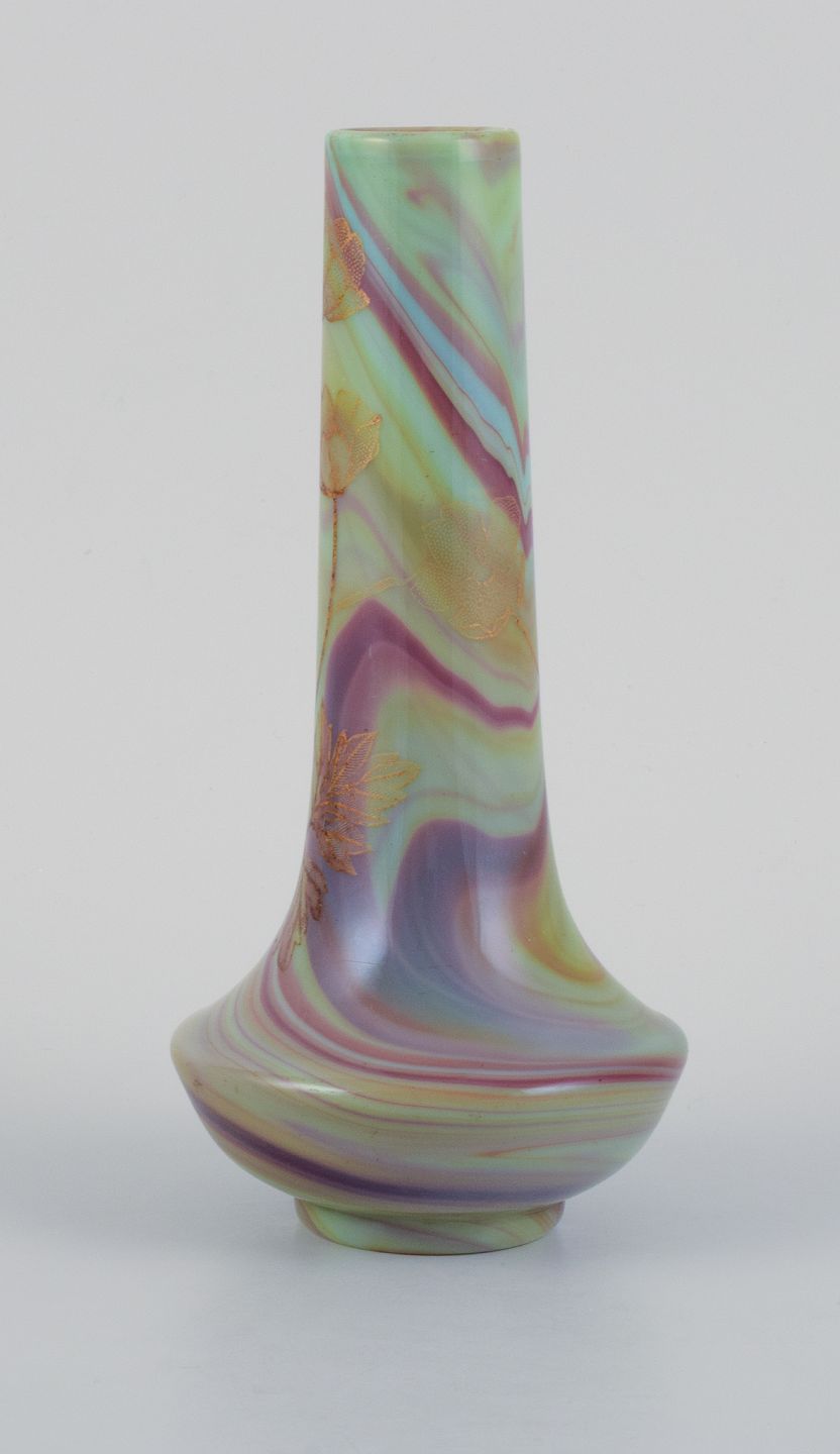 Sevres, fransk kunstglasvase, håndmalet marmor lignende dekoration samt gulddekoreret blomsterbuket. Tidligt 1900-tallet. Signeret. Perfekt stand. Mål: H 19,5 cm. x D 9,5 cm.