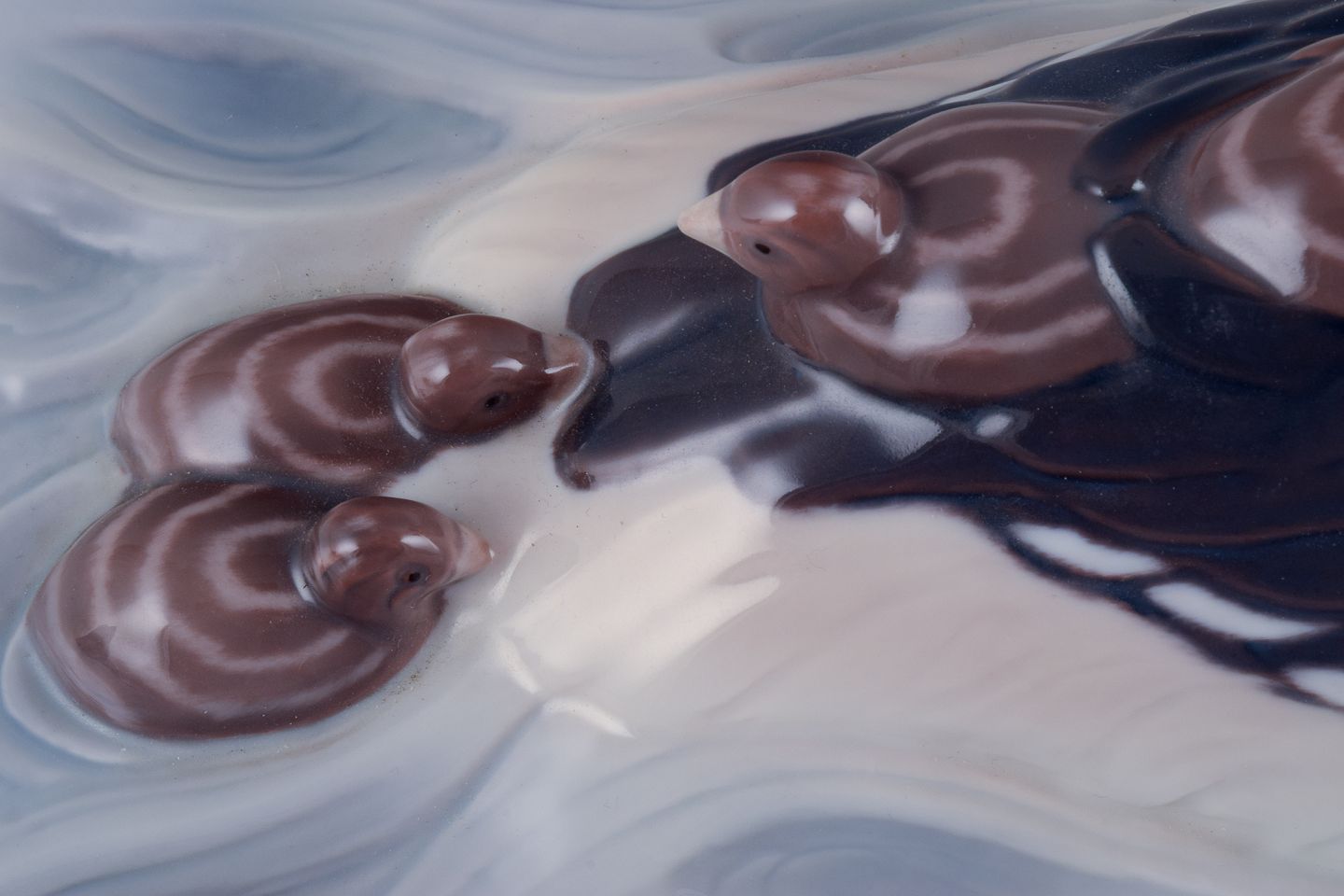 Bing og Grøndahl. Toppet lappedykker med ællinger. Nr. 2439. Første sortering. Perfekt stand. Stemplet. Mål: Længde 28,0 cm. Højde 19 cm.