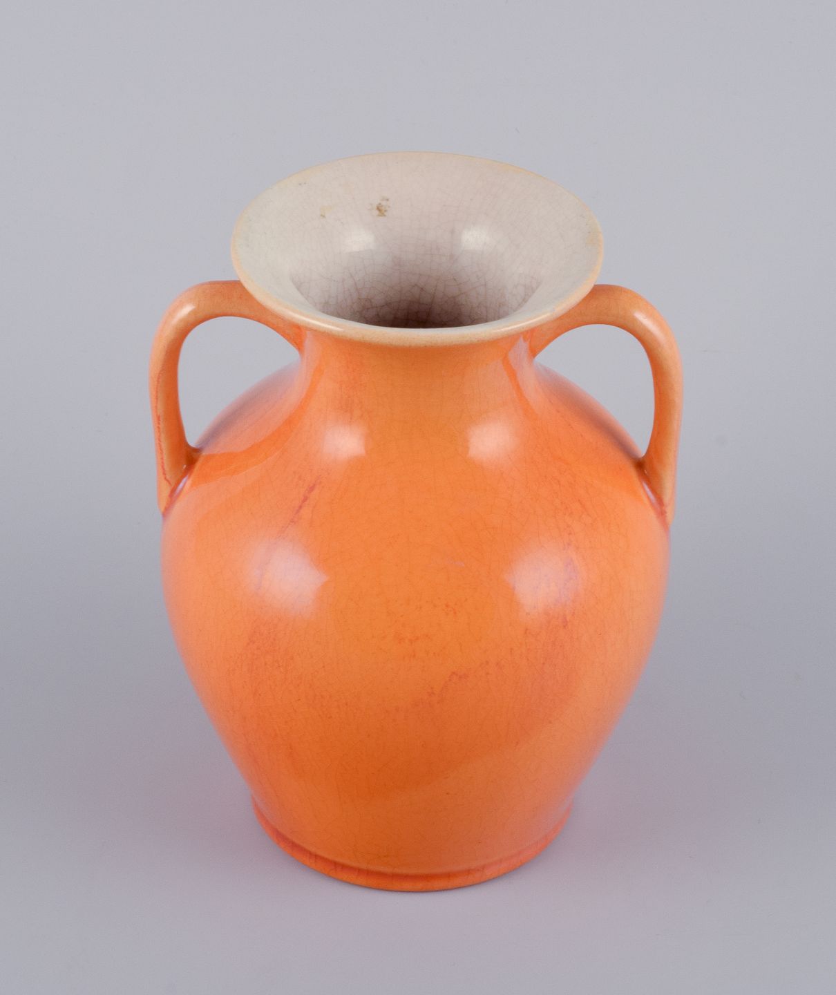 Rörstrand, Sverige, fajancevase med hanke i urangul glasur. Tidligt 1900-tallet. Stemplet. I flot stand. Mål: H 14,5 cm. x D 12,0 cm.