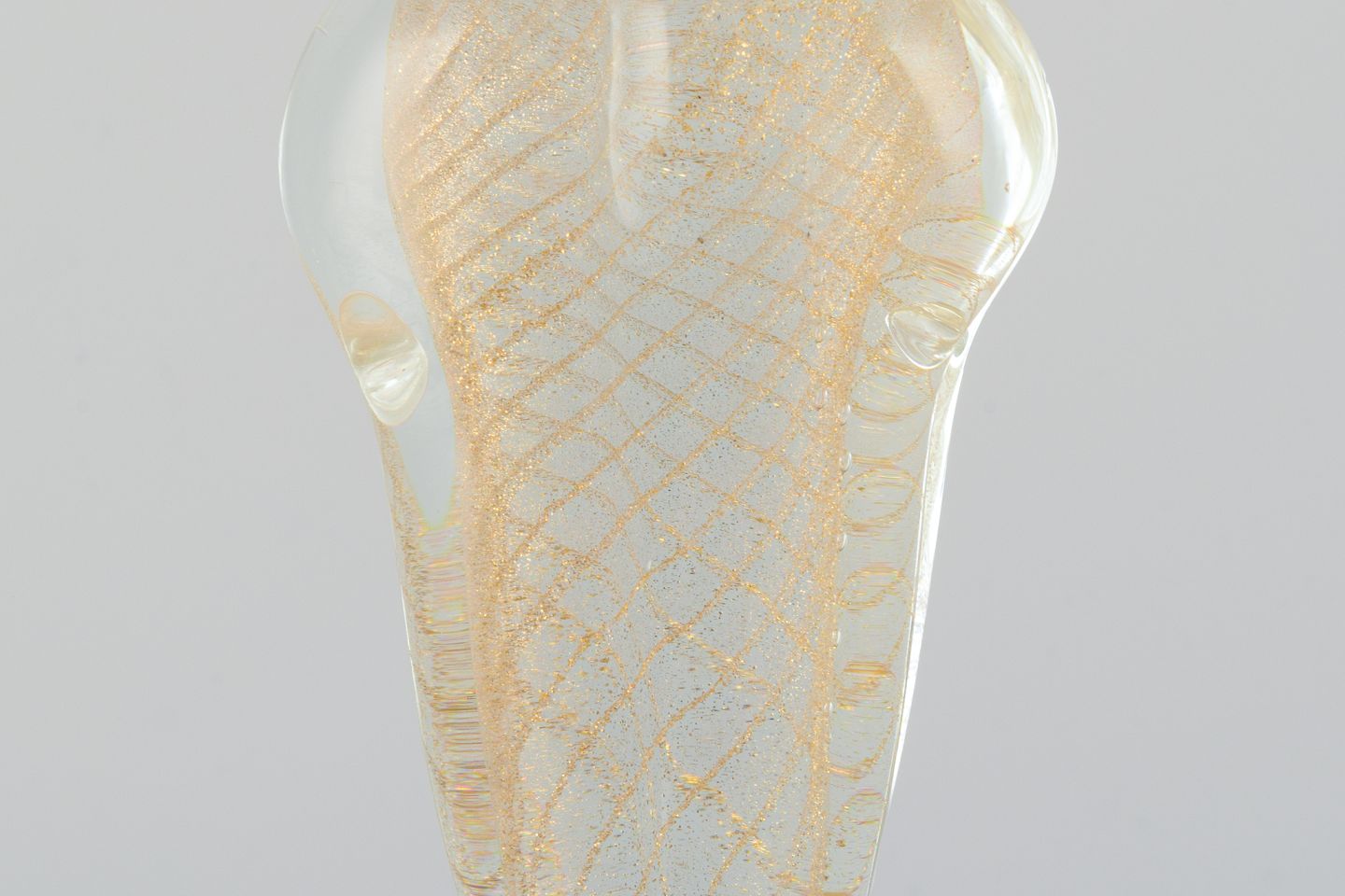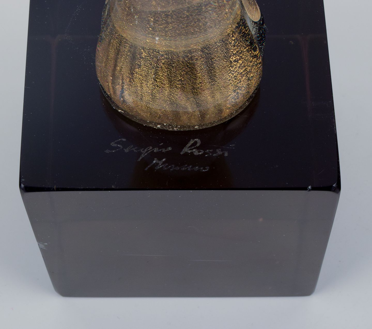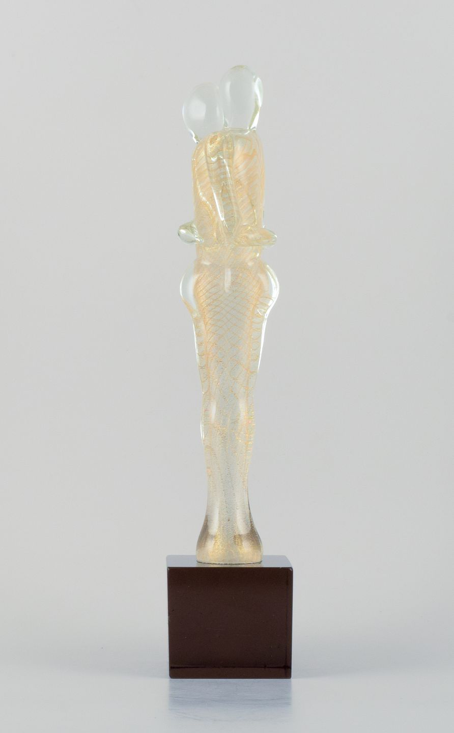 Klart kunstglas med guldindlægninger på røgfarvet sokkel.