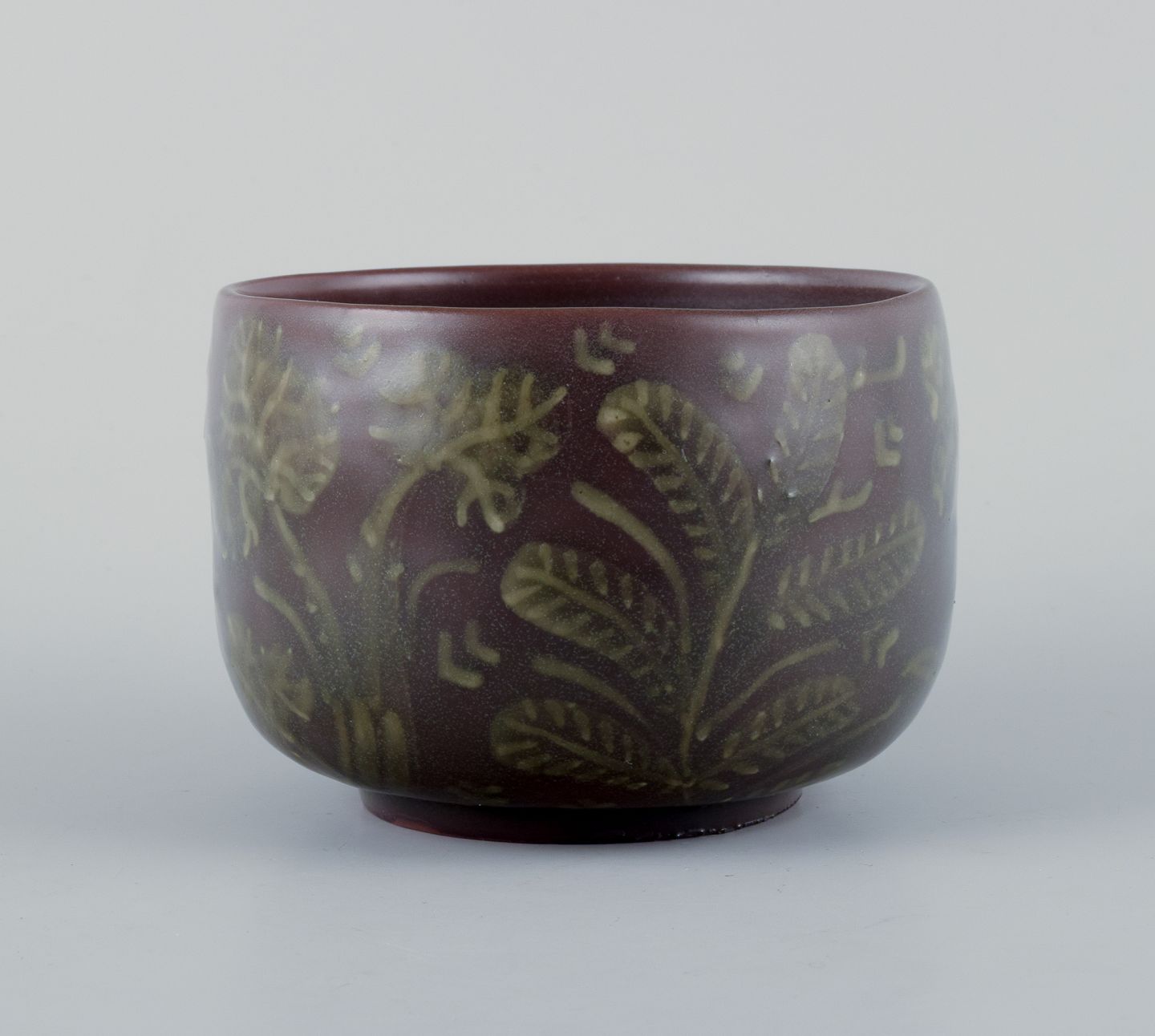 Nils Thorsson for Royal Copenhagen, unika keramikskål dekoreret med blomster. Glasur i brune og grønne nuancer. Midt 1900-tallet. Signeret. Perfekt stand. Første sortering. Mål: H 7,0 cm. x D 9,8 cm.