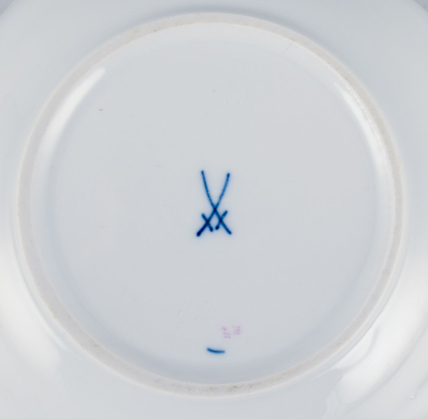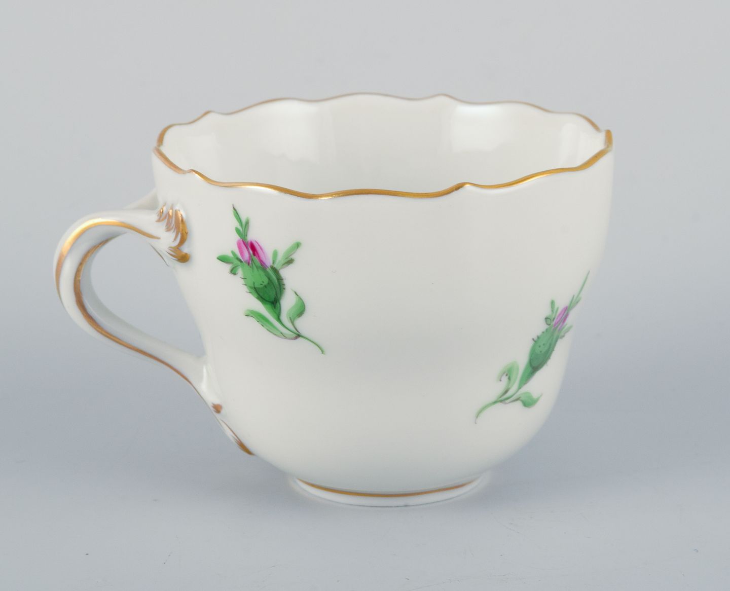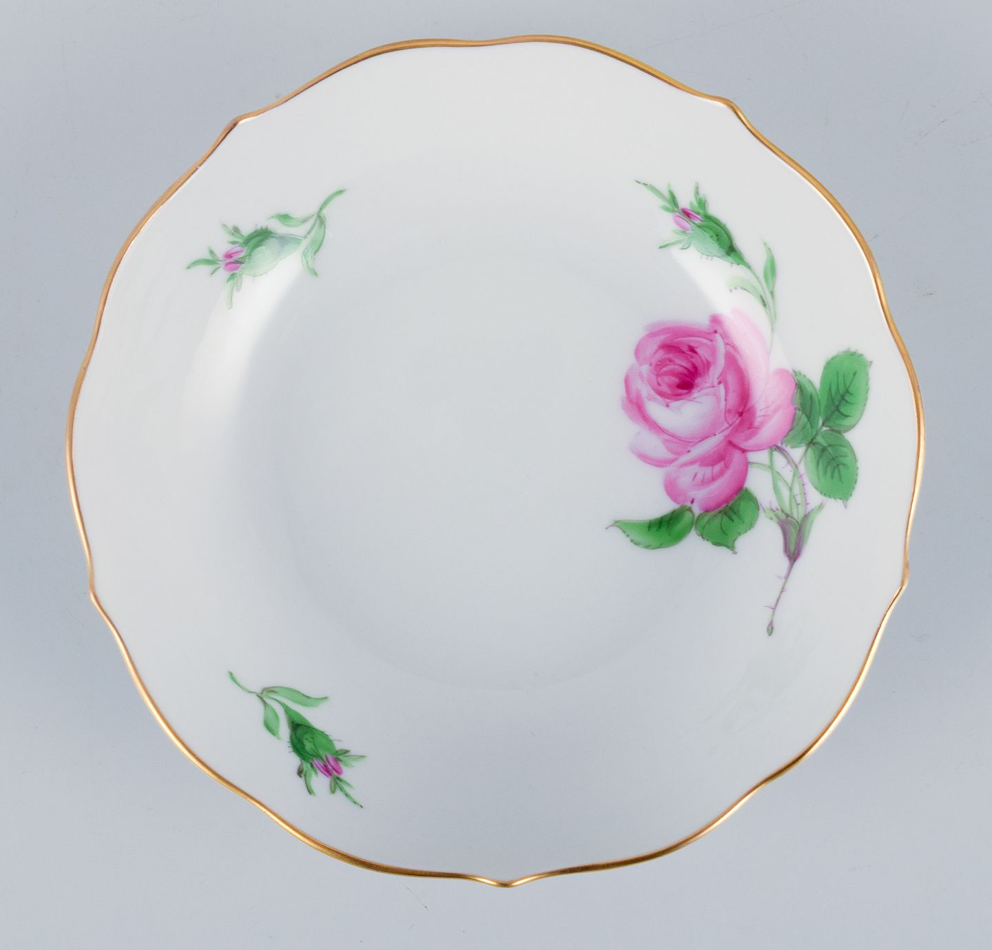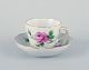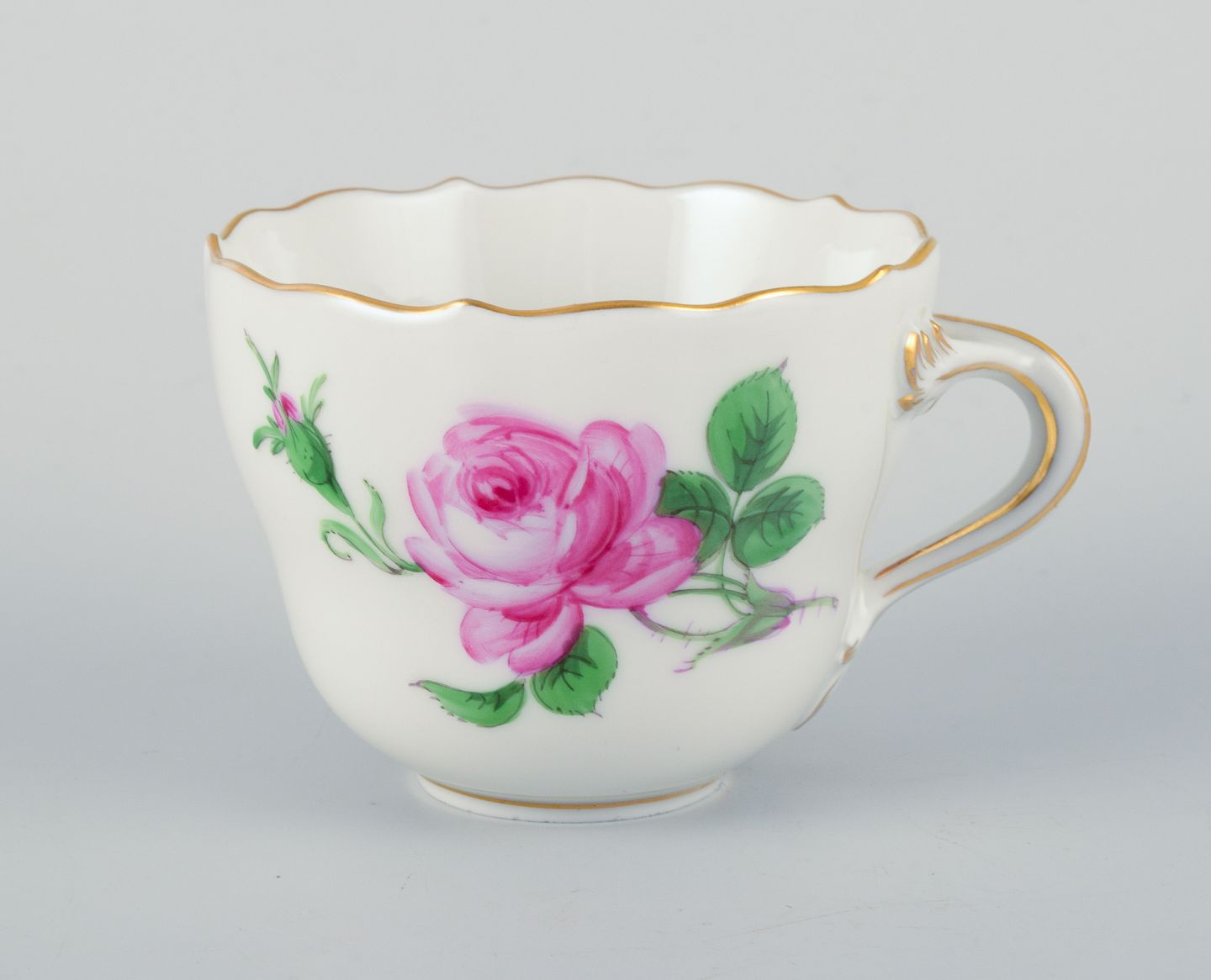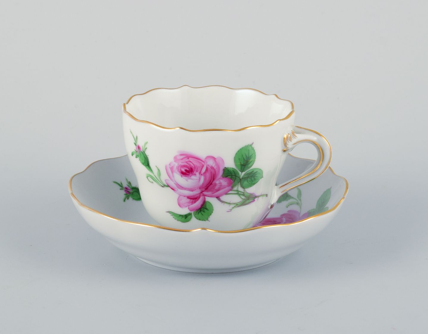 Meissen, "Pink Rose" set of four coffee cups with saucers, hand-painted with pink roses.