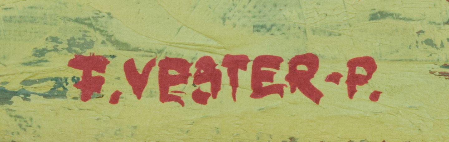 Frans Vester-Pedersen (1934-1972), modernistisk landskab med marker og gård. Ca. 1960’erne. Signeret. Perfekt stand. Mål: B 40,0 cm. x H 32,0 cm. Total: B 42,4 cm. x H 34,4 cm.