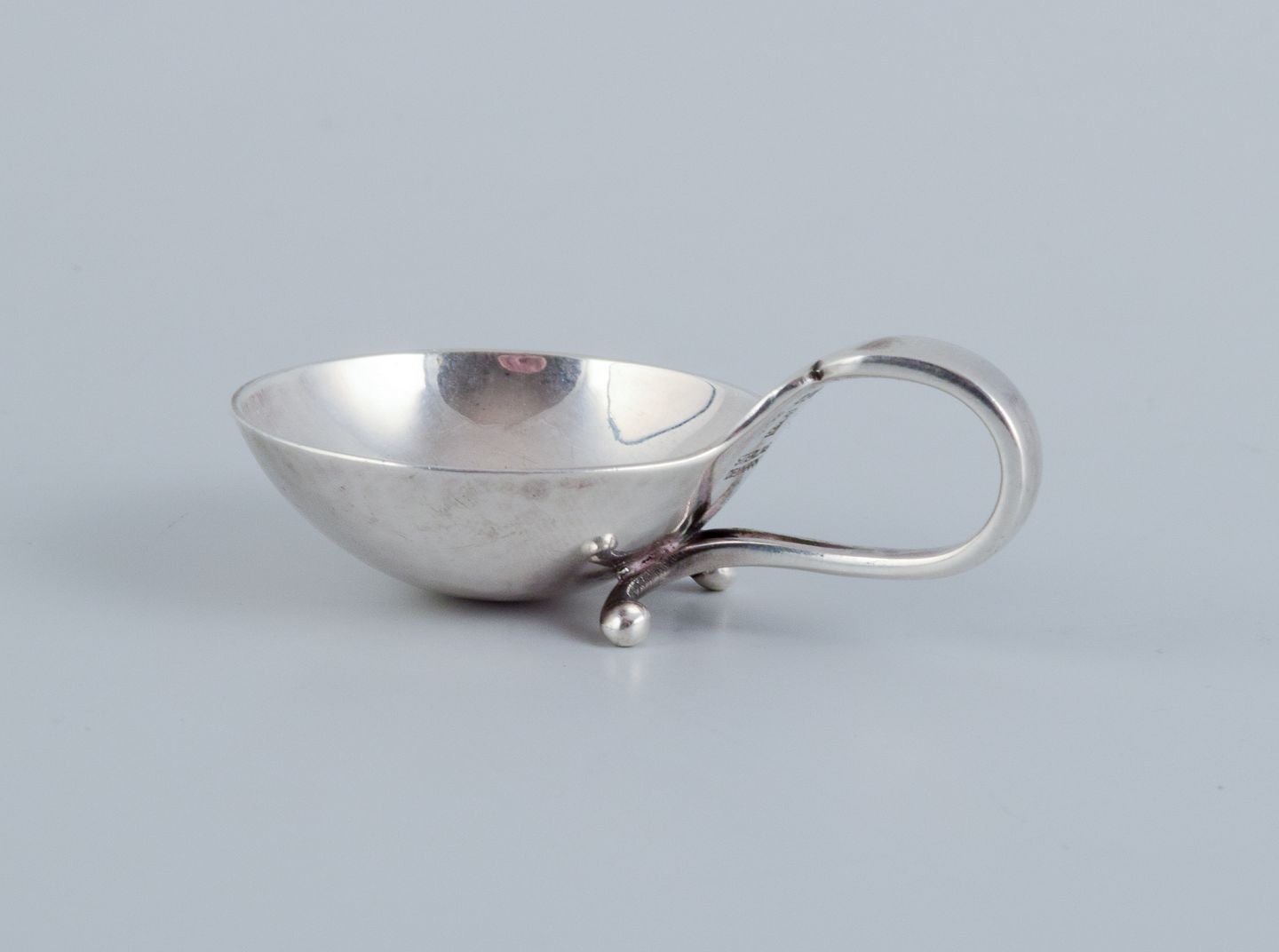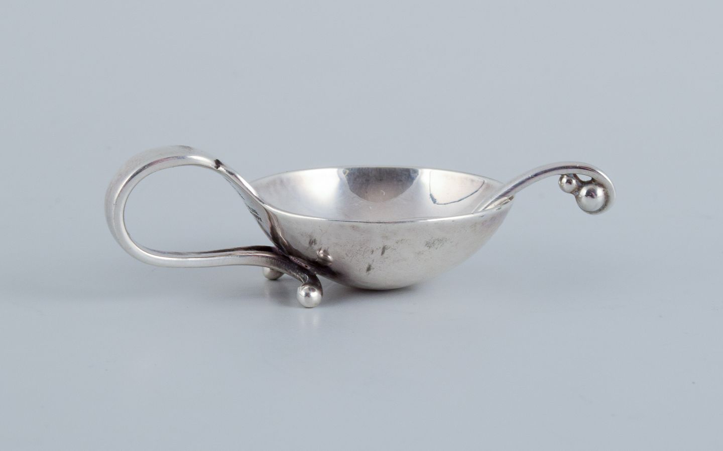 Georg Jensen art deco saltkar med tilhørende saltske i sterlingsølv. Model 110. 1933-1944 stempel. Flot stand. Saltkar: L 5,3 cm. x D 3,5 cm