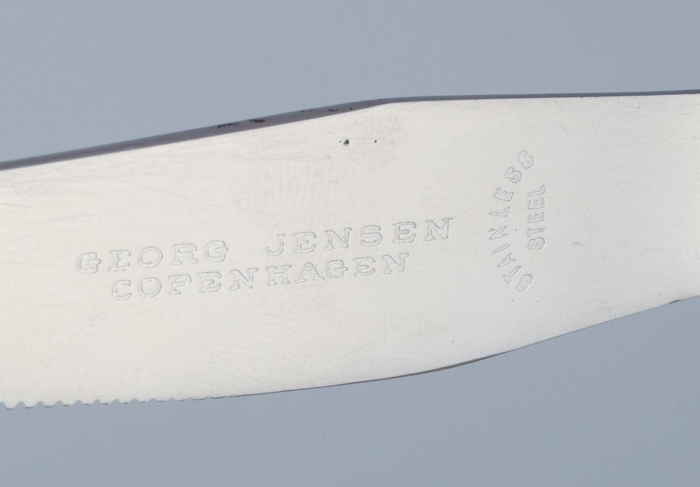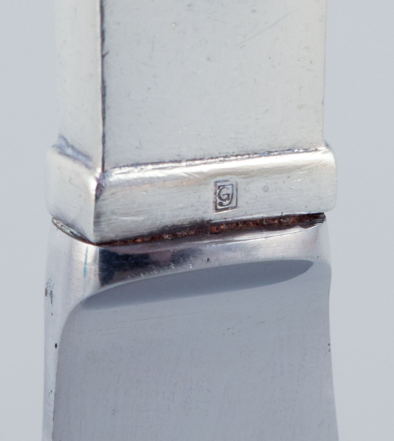 Georg Jensen Pyramide, to kortskaftede frokostknive i sterlingsølv og stål. Knivblade med skær. Stemplet med 1933-1944 stempel. I flot stand. Mål: L 19,4 cm.