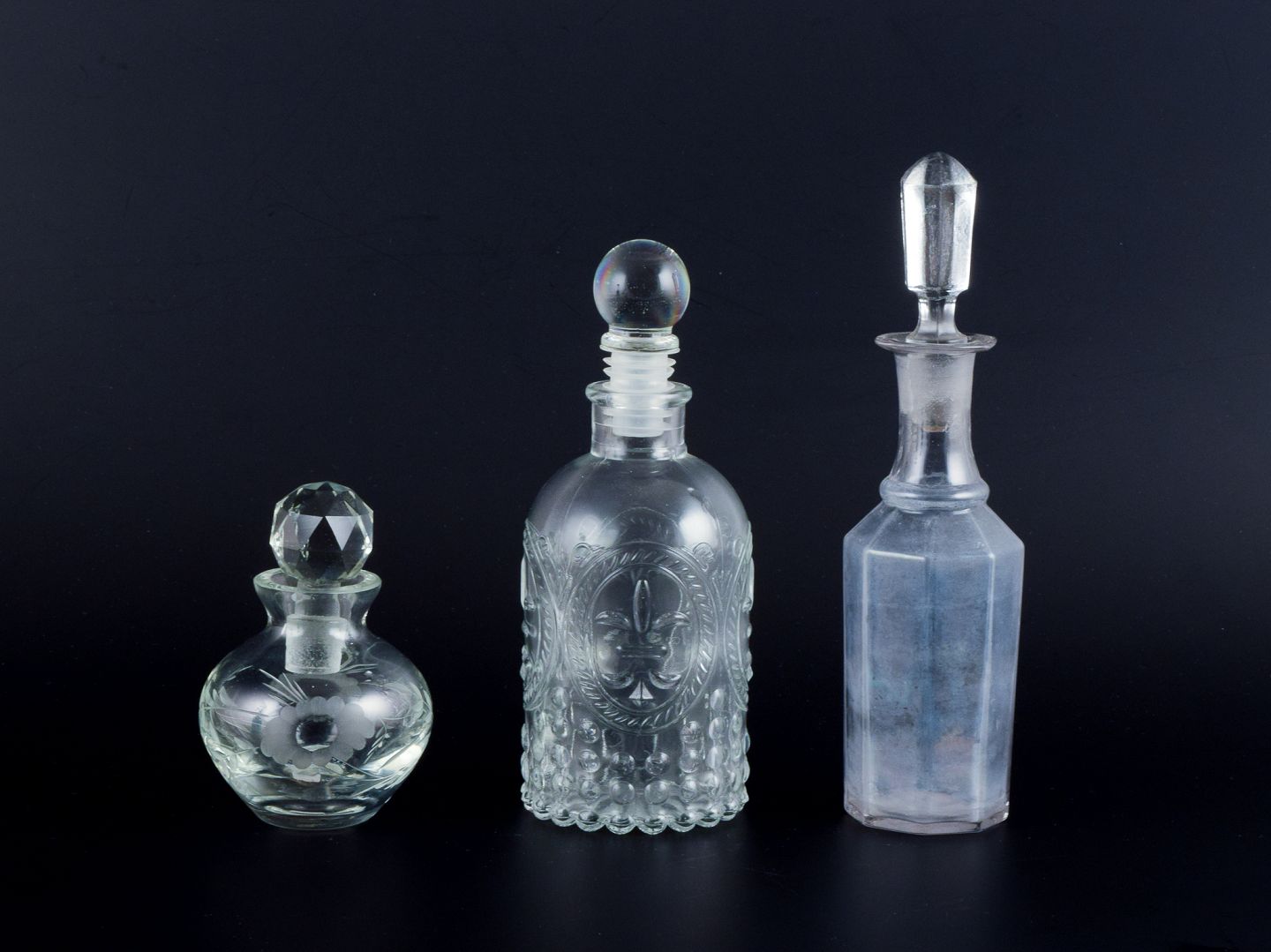Dansk glasværk, tre olie/eddike kander i forskellige designs. Klart glas. 1930/40’erne. I flot stand. Højeste: H 19,0 x D 5,0 cm.