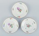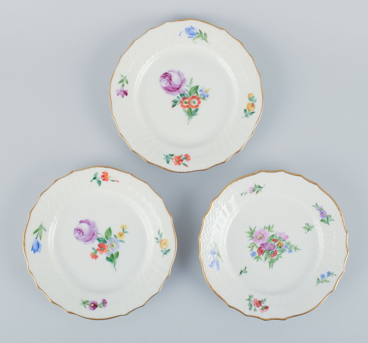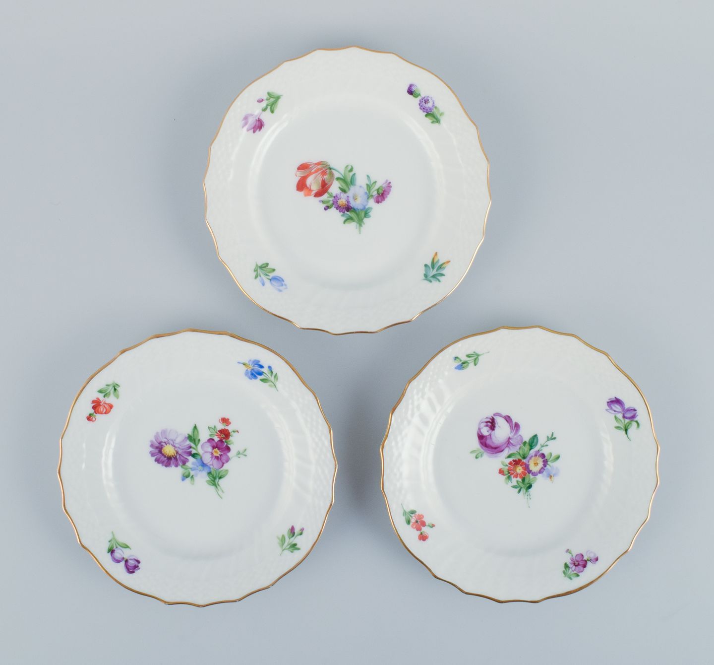 Royal Copenhagen, Saksisk Blomst, et sæt på ti små tallerkner, hånddekoreret med polykrome blomster og guldkant.