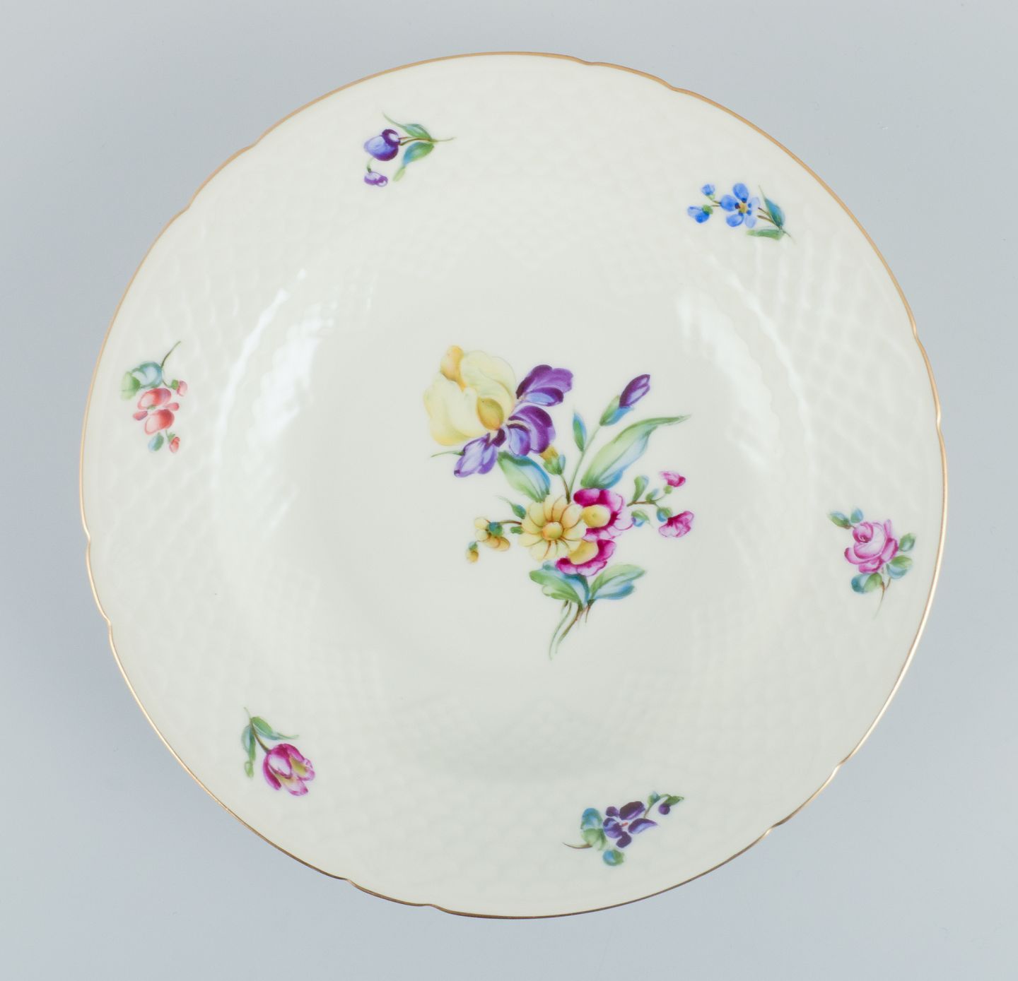 Bing & Grøndahl, Saksisk Blomst, et sæt på seks dybe tallerkner hånddekoreret med polykrome blomster og guldkant.