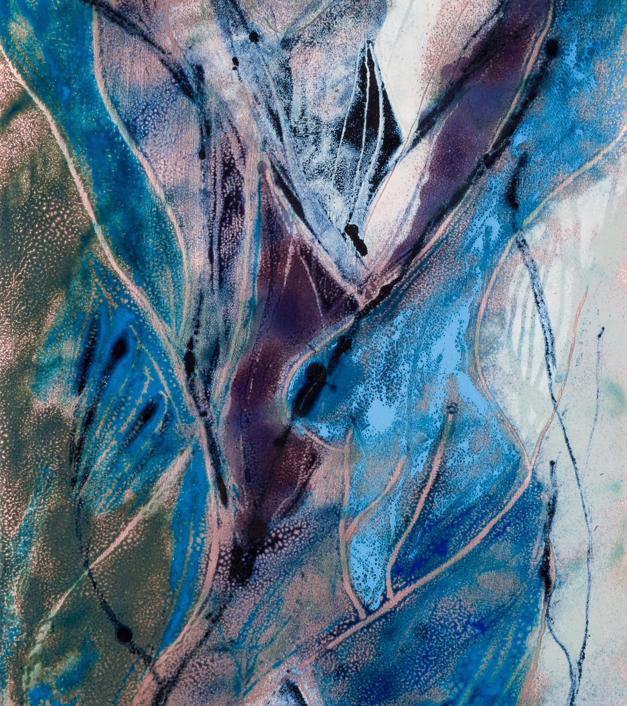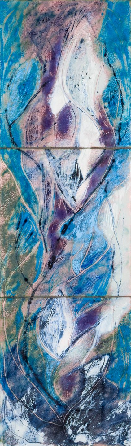 Bodil Eje, emalje på metal opsat på plade. Tredelt abstrakt komposition. Ca. 1960’erne. Signeret Eje. Perfekt stand. Total: B 31,0 cm. x H 102,0 cm.