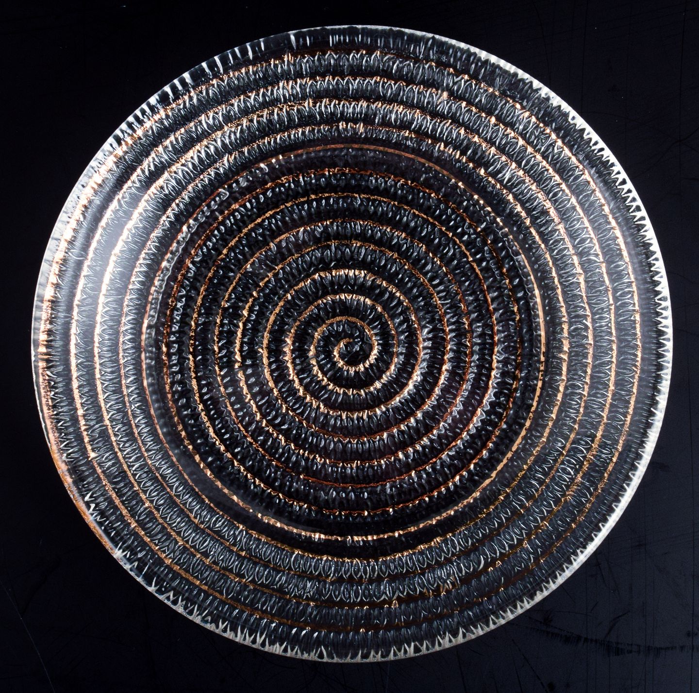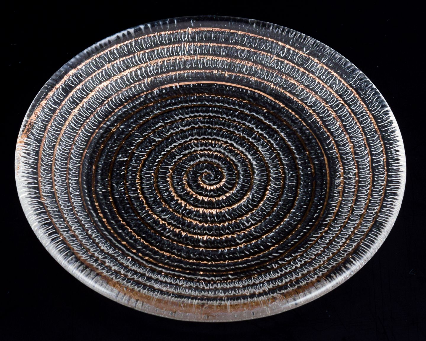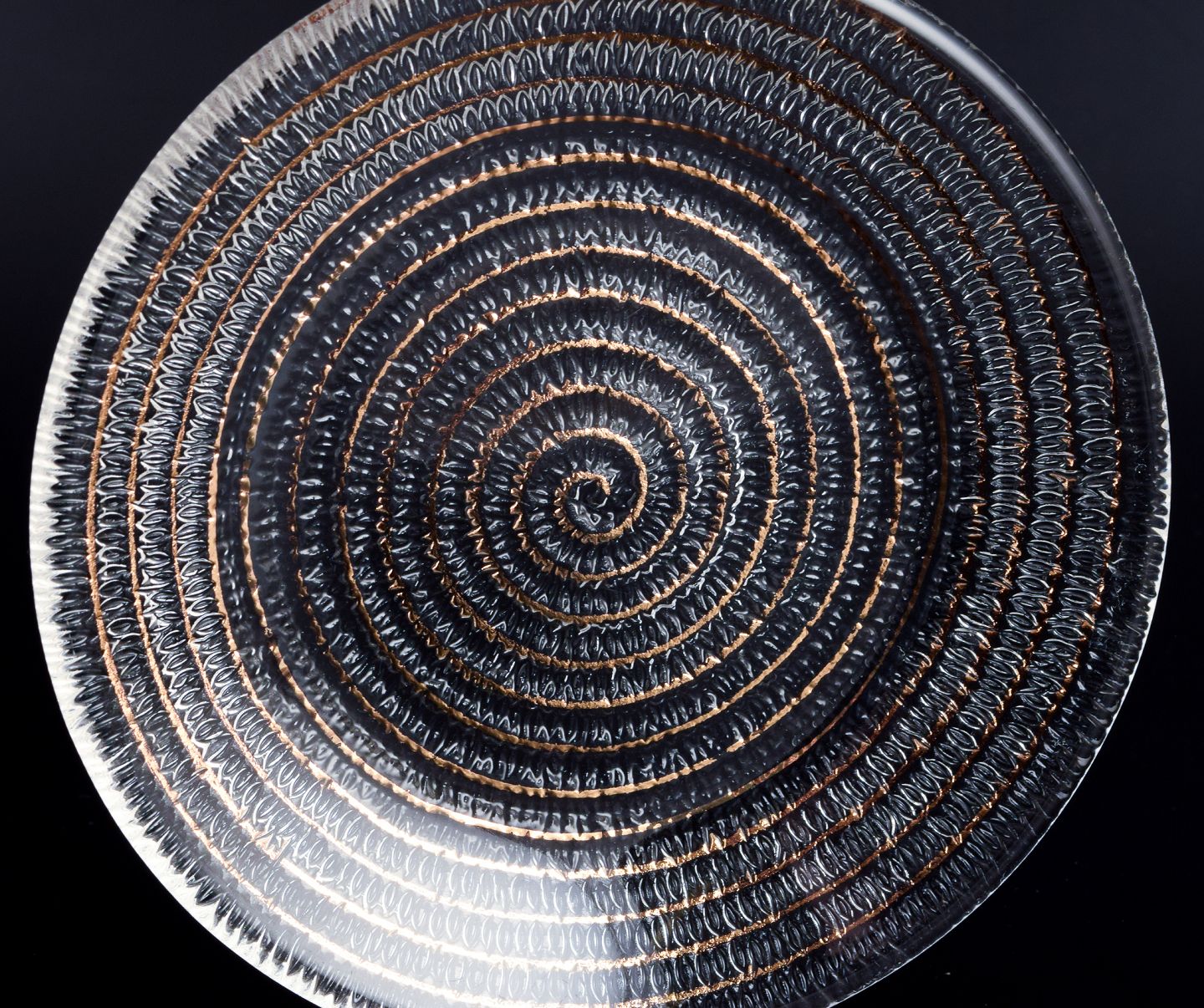 Murano, Italien, et sæt på fire små tallerkner i klart glas med spiralformet gulddekoration. Ca. 1980’erne. Perfekt stand. Mål: D 15,0 cm. x H 2,0 cm.