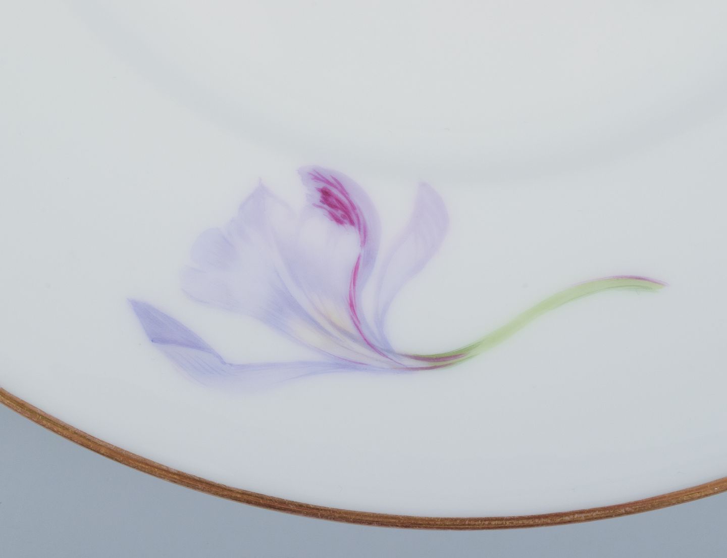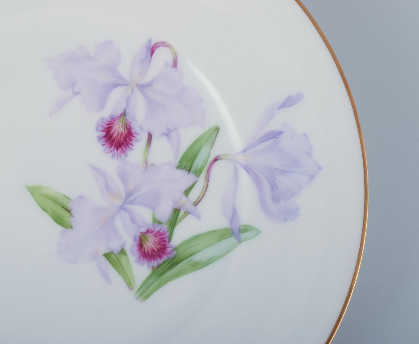Royal Copenhagen, et sæt på fem skønvirke tallerkner håndmalet med liljer og guldkant. Sjældent stel.