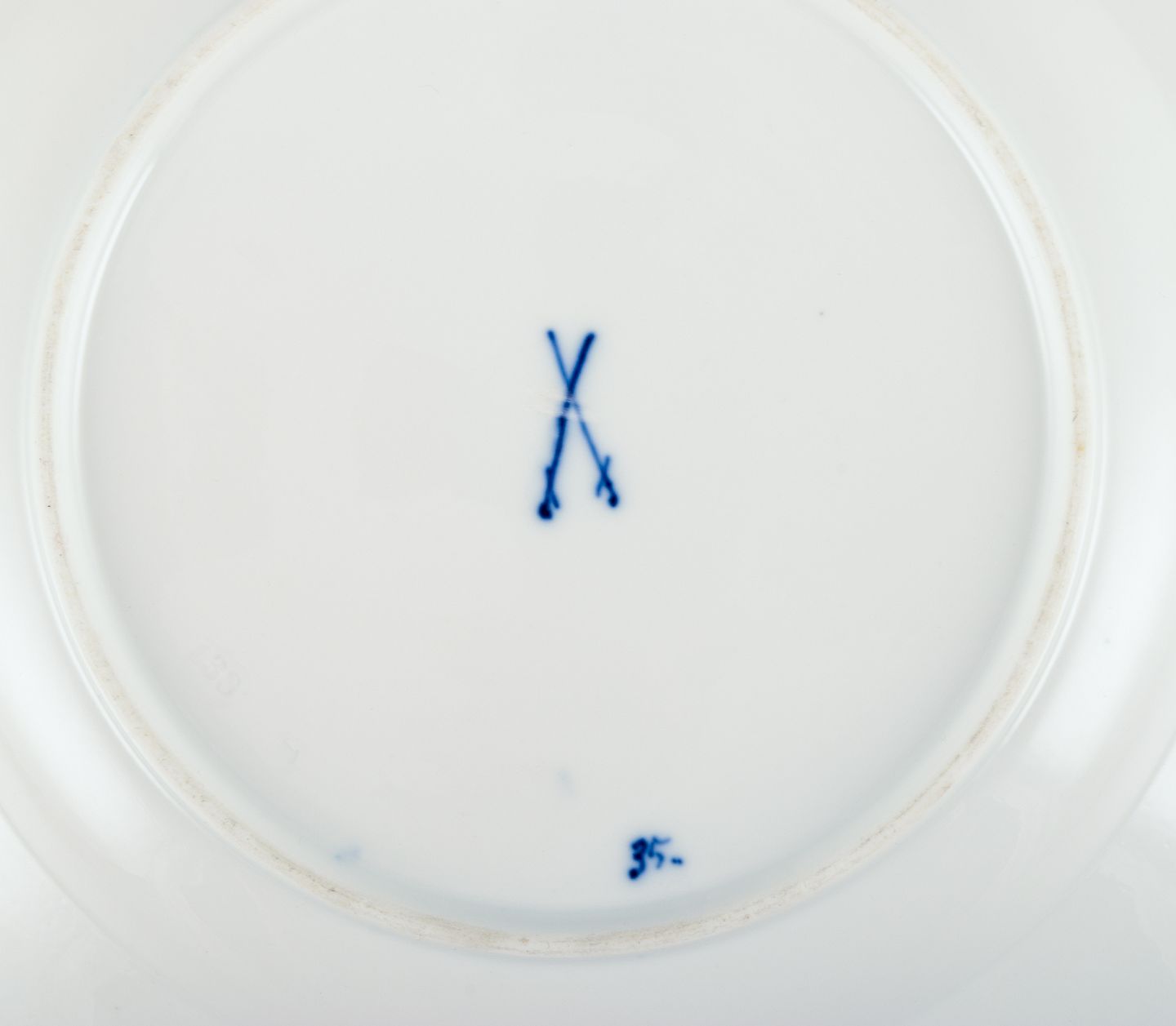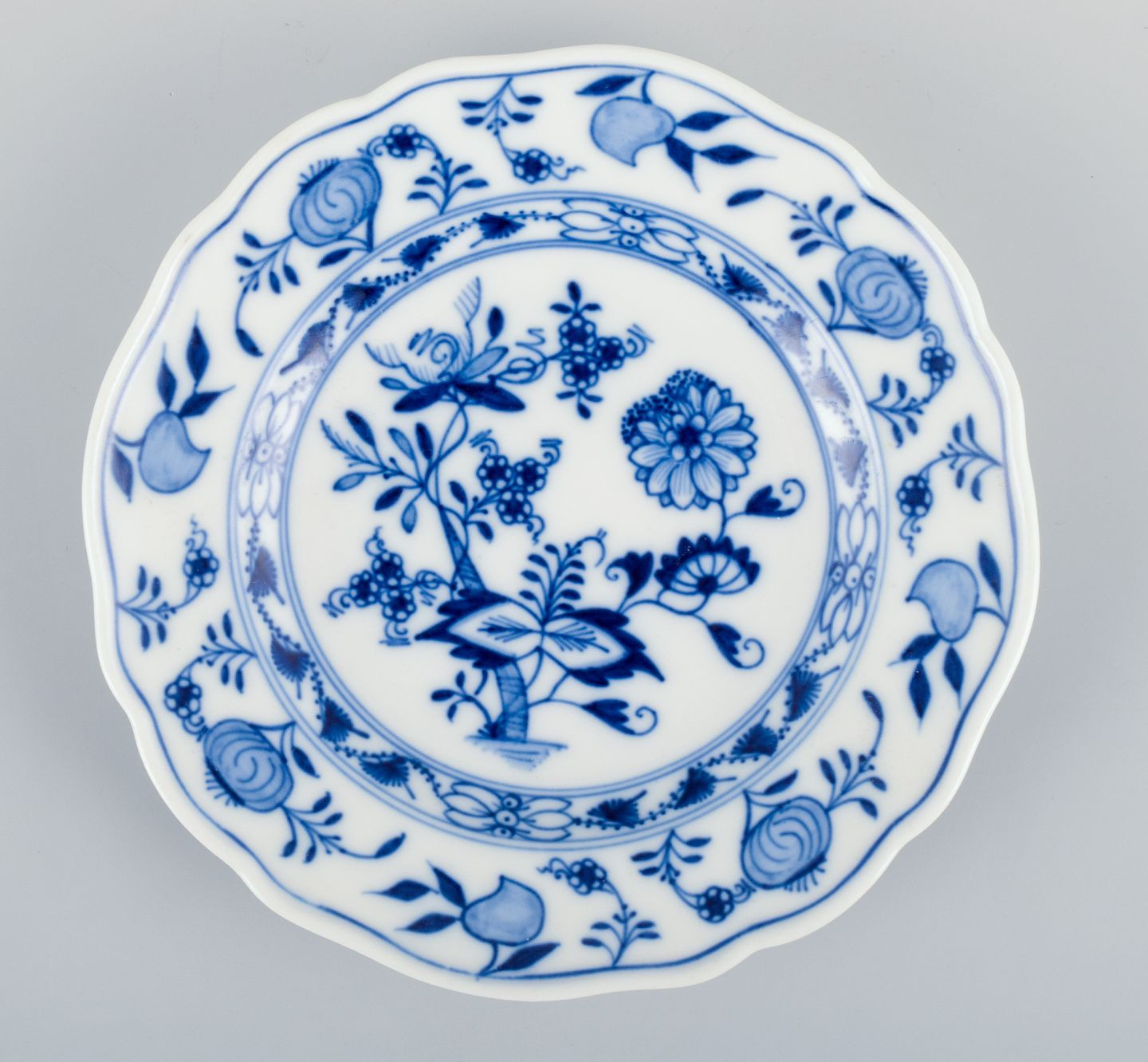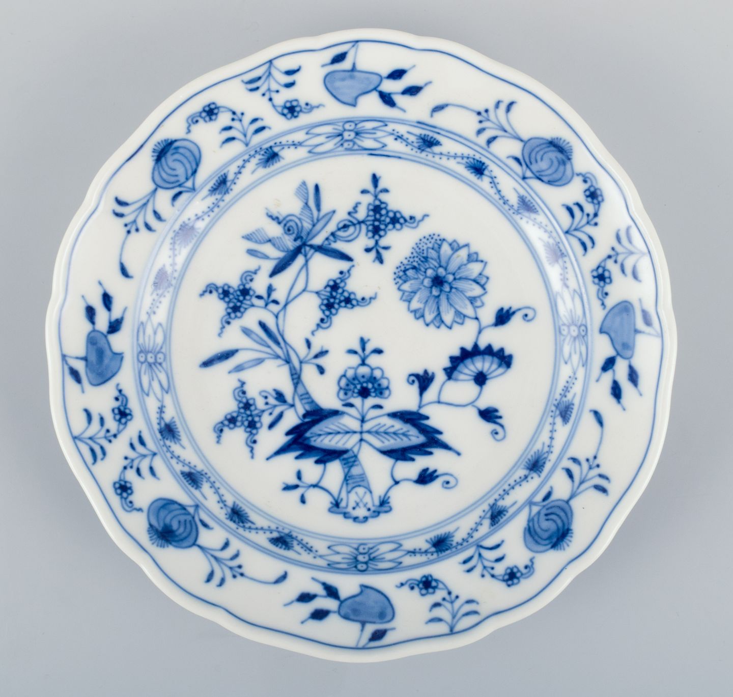 Meissen, Tyskland, tre løgmønstret tallerkner i forskellige størrelser. Håndmalet.