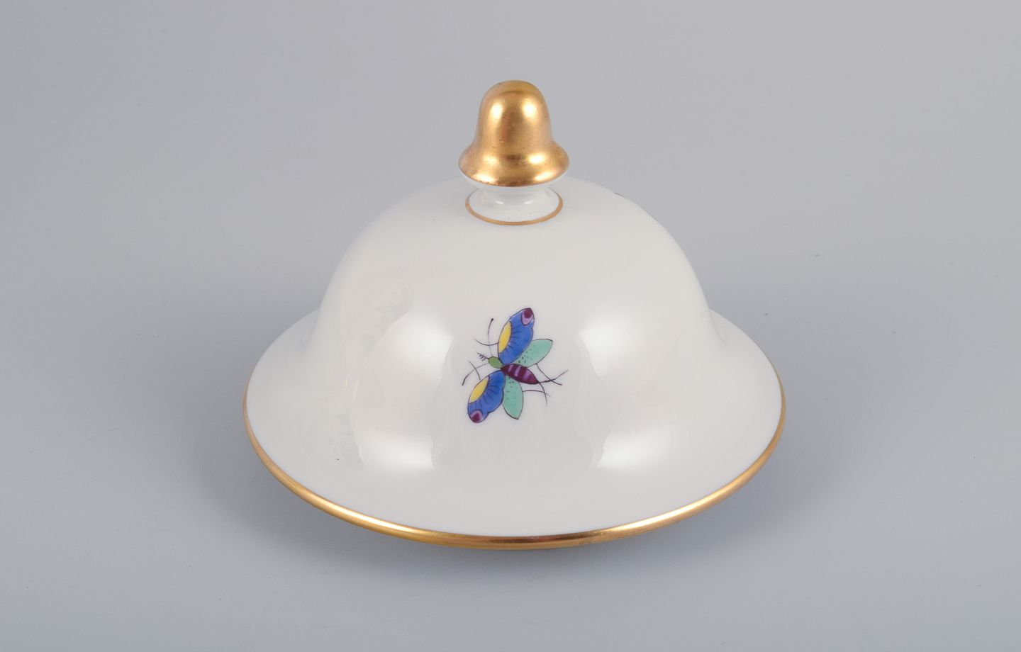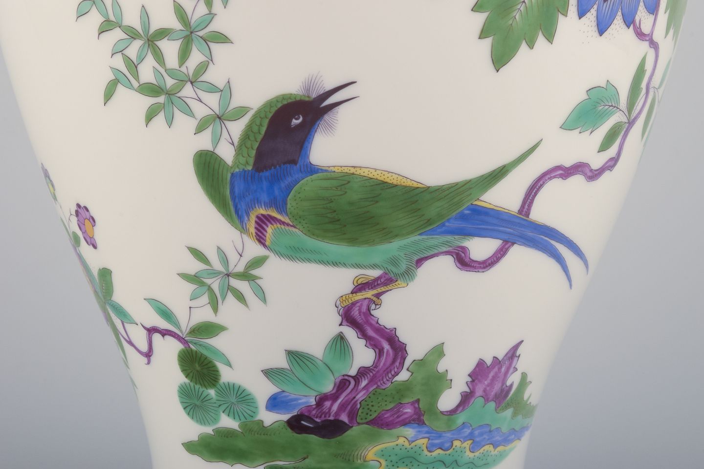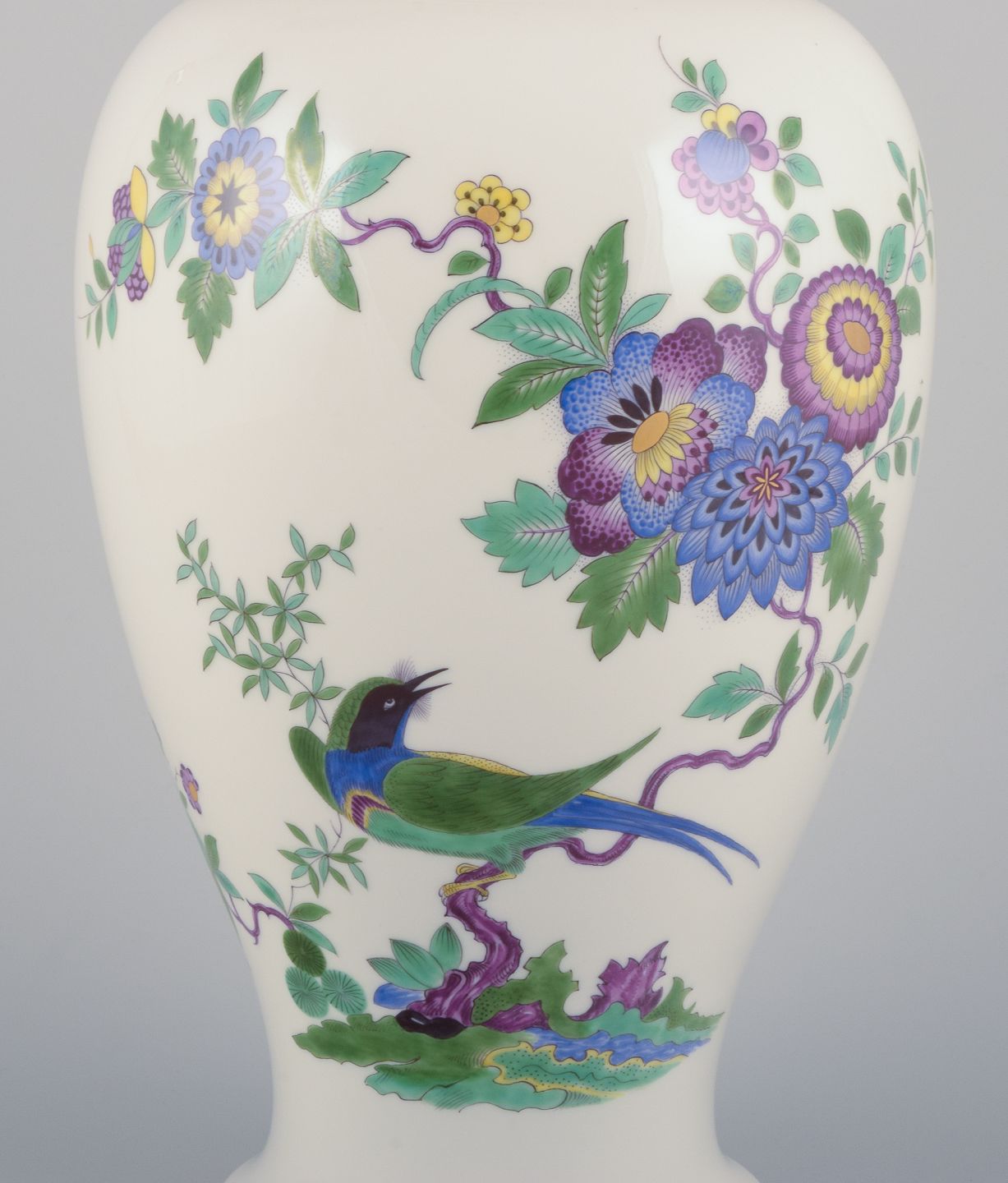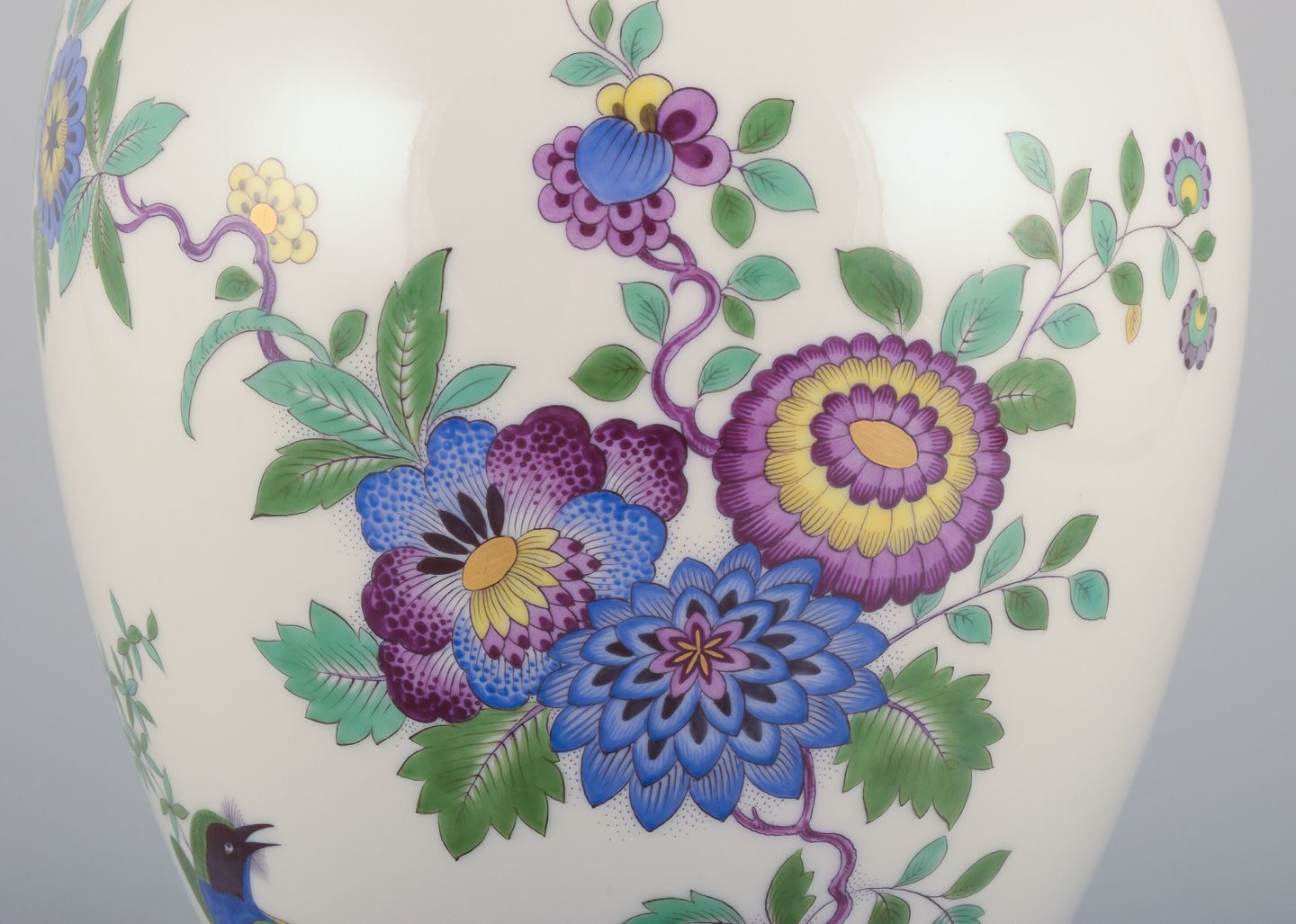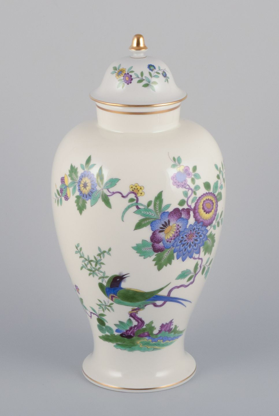 Meissen, Tyskland, stor lågkrukke i porcelæn håndmalet med eksotisk fugl og blomstermotiver.