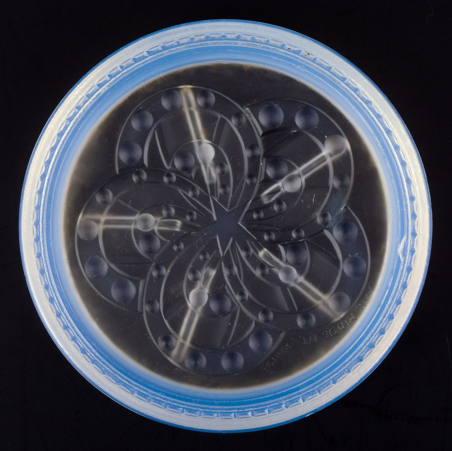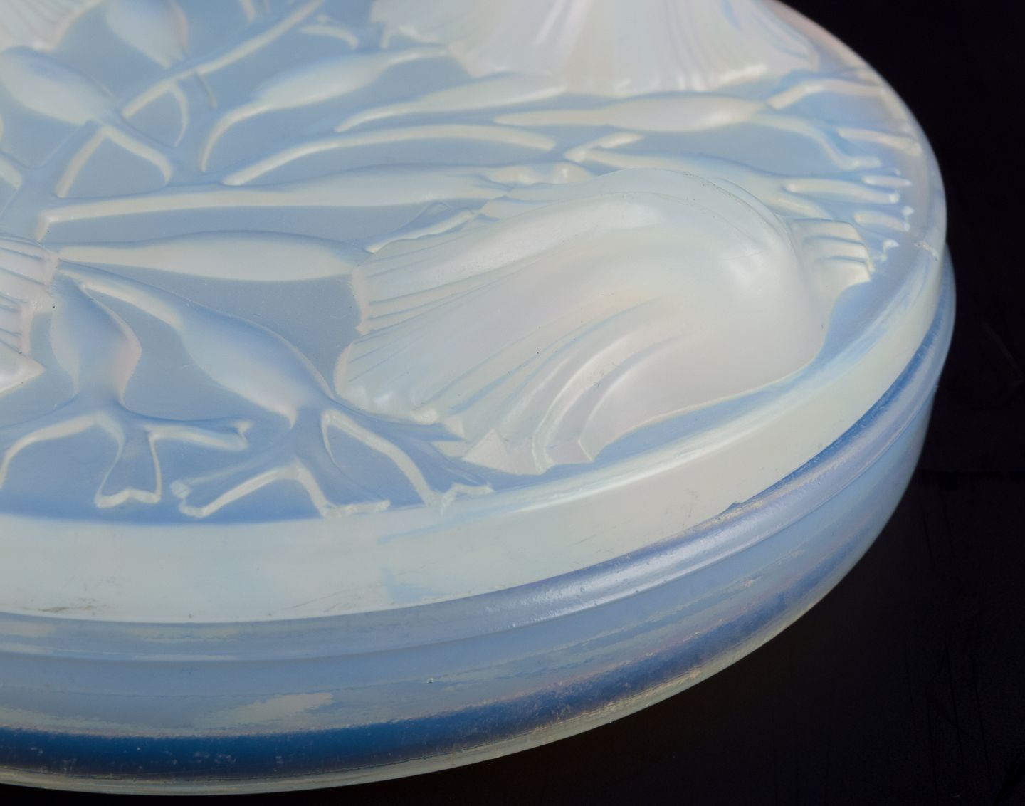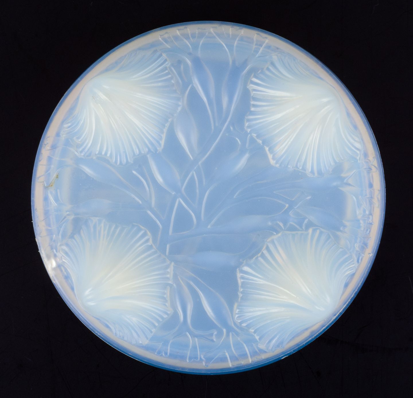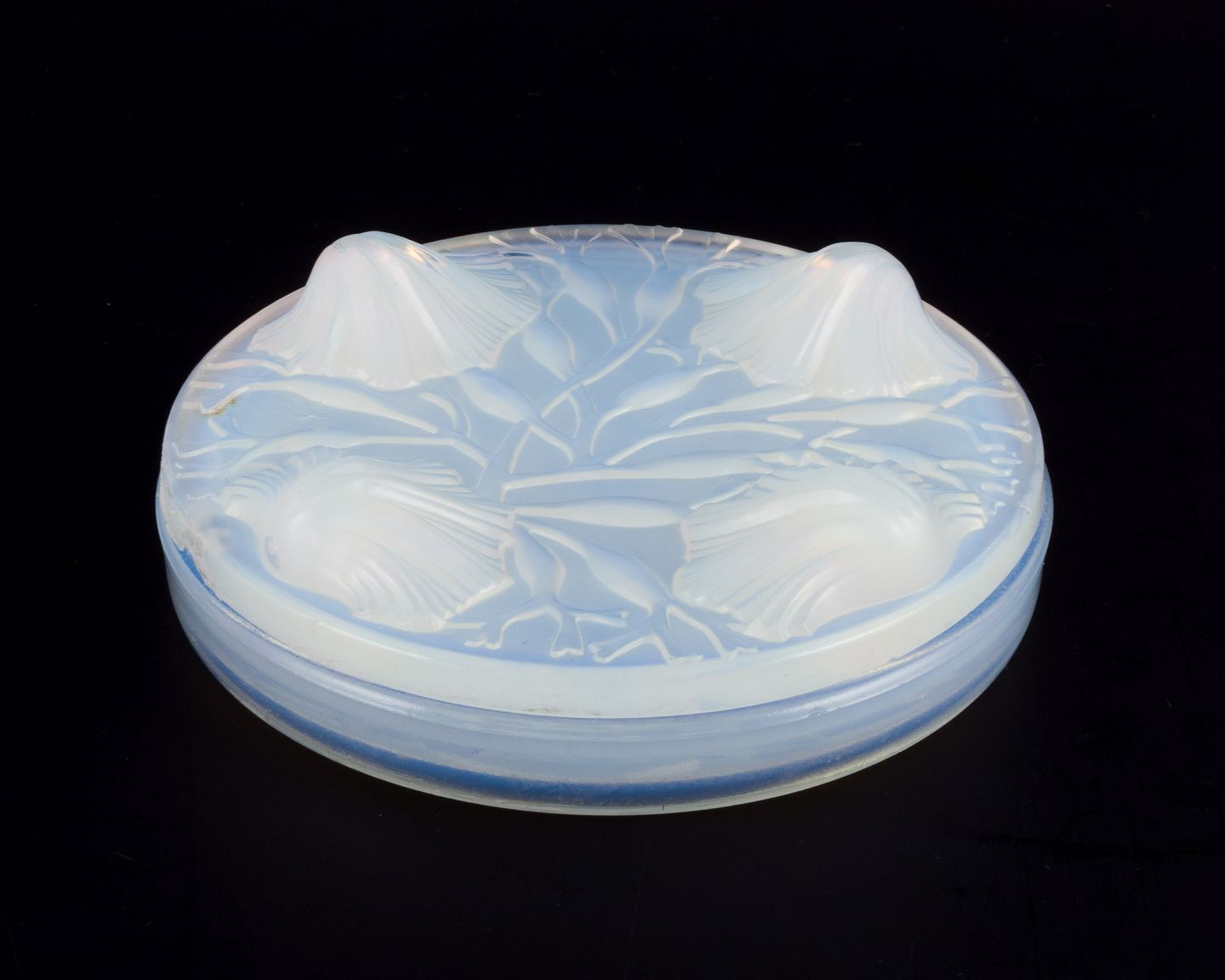 Verlys, France. A covered bowl in art glass. Art Deco opaline glass with a bluish tint.