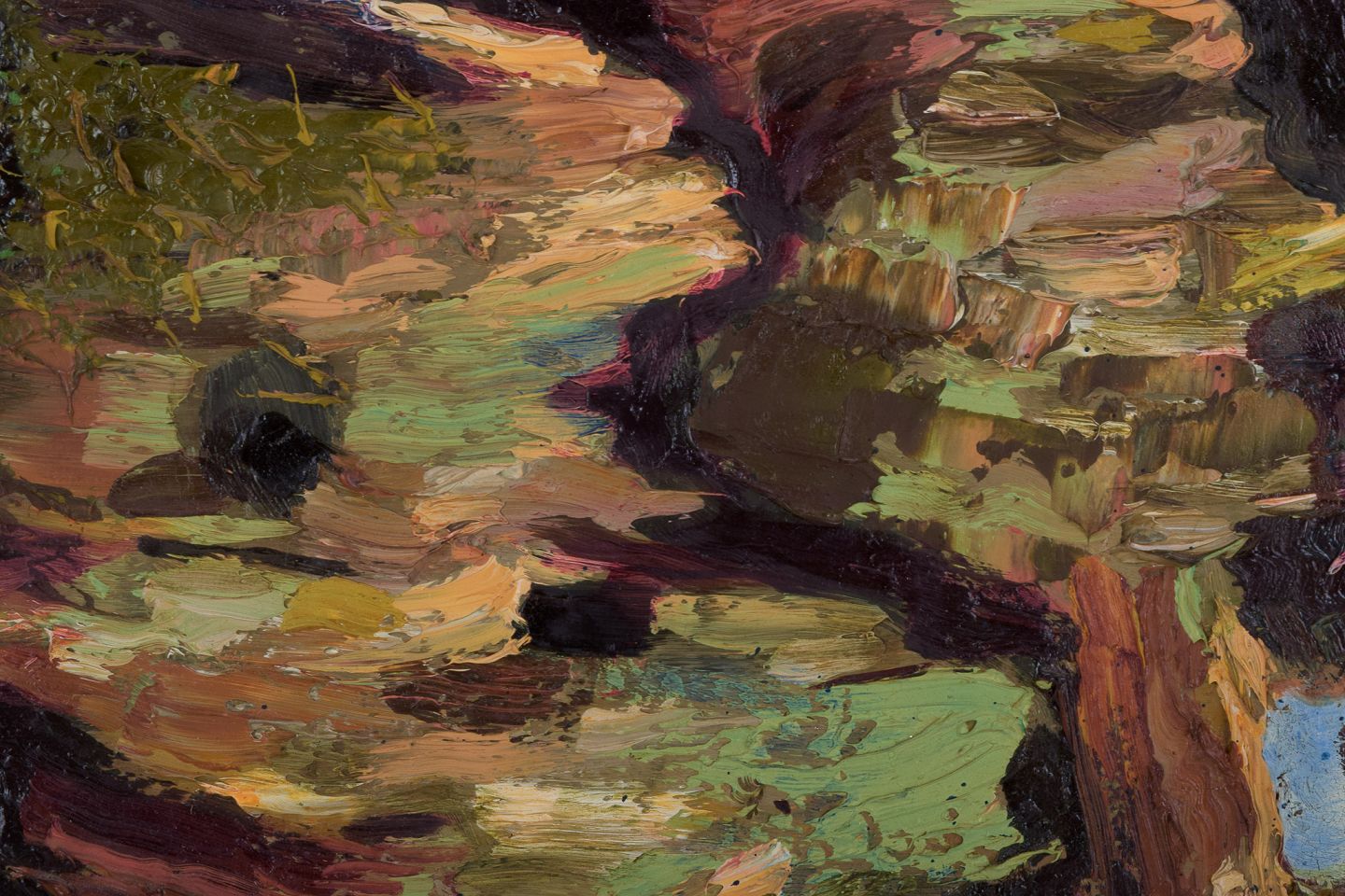 Abstrakt komposition med pastose strøg. Koloristisk palette.