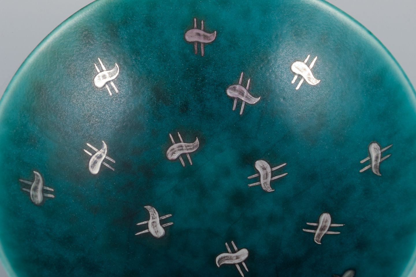 Wilhelm Kåge (1889-1960) for Gustavsberg, Sverige, lille Art Deco keramikskål i keramik med sølvdekoration. Fra Argenta serien.