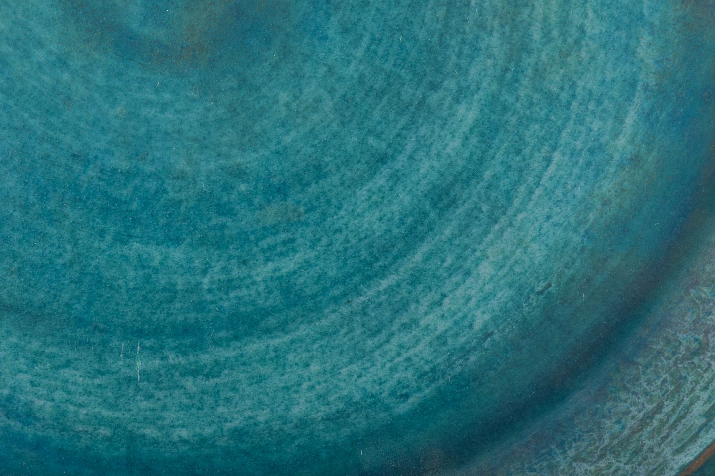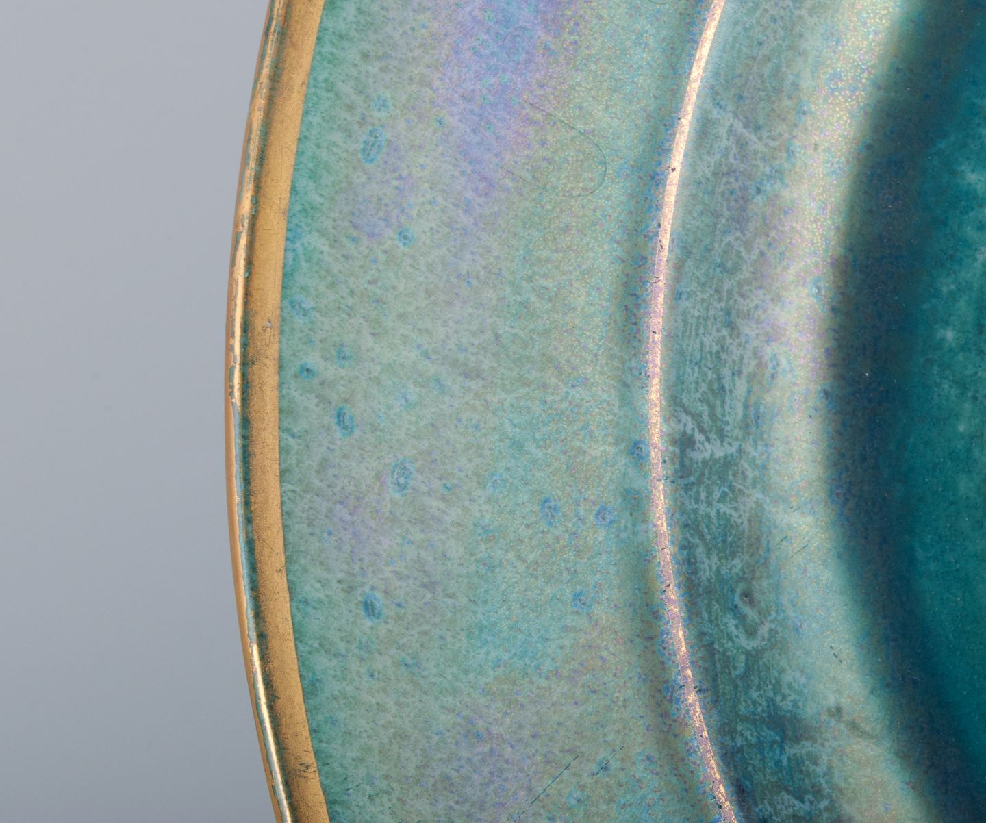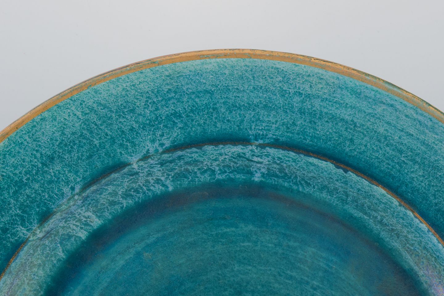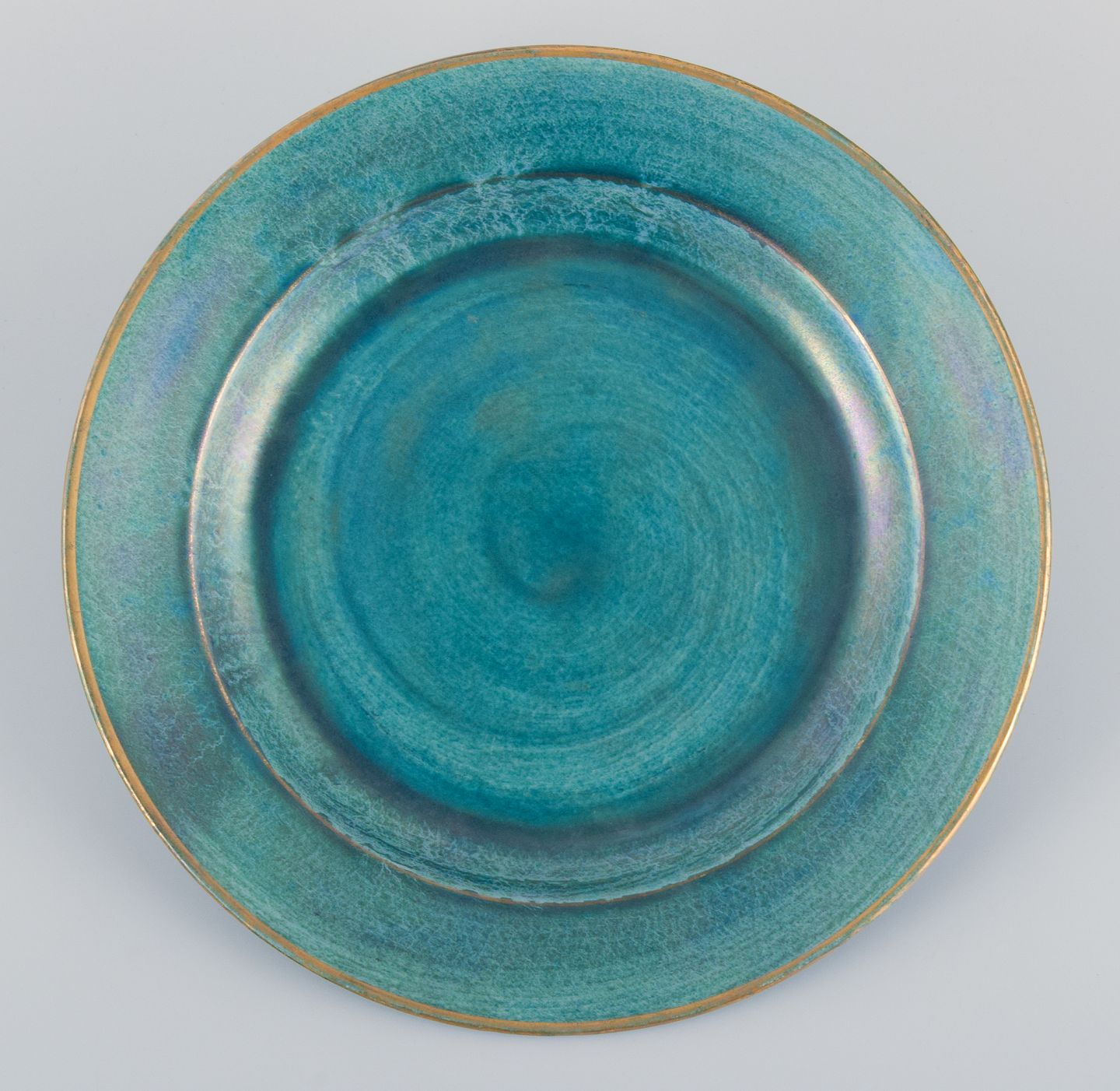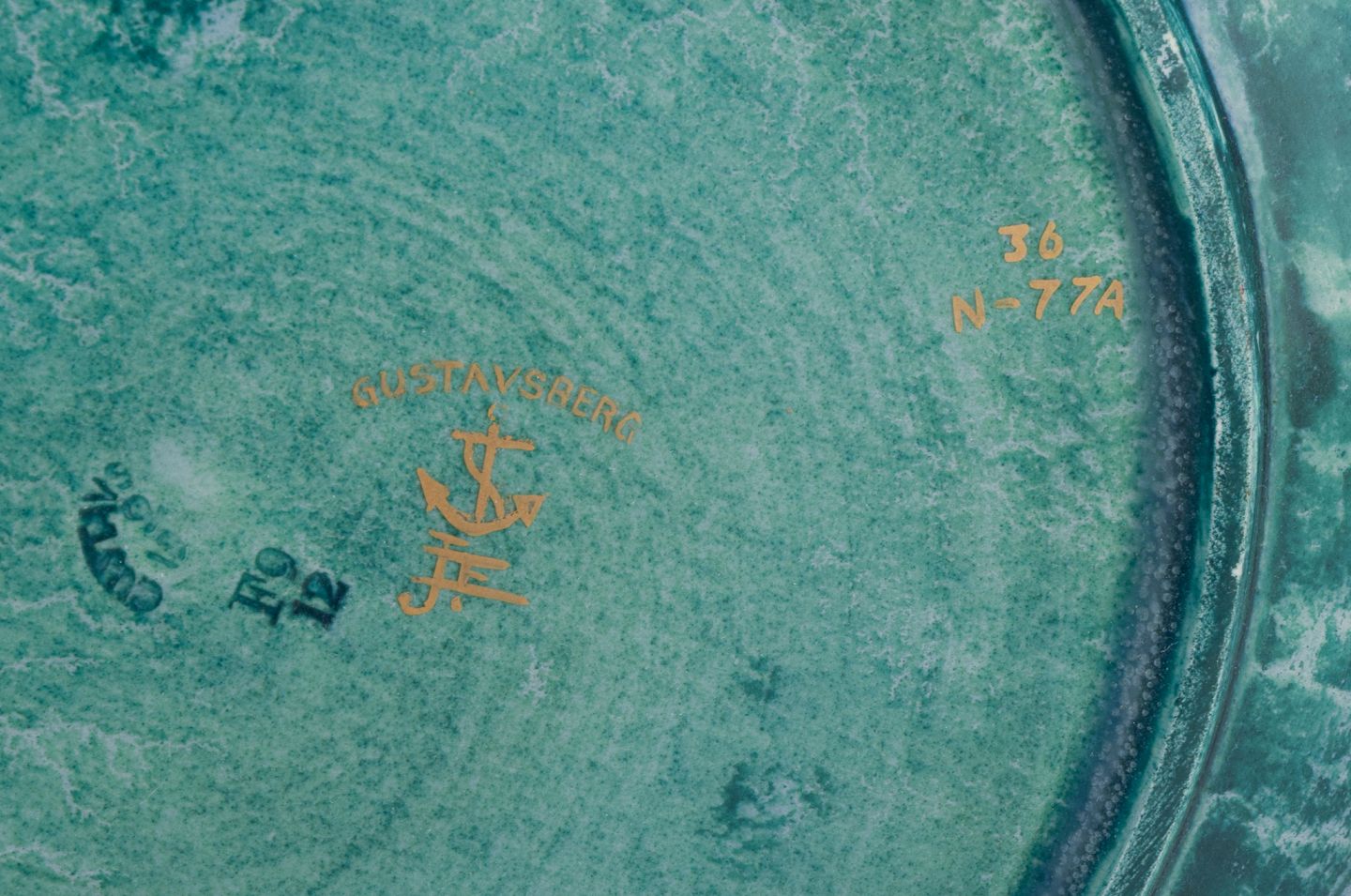 Josef Ekberg for Gustavsberg, Sverige, stort rundt fad i keramik med glasur i grønlige toner. Guldkant.