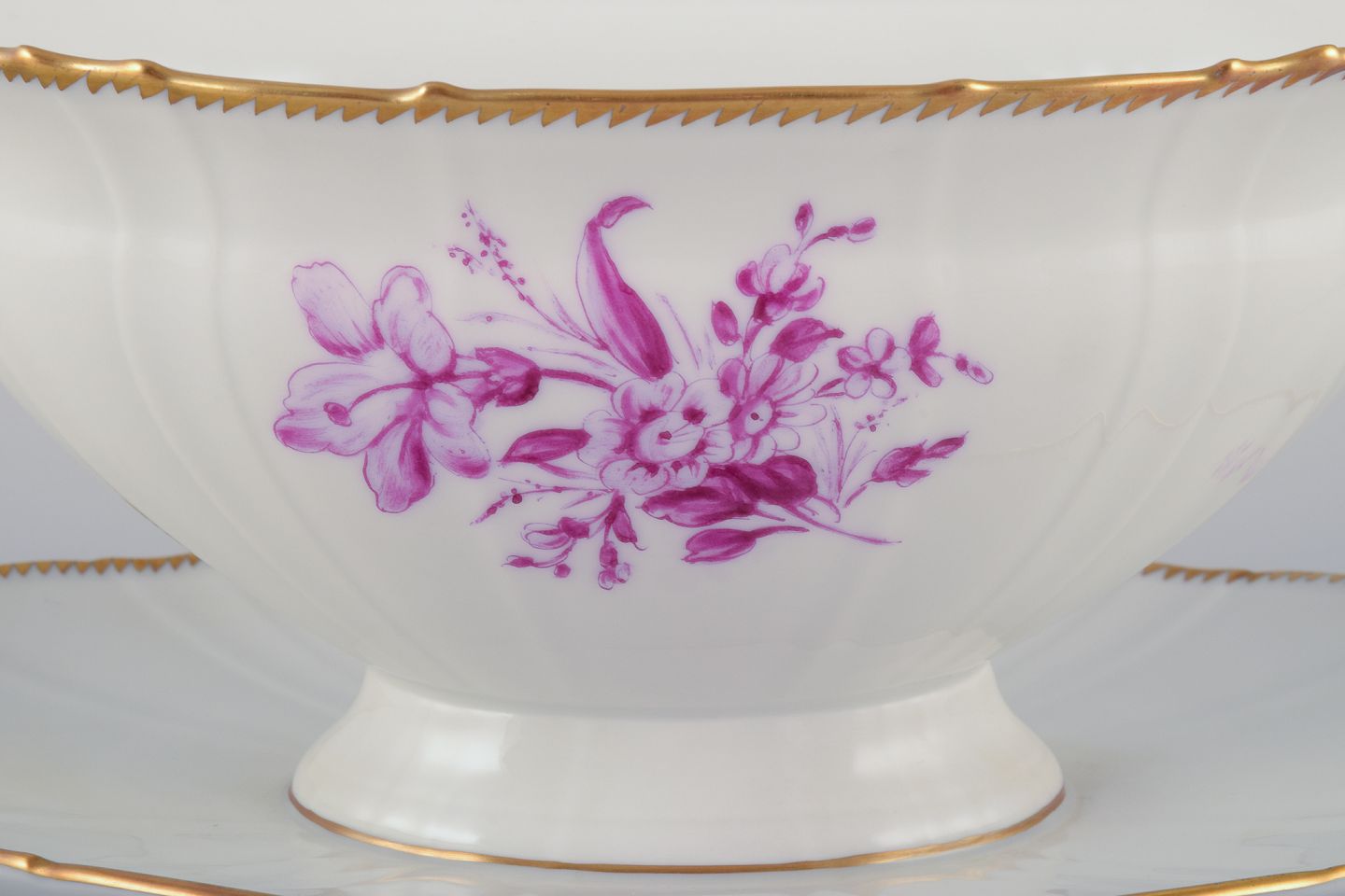 Bing & Grøndahl, Danmark. Håndmalet sauceskål med blomsterdekorationer i purpur samt guldkant.