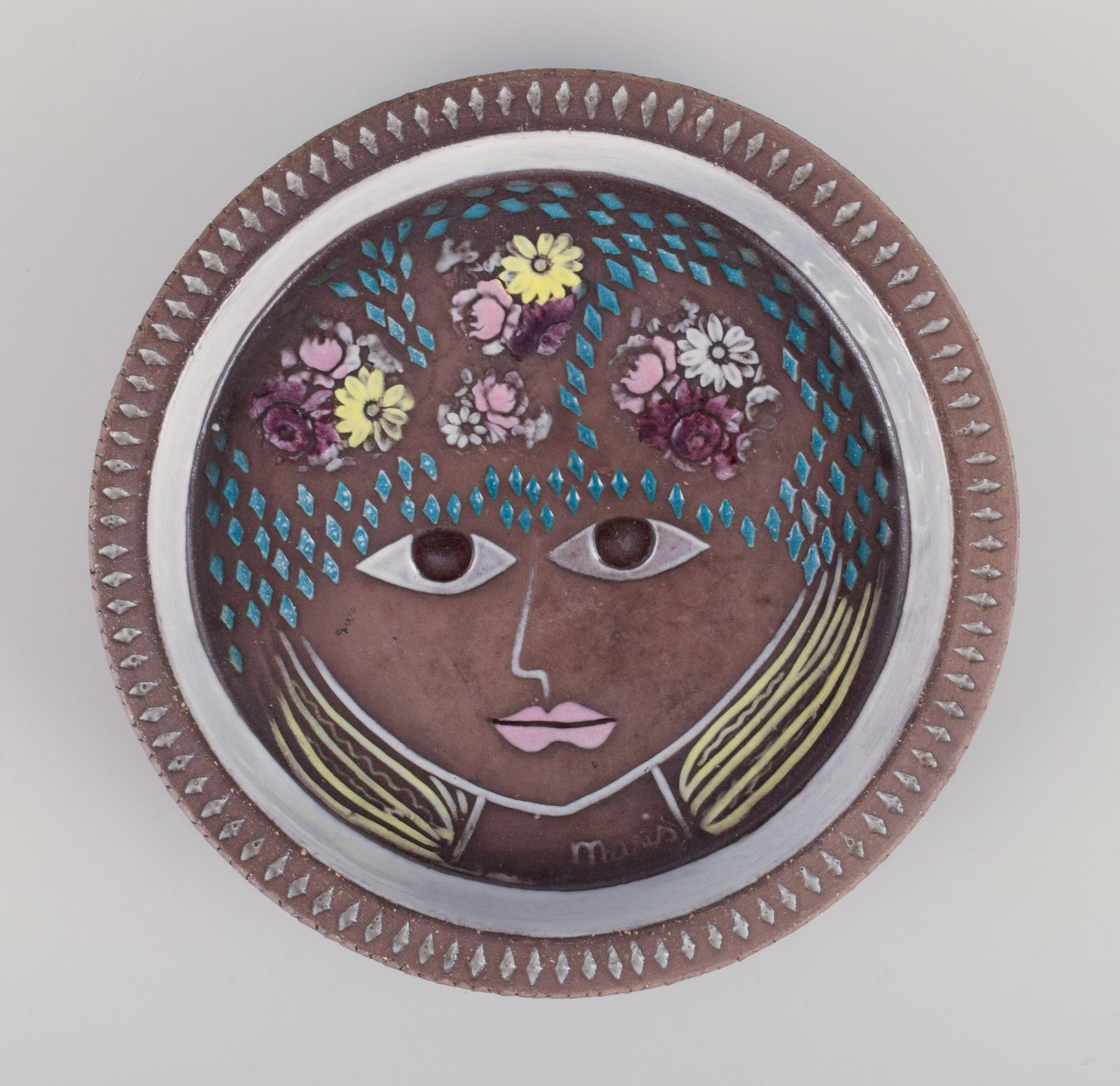Rund keramikskål med motiv af kvindeansigt og blomster.