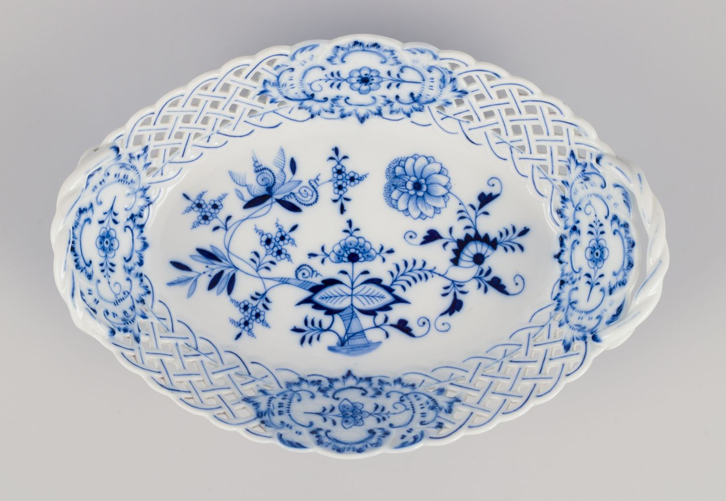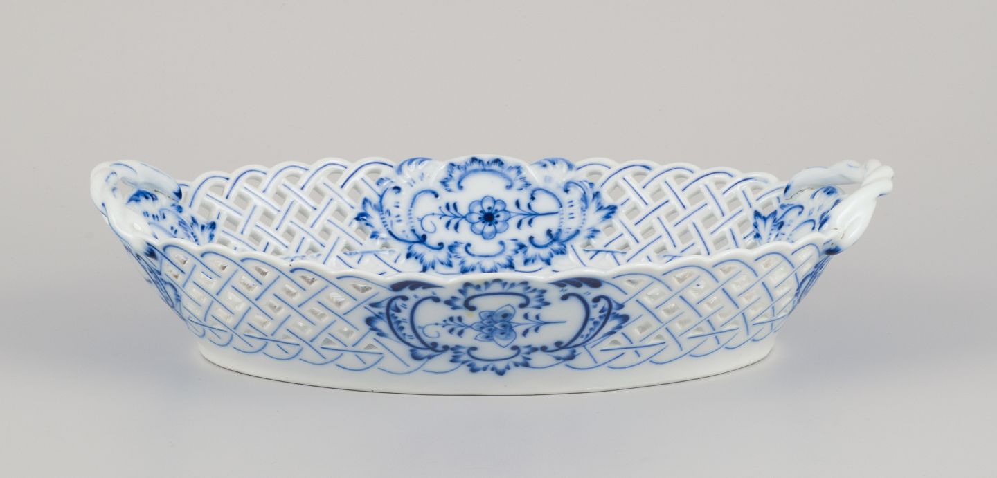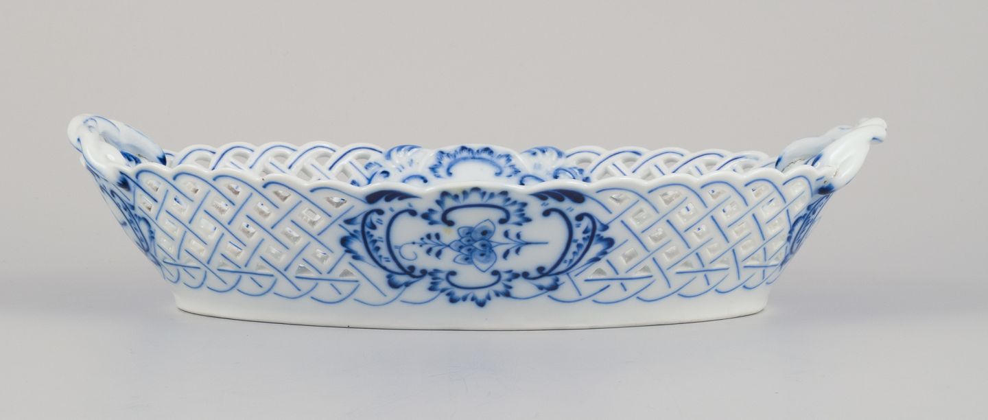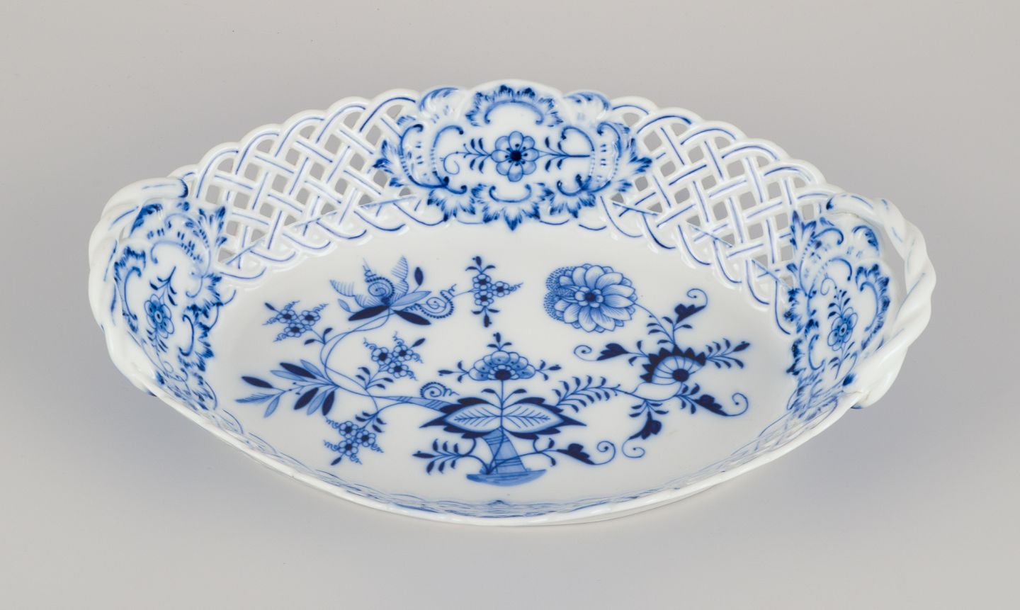 Stadt Meissen, Tyskland. Gennembrudt Løgmønstret skål i håndmalet porcelæn. Ca. 1930’erne. Stemplet. I flot stand med mindre brugspræg. Mål: L 28,5 cm. x B 20,0 cm. x H 5,2 cm.