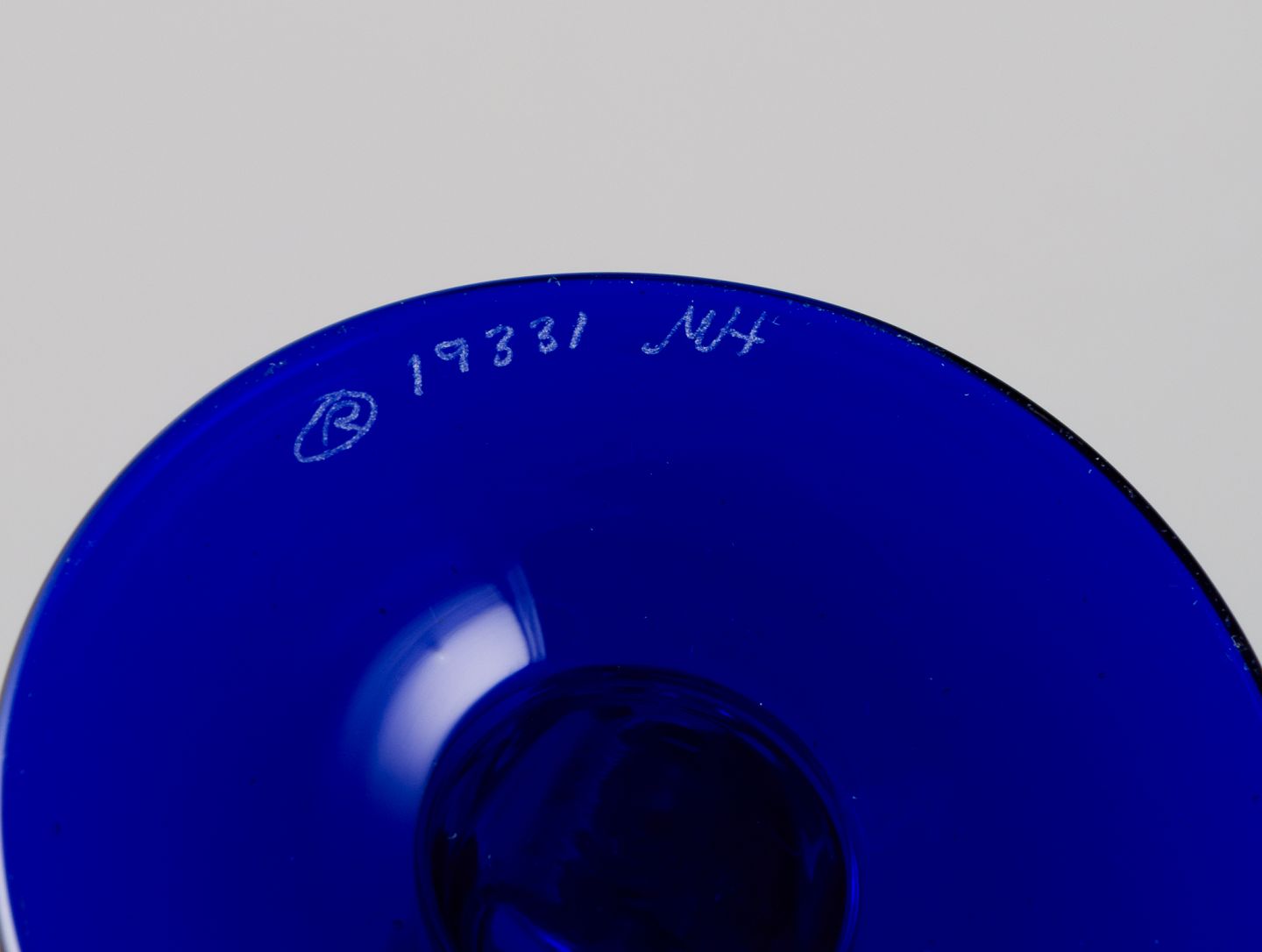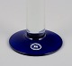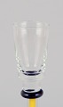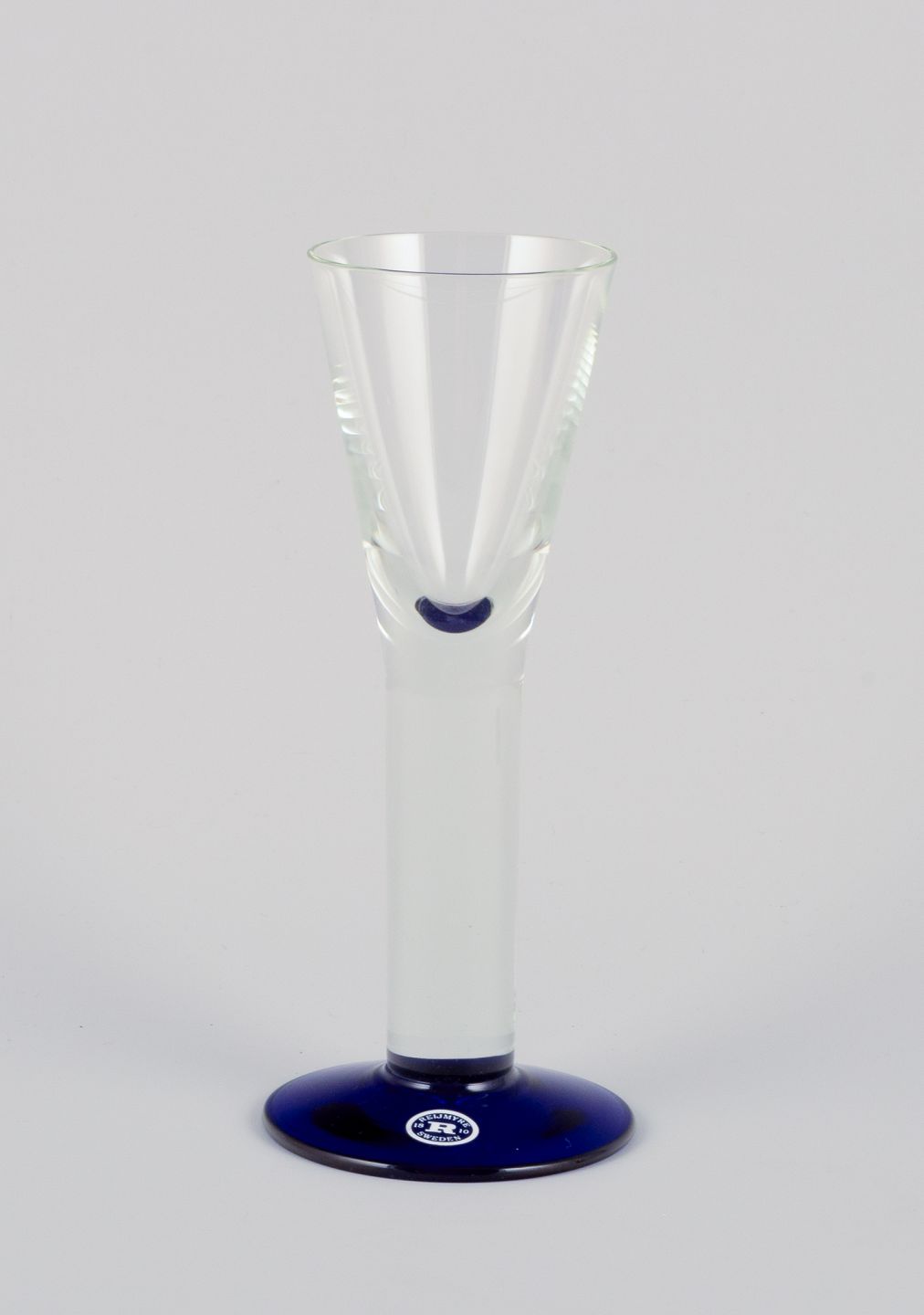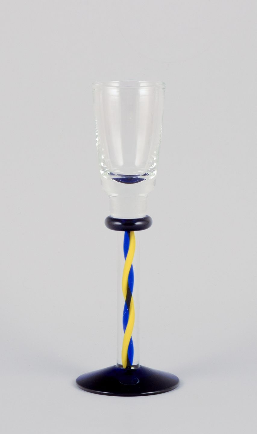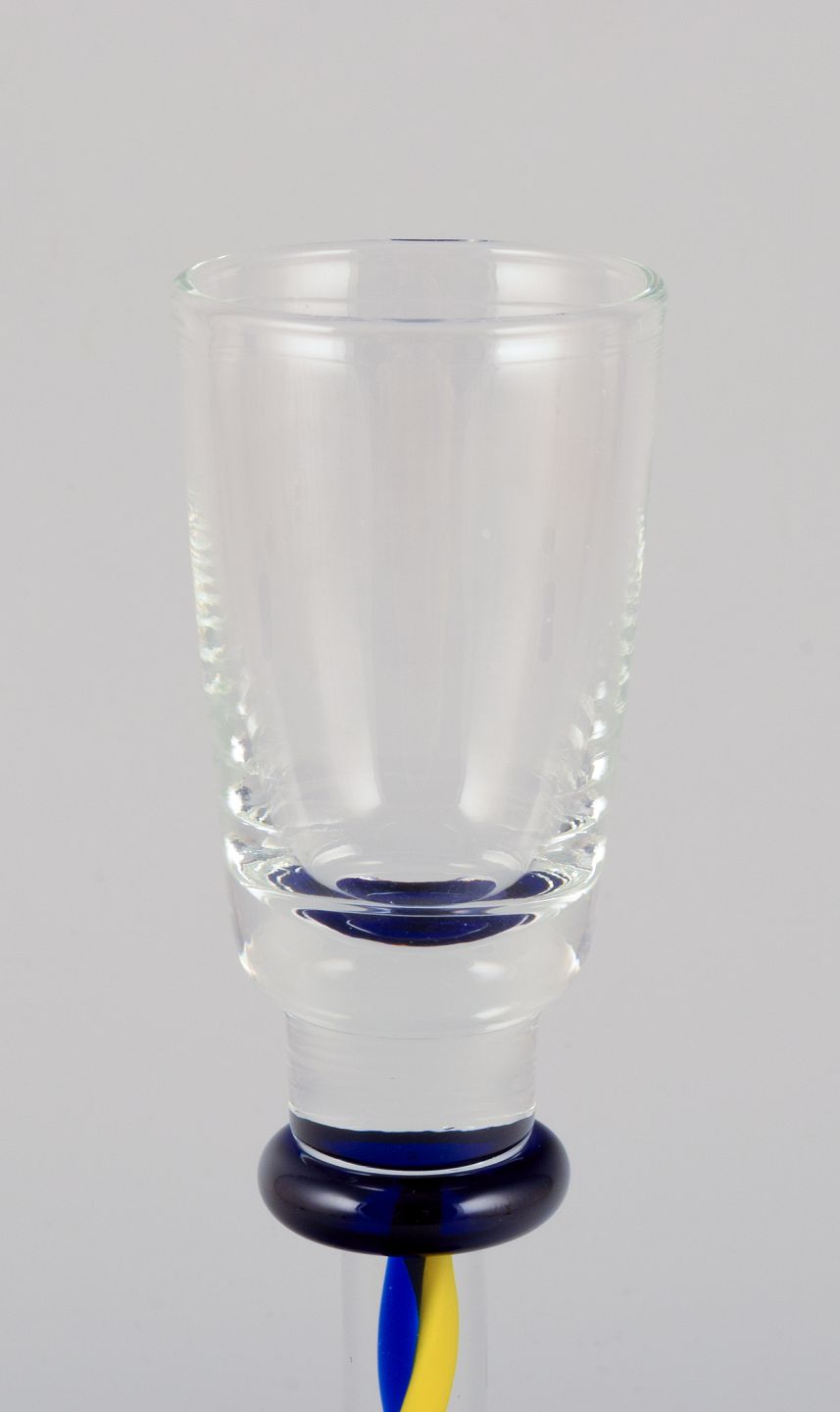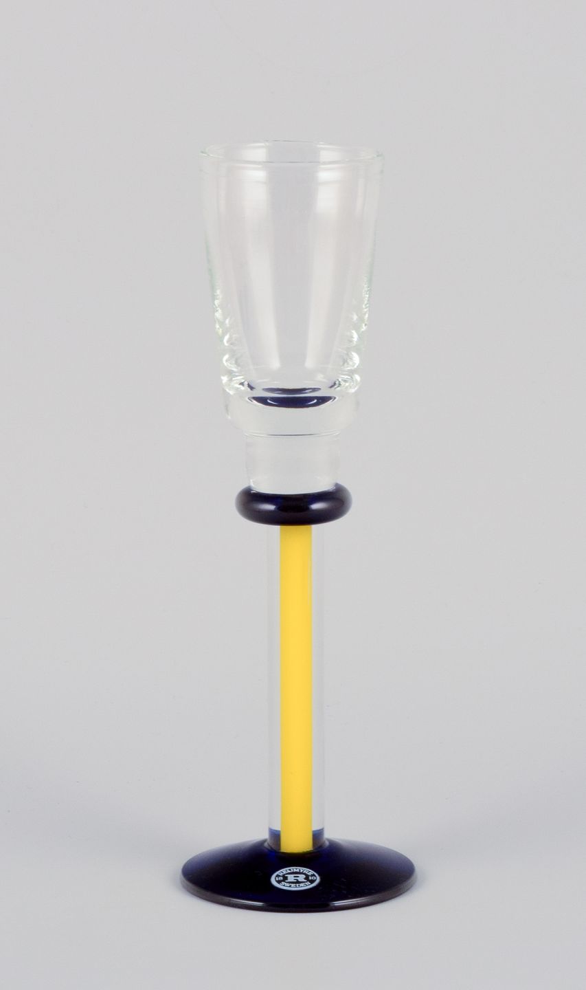 Margareta Hennix for Reijmyre, Sverige. Et sæt på fire snapseglas. Håndlavet og mundblæst kunstglas. Blå, gult og klart glas.