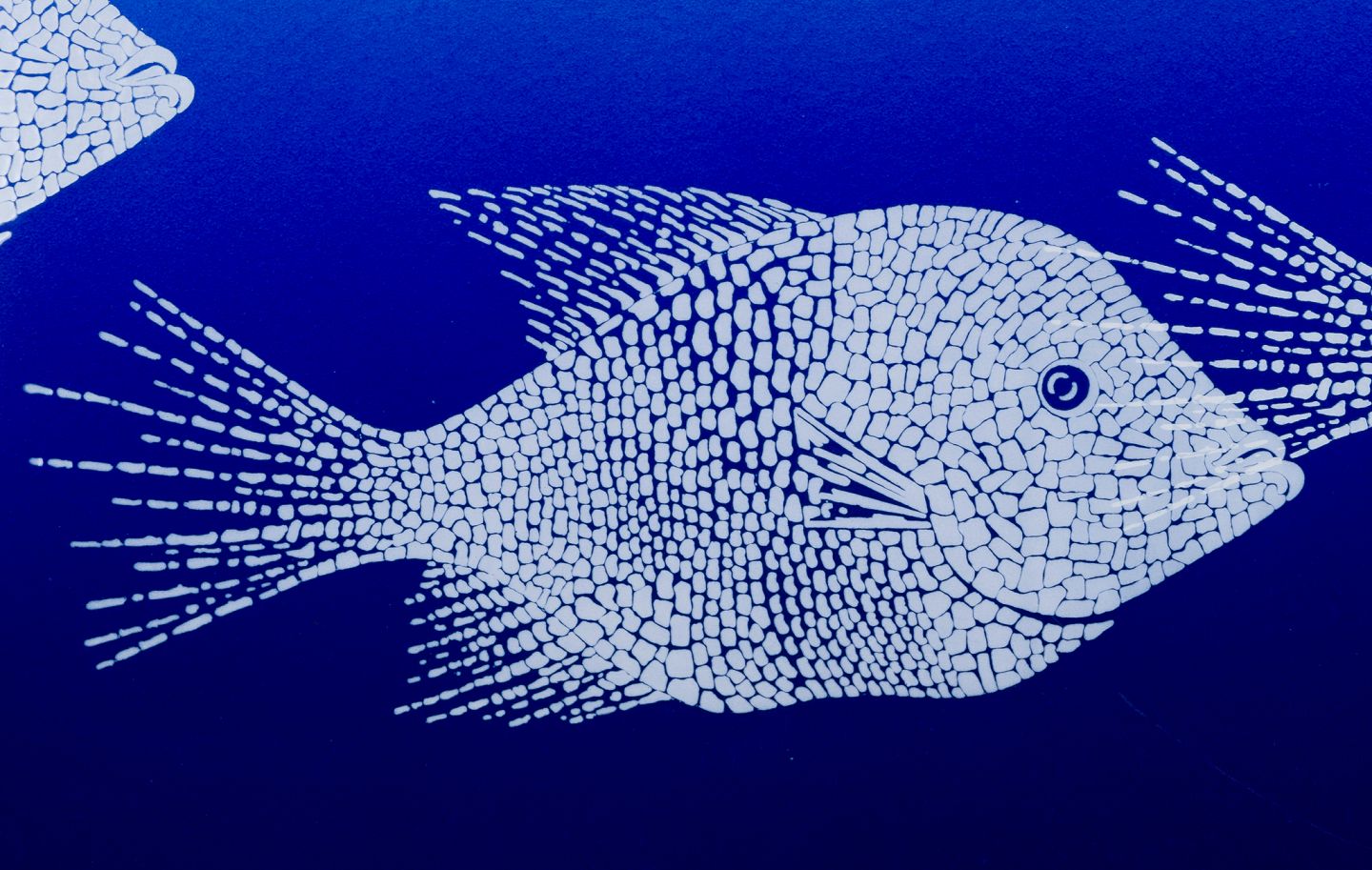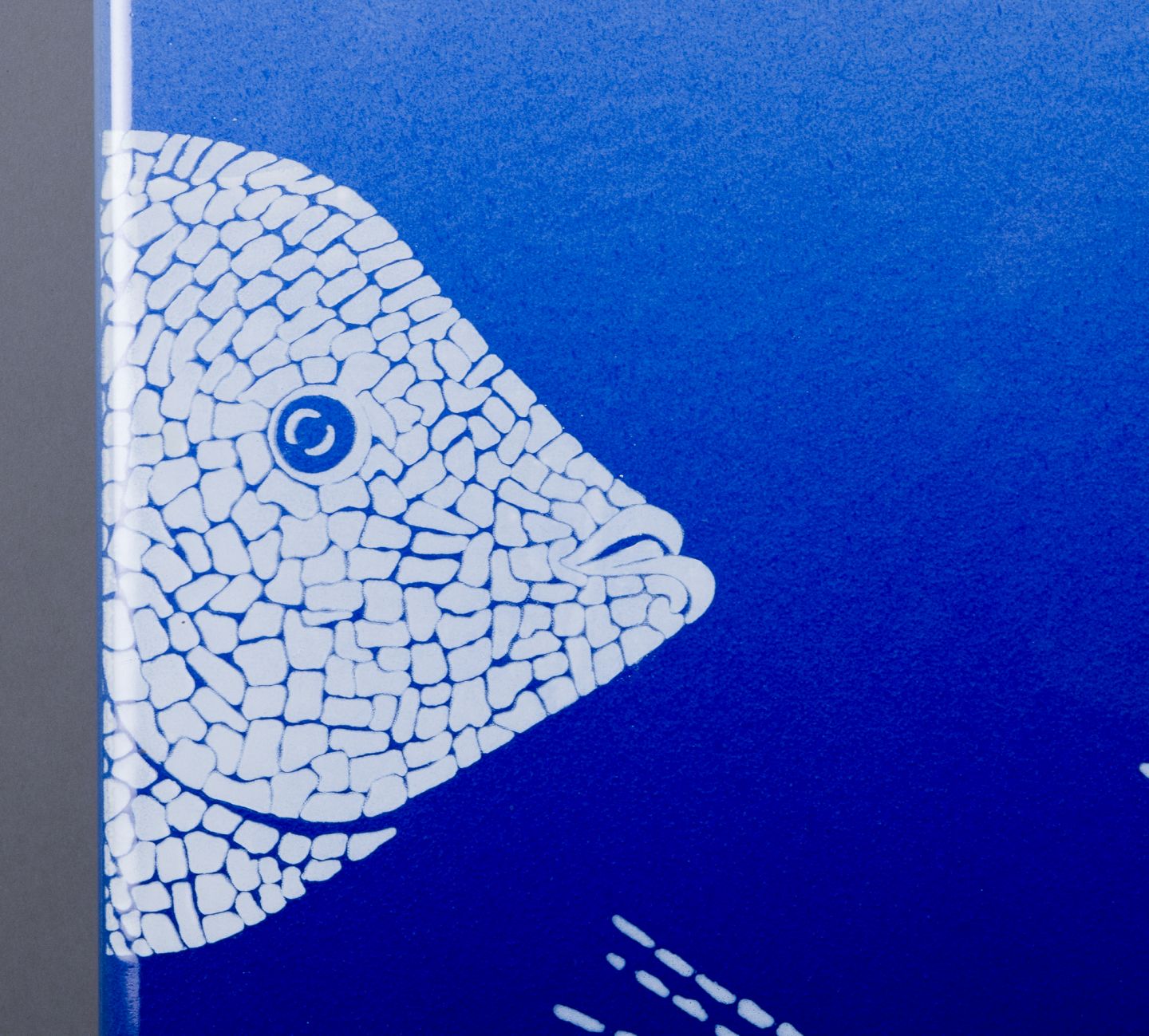 Gustavsberg, stort og sjældent emaljeskilt med motiv af svømmende fisk.