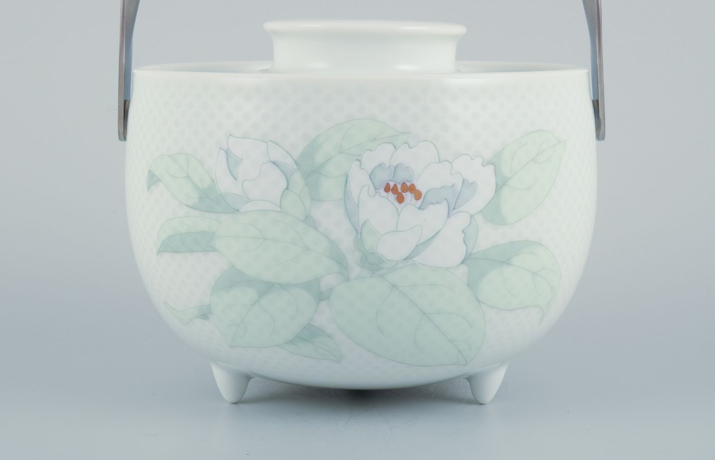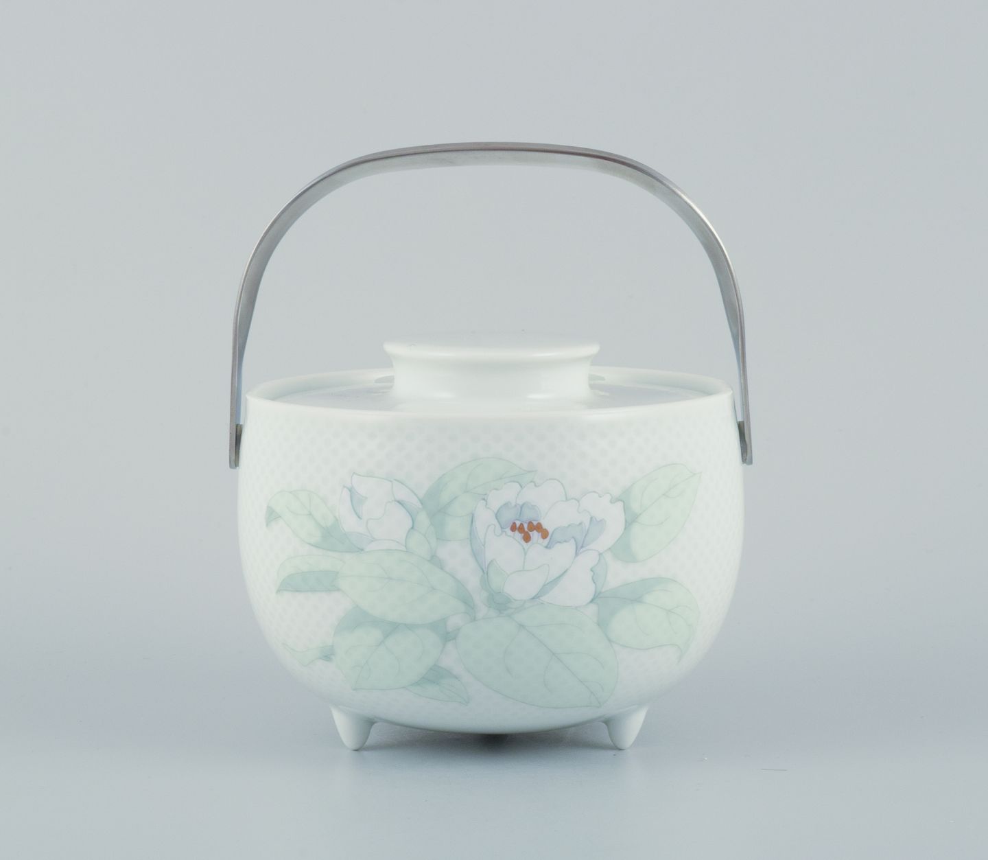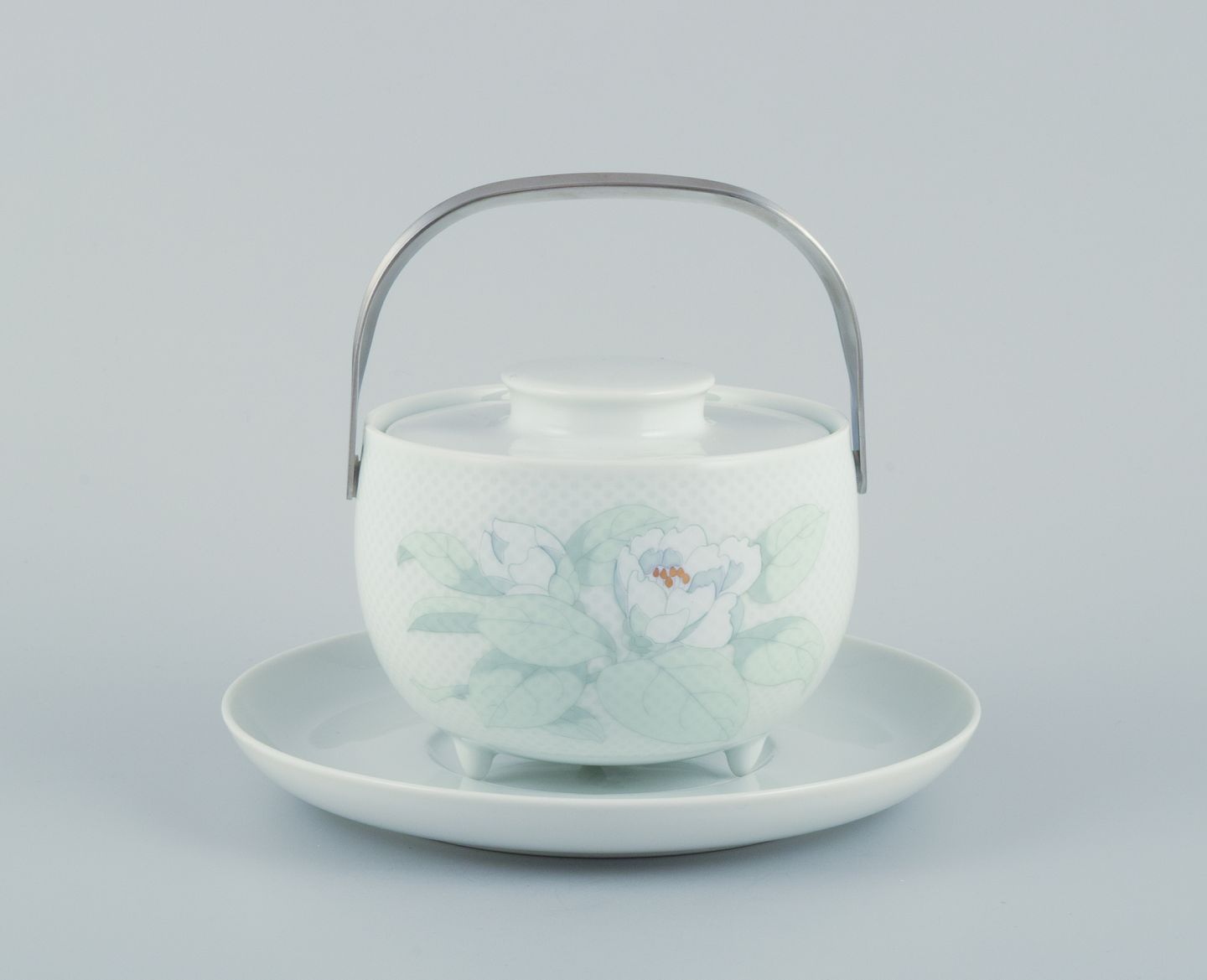 Tapio Wirkkala (1915-1985) for Rosenthal Studio-linie, "Century Blütentraum". Sauceskål på tre fødder med tilhørende undertallerken dekoreret med blomstermotiv. Hank i rustfrit stål.