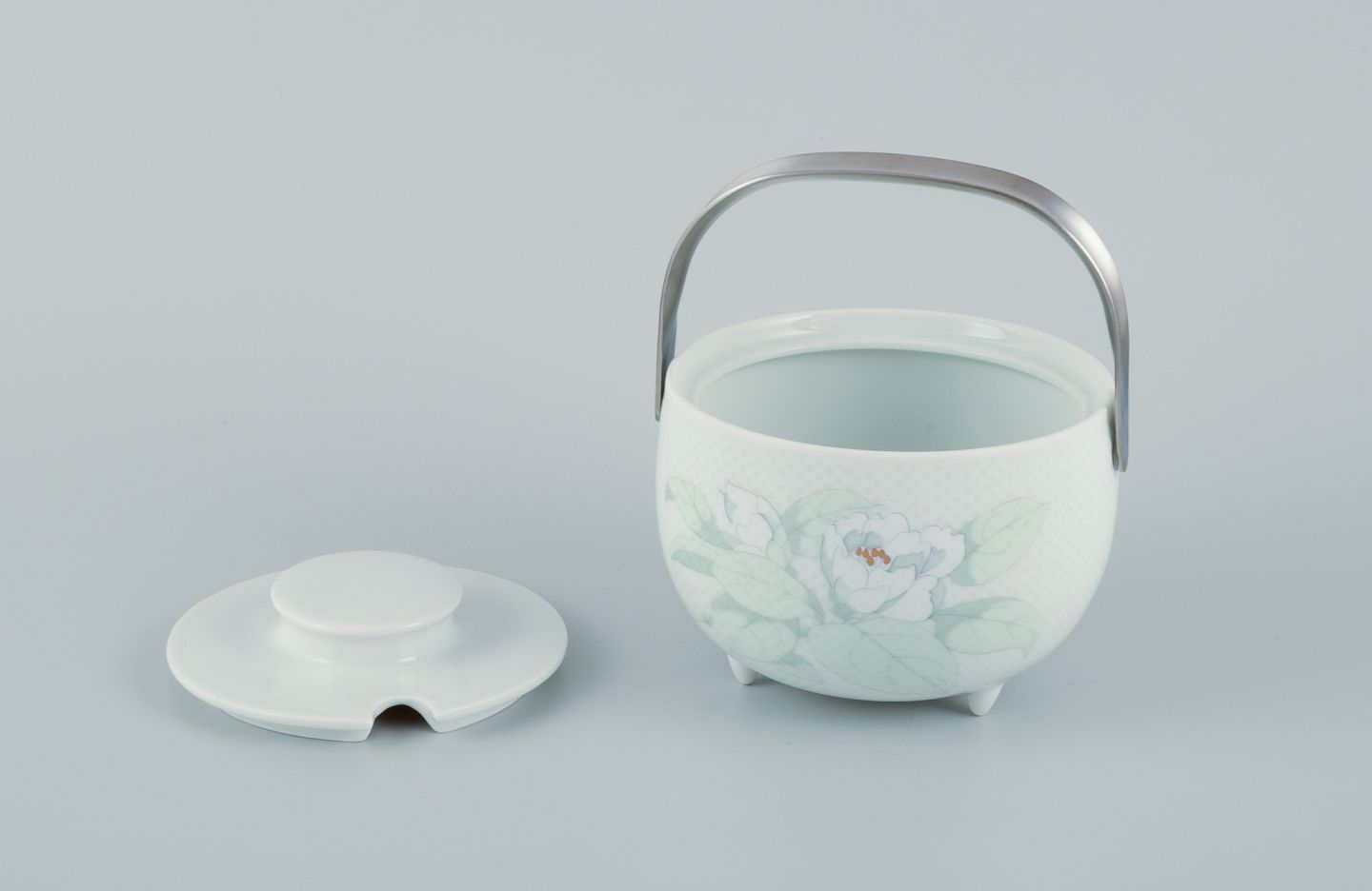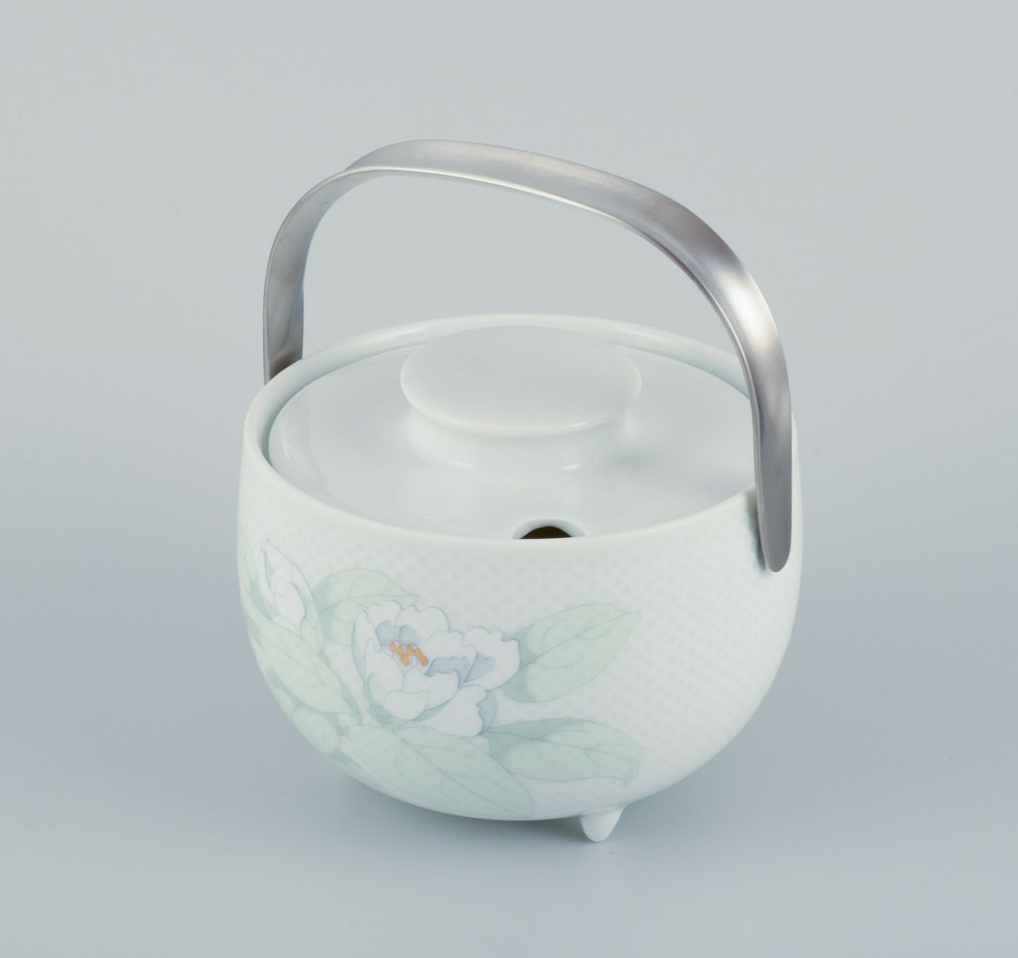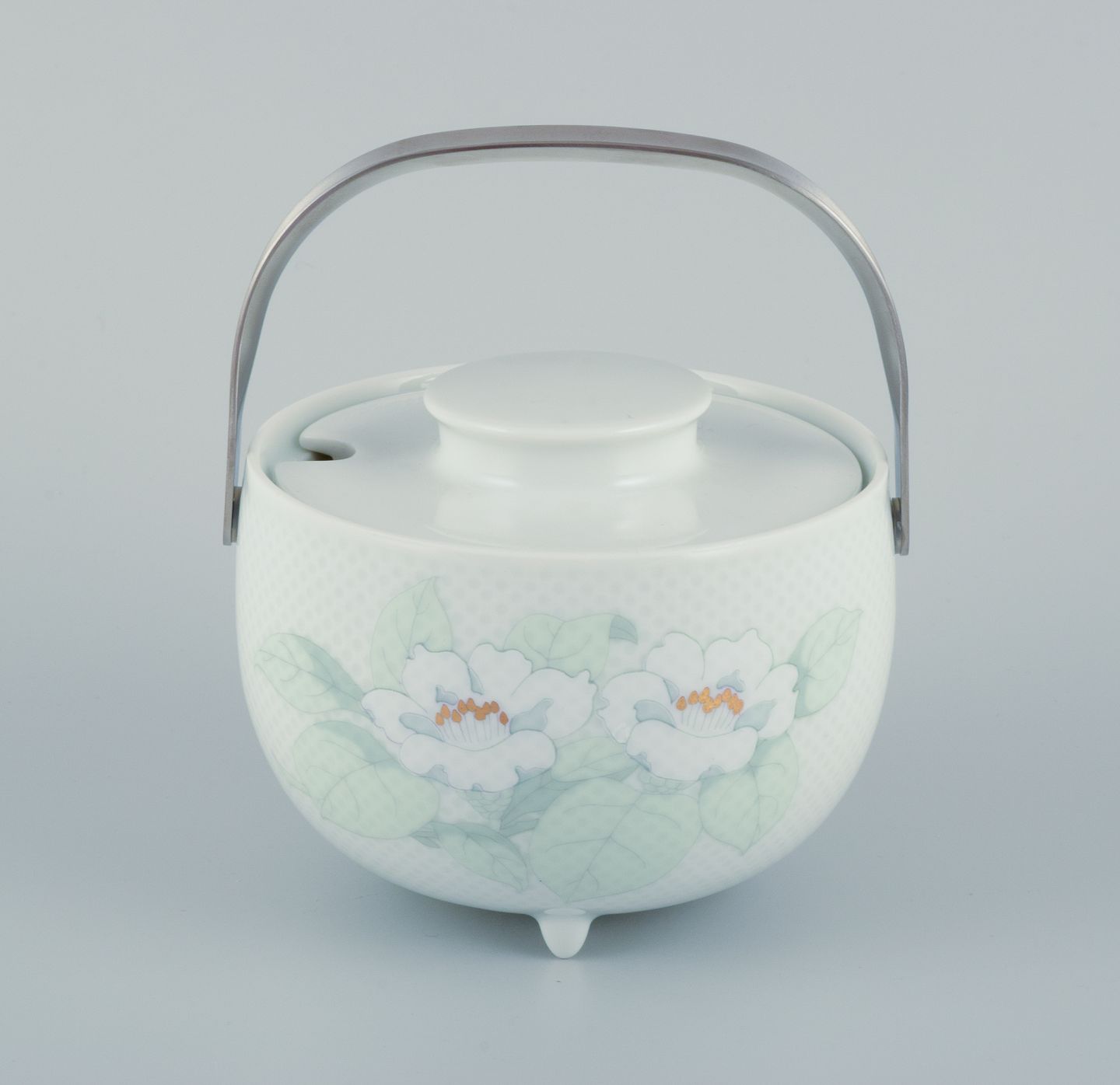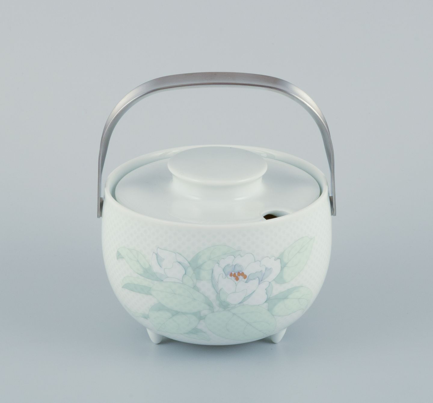 Tapio Wirkkala (1915-1985) for Rosenthal Studio-linie, "Century Blütentraum". Sauceskål på tre fødder med tilhørende undertallerken dekoreret med blomstermotiv. Hank i rustfrit stål.