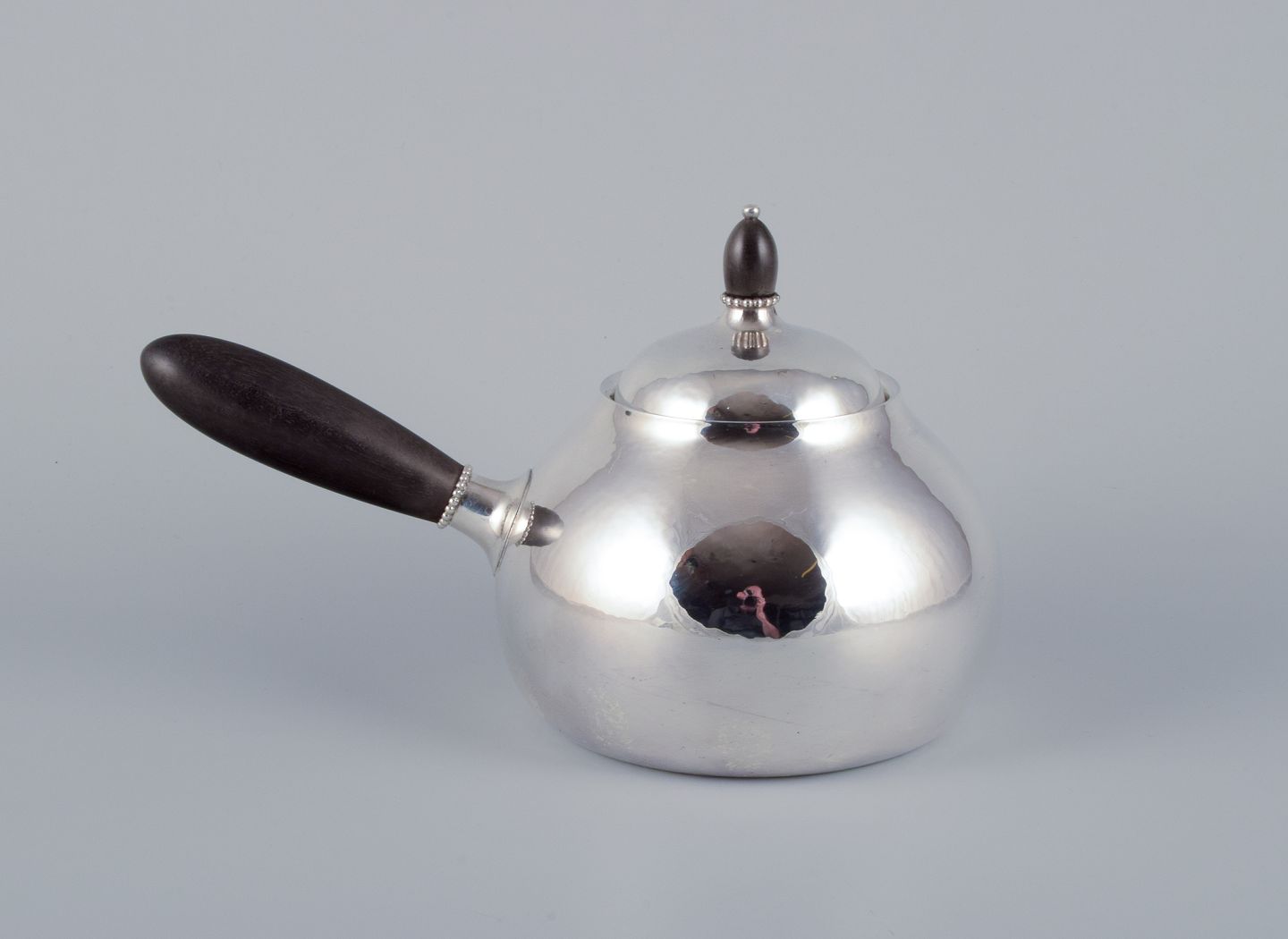 Georg Jensen tekande i sterlingsølv med hank og lågknop i ibenholt. Model 80A. Perfekt stand. Stemplet efter 1944. Mål: L 21,5 cm. inklusive hank x H 13,0 cm. inklusive låg.