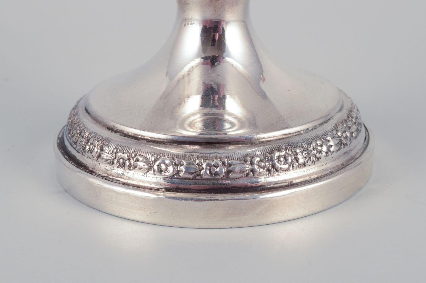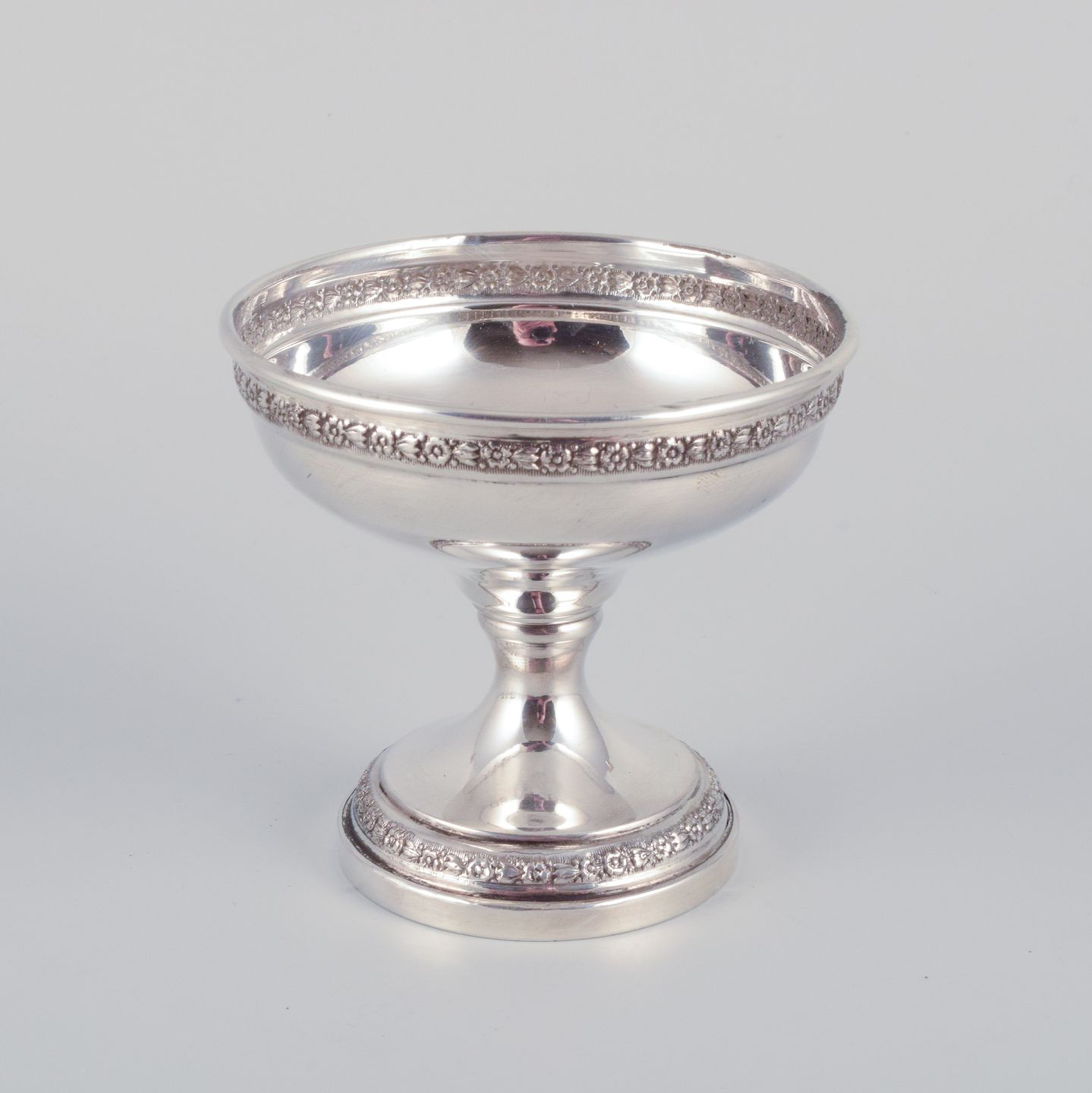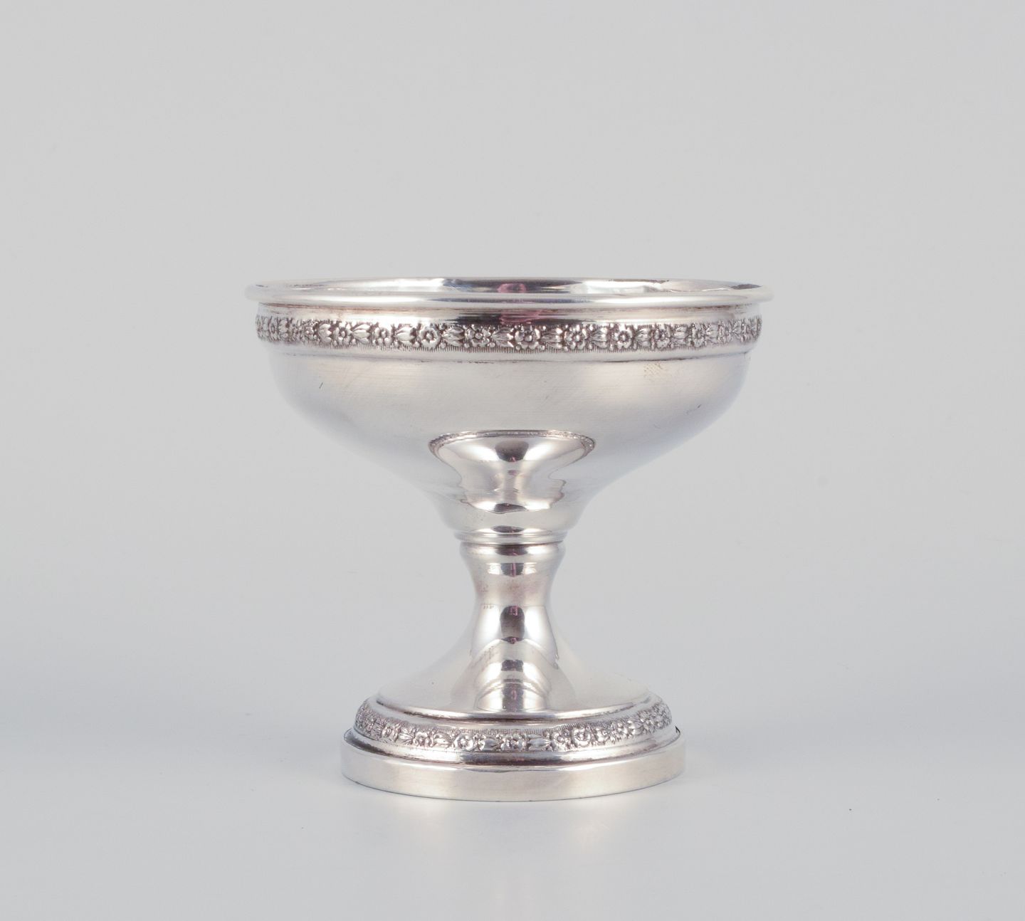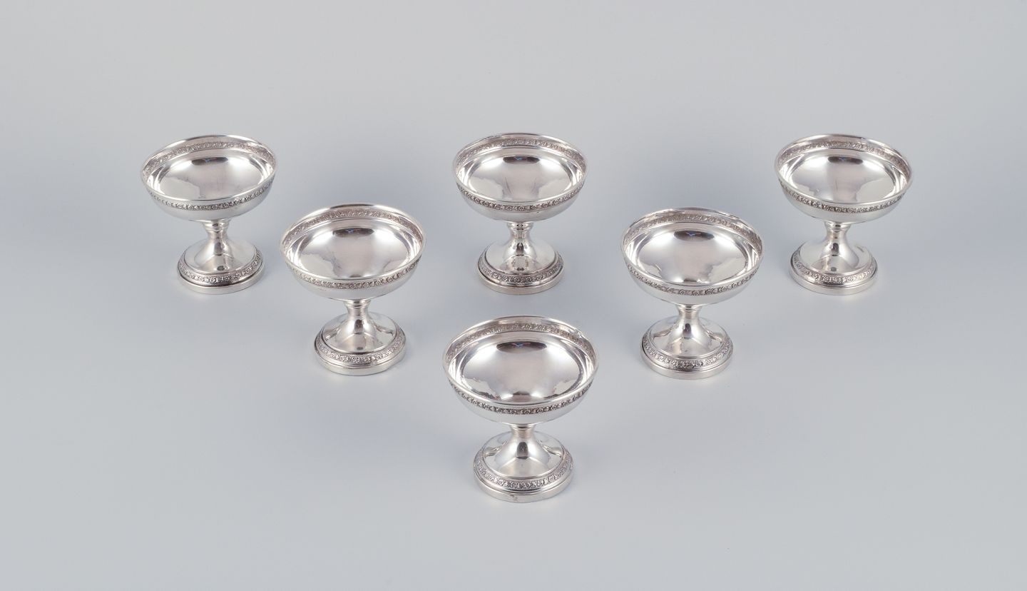 A set of six American sterling silver goblets. Classic design adorned with flowers. From the 1930s/40s. Hallmarked. In very good condition. Dimensions: Height 7.8 cm x Diameter 8.4 cm.