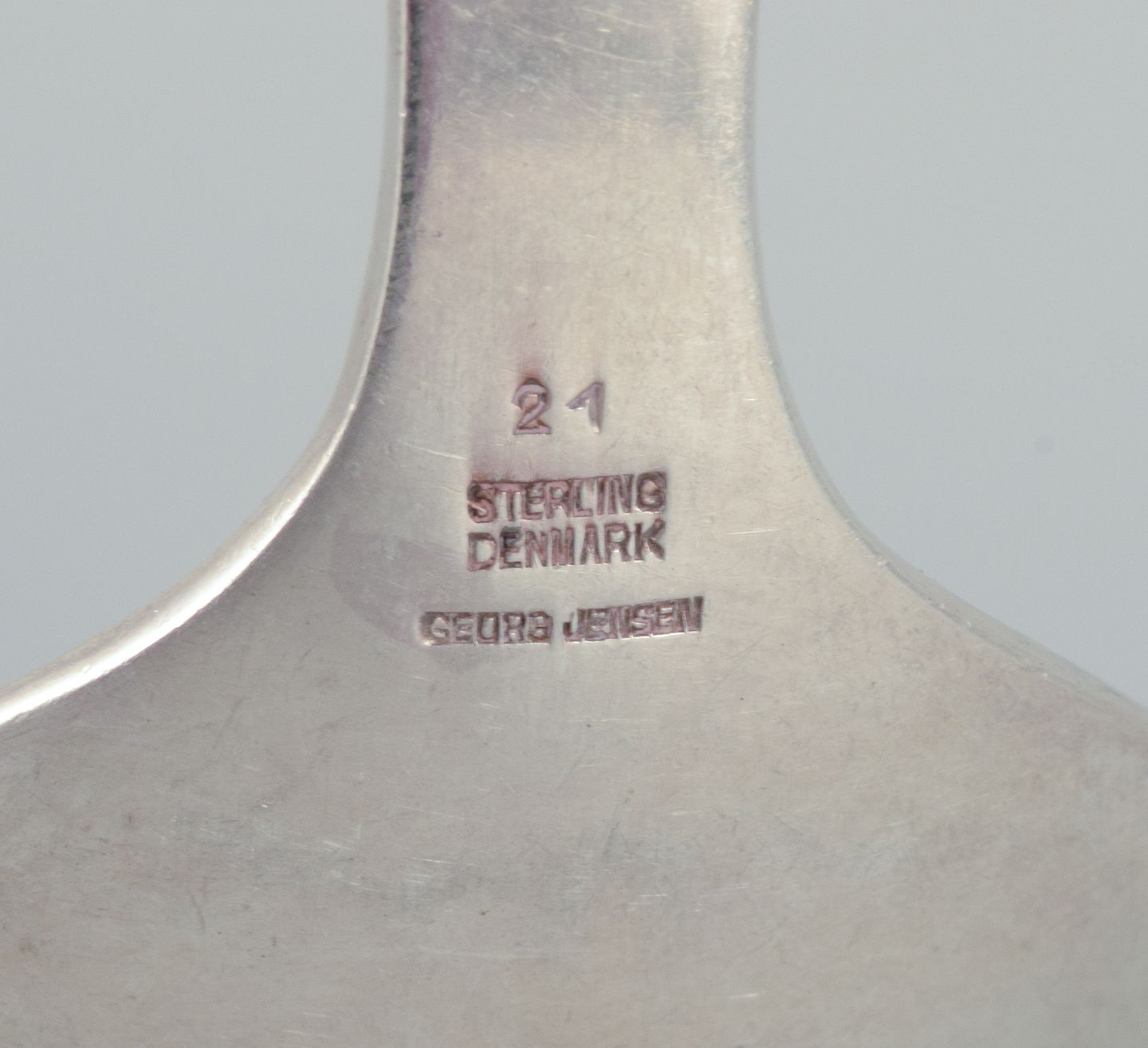 Georg Jensen serveringsgaffel i sterlingsølv. No 21. Stemplet ca. 1920. I flot stand med almindeligt brugspræg. Mål: L 16,7 cm.