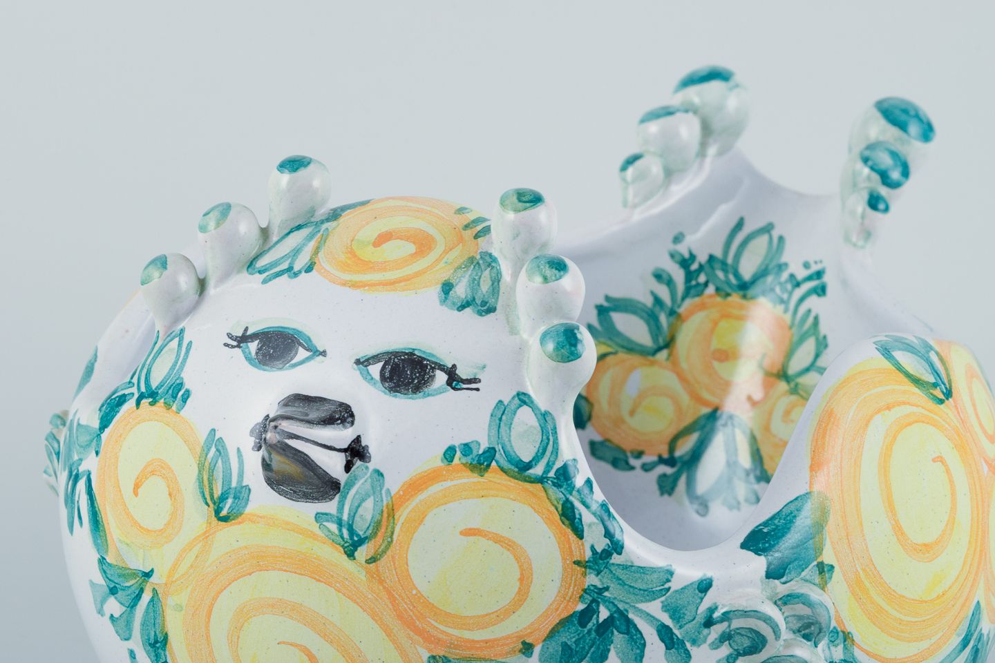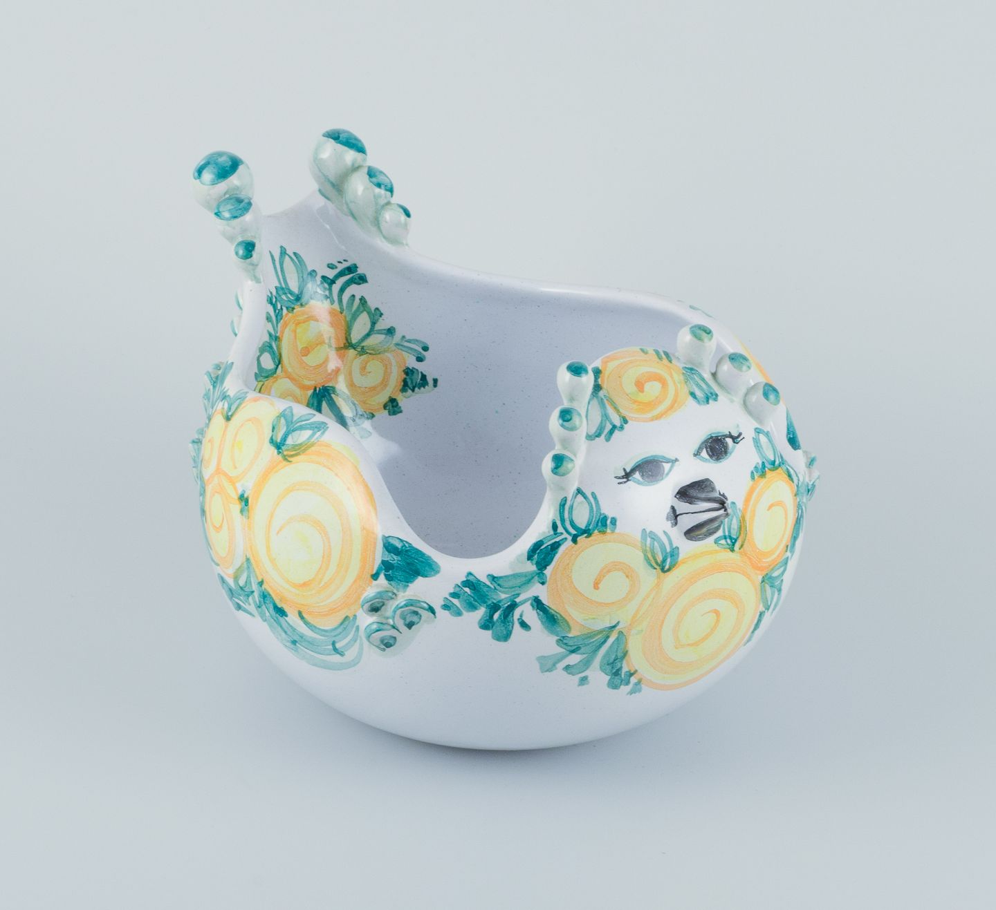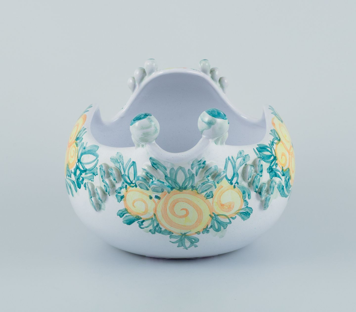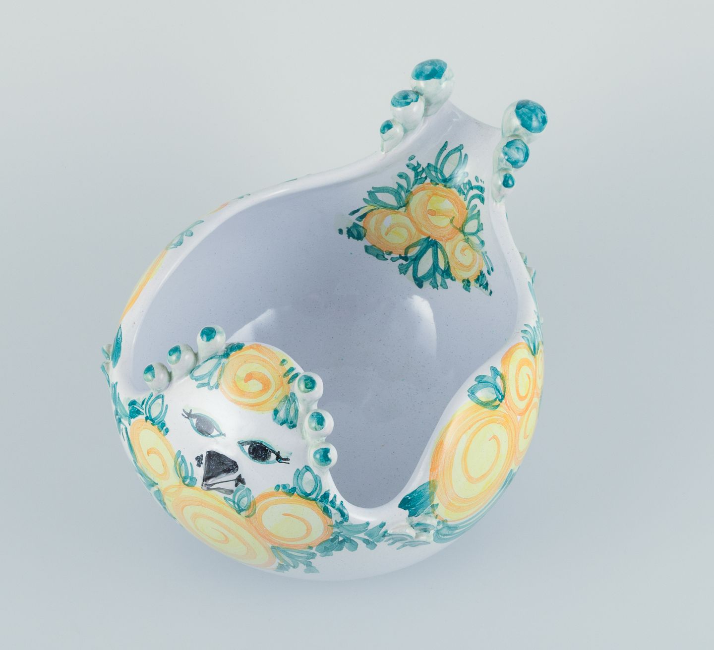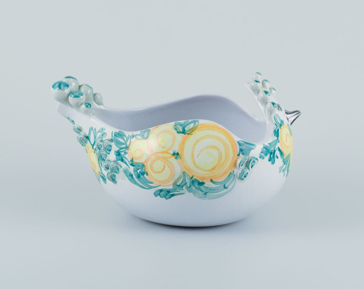 Bjørn Wiinblad (1918-2006) for Det Blå Hus (The Blue House), Denmark. Large unique ceramic bowl shaped like a bird. Glazed in green and yellow tones.