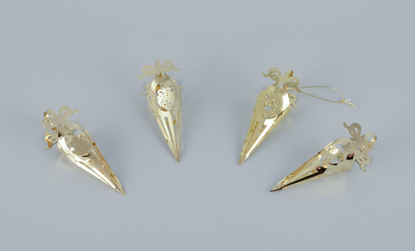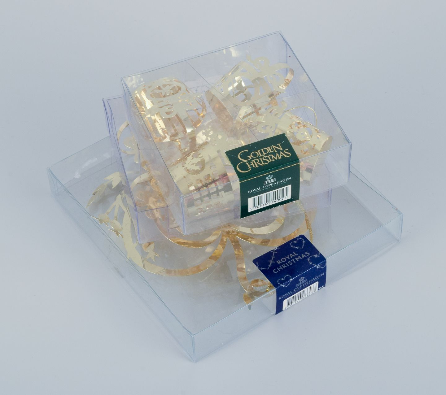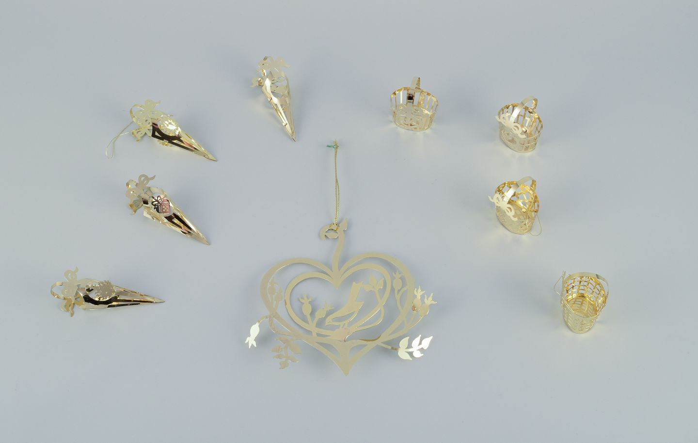 Royal Copenhagen ”Royal Christmas”. Ni juledekorationer i messing til ophæng på juletræ og i vinduet.