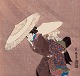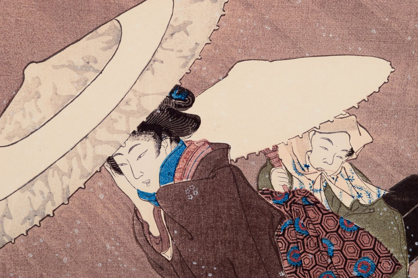Fujimaro Kitagawa (1790-1850) Træsnit på japanpair. Snelandskab med kvinde I traditionelle klæder bærende på barn.