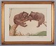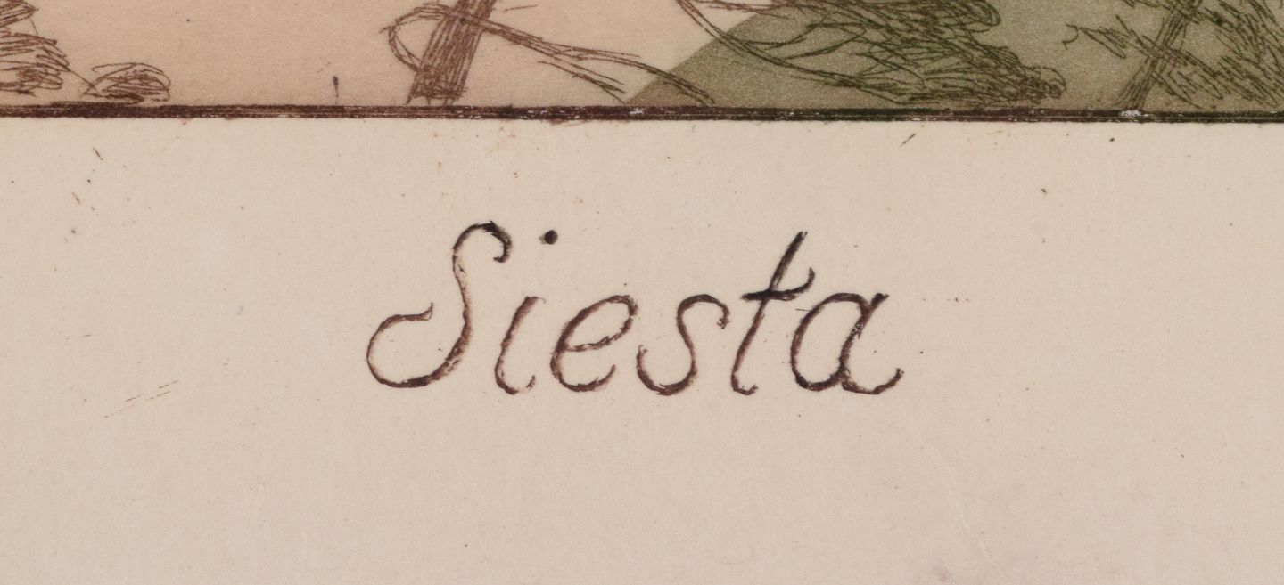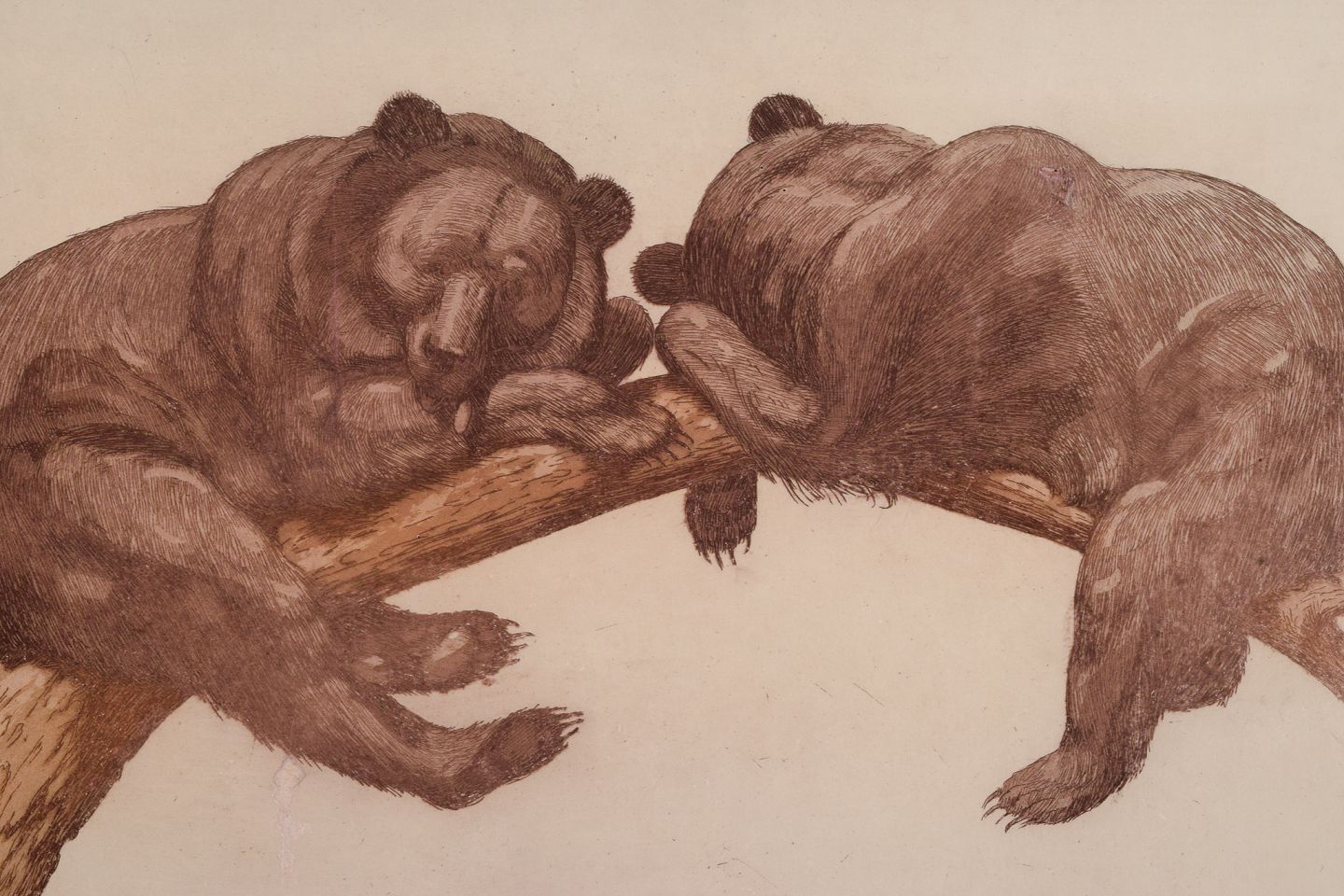 Louis Moe (1857–1945), well listed Norwegian artist. Color etching on Japanese paper. Opus 51 "Siesta". Two resting brown bears in a tree.