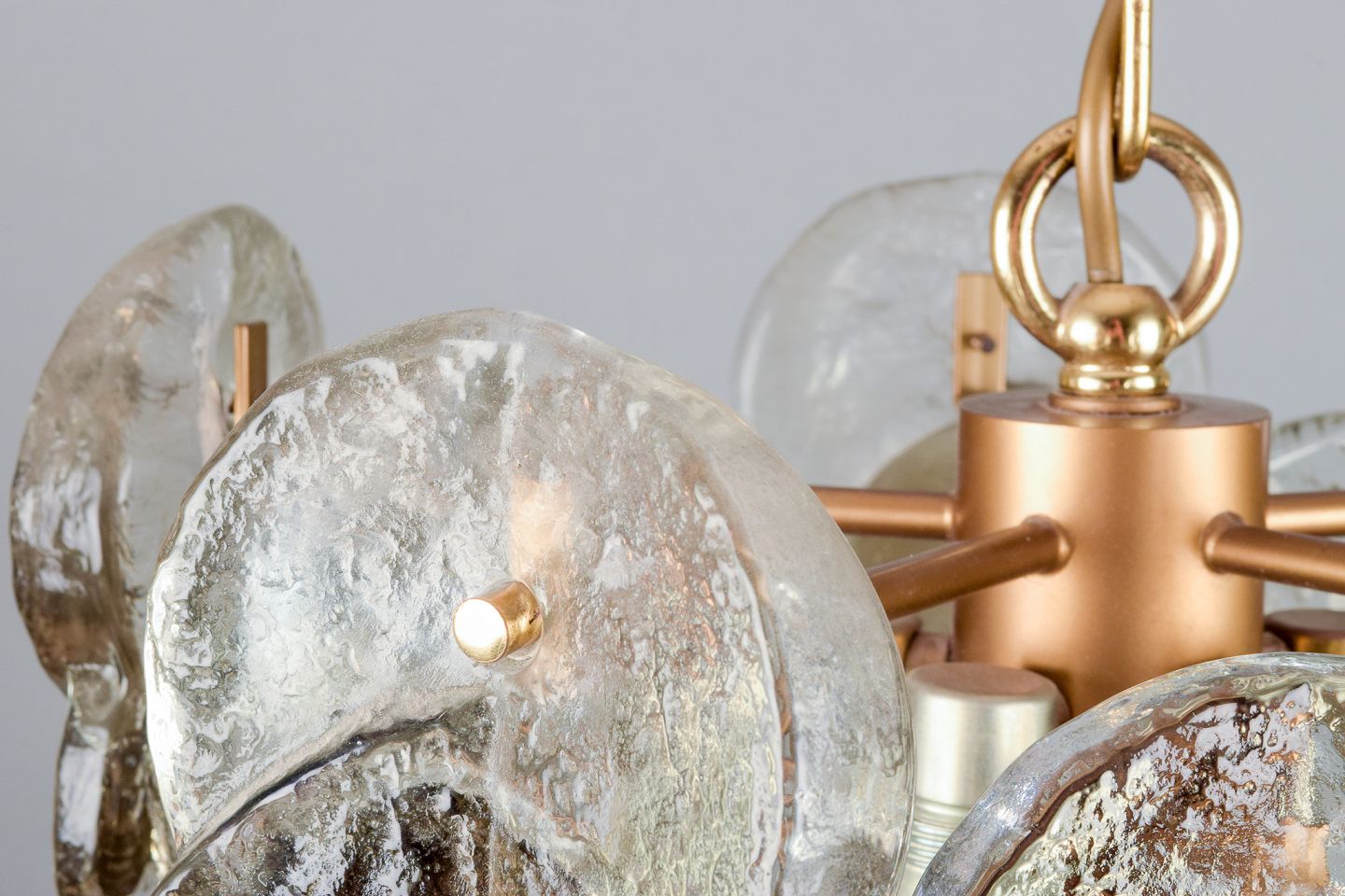 Loftslampe i kunstglas til seks pærer. Klart og lysebrunt mundblæst glas.