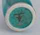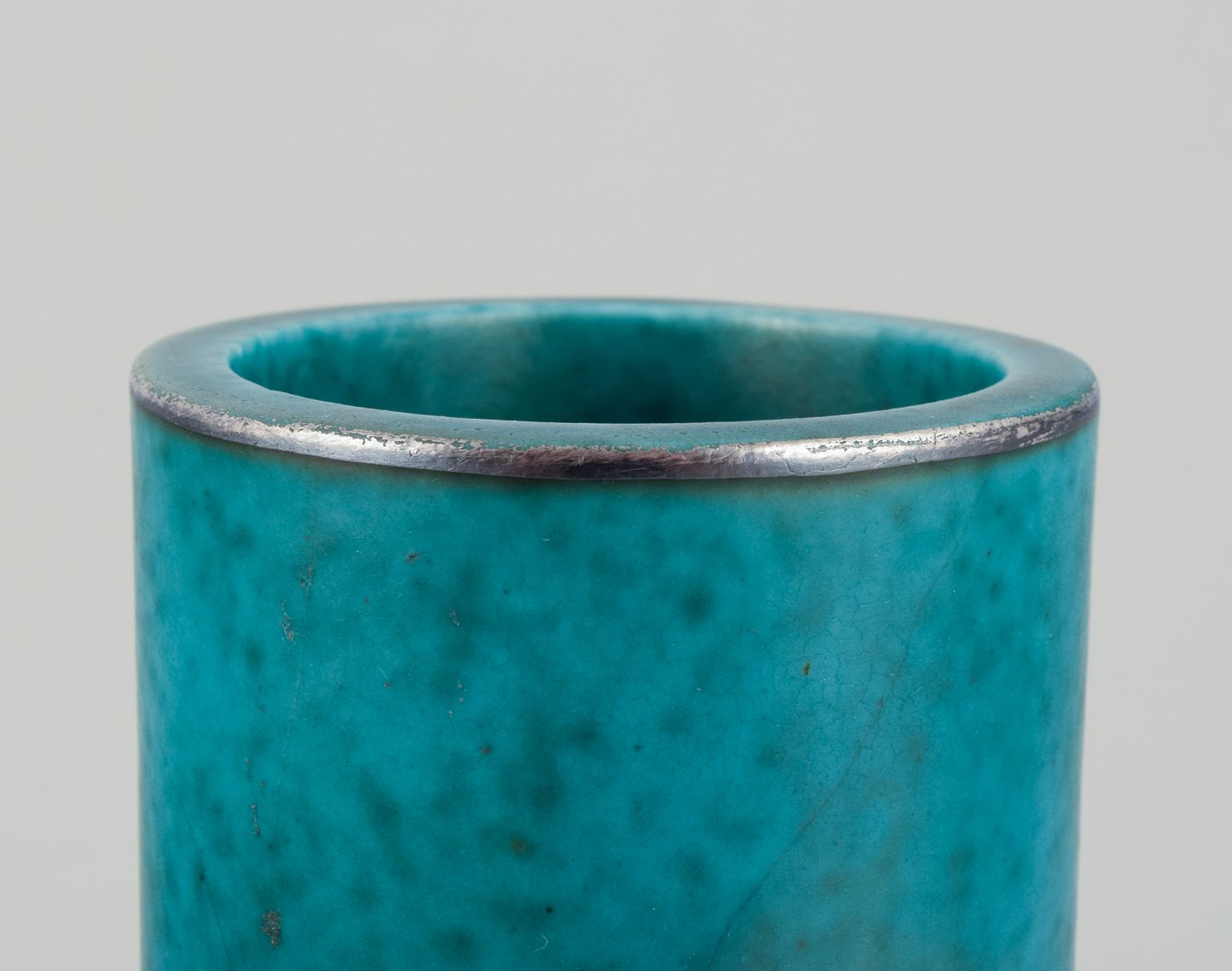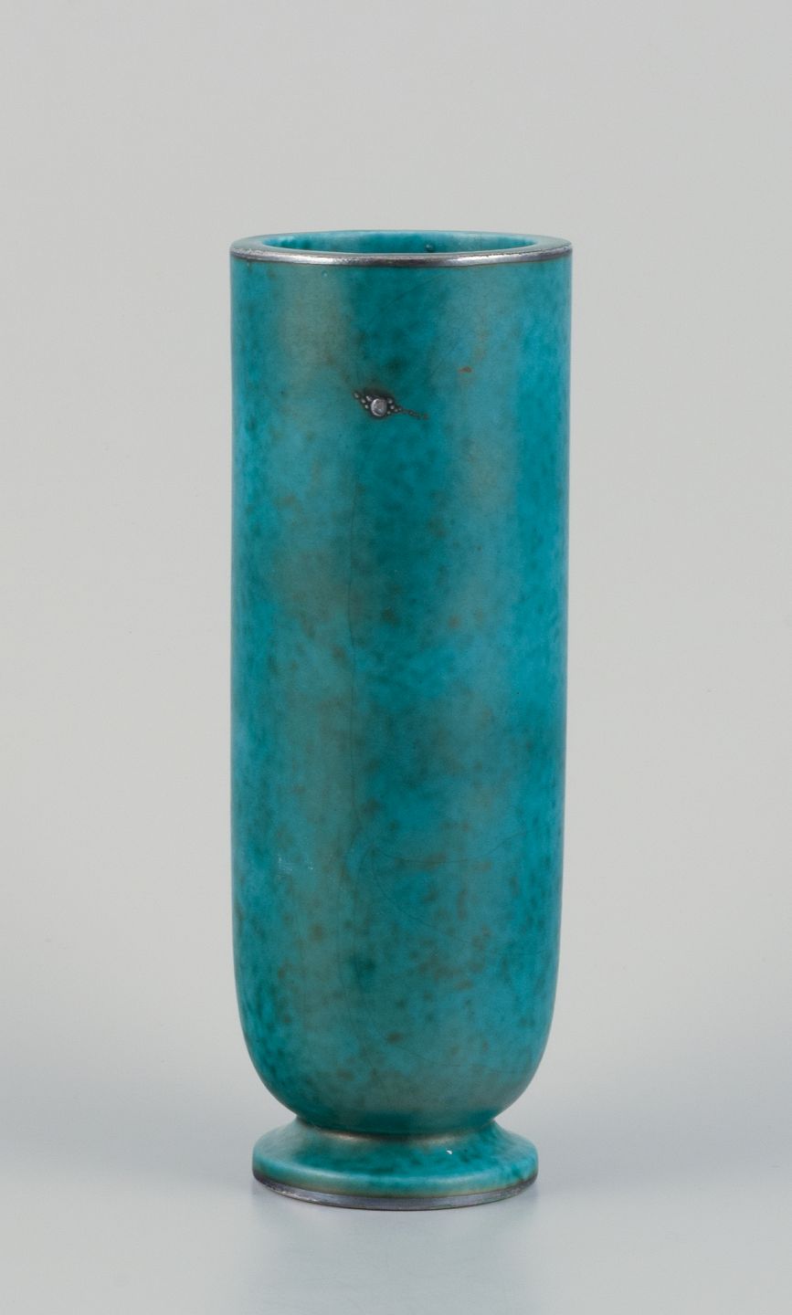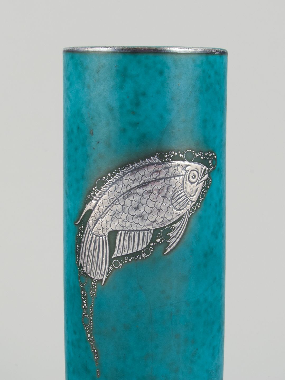Wilhelm Kåge (1889-1960) for Gustavsberg, Sverige. Art Deco keramikvase med fiskemotiv i sølvdekoration. Fra Argenta serien. 1940’erne. I flot stand. Mål: D 7,5 cm. x 21,0 cm.