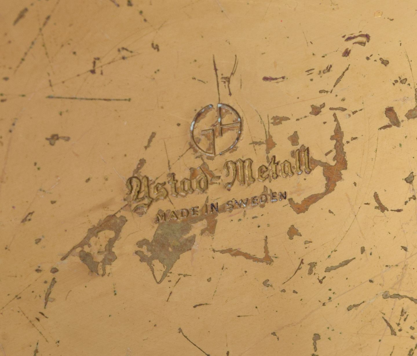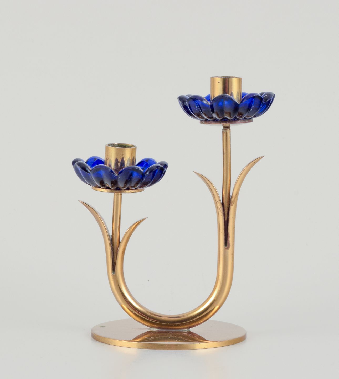 Gunnar Ander for Ystad Metall, Sverige. Lysestage i messing og blåt kunstglas formet som blomster. Til to lys.