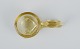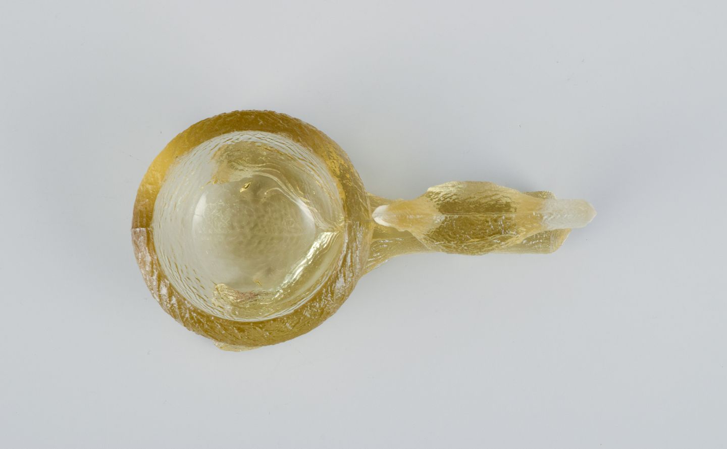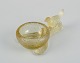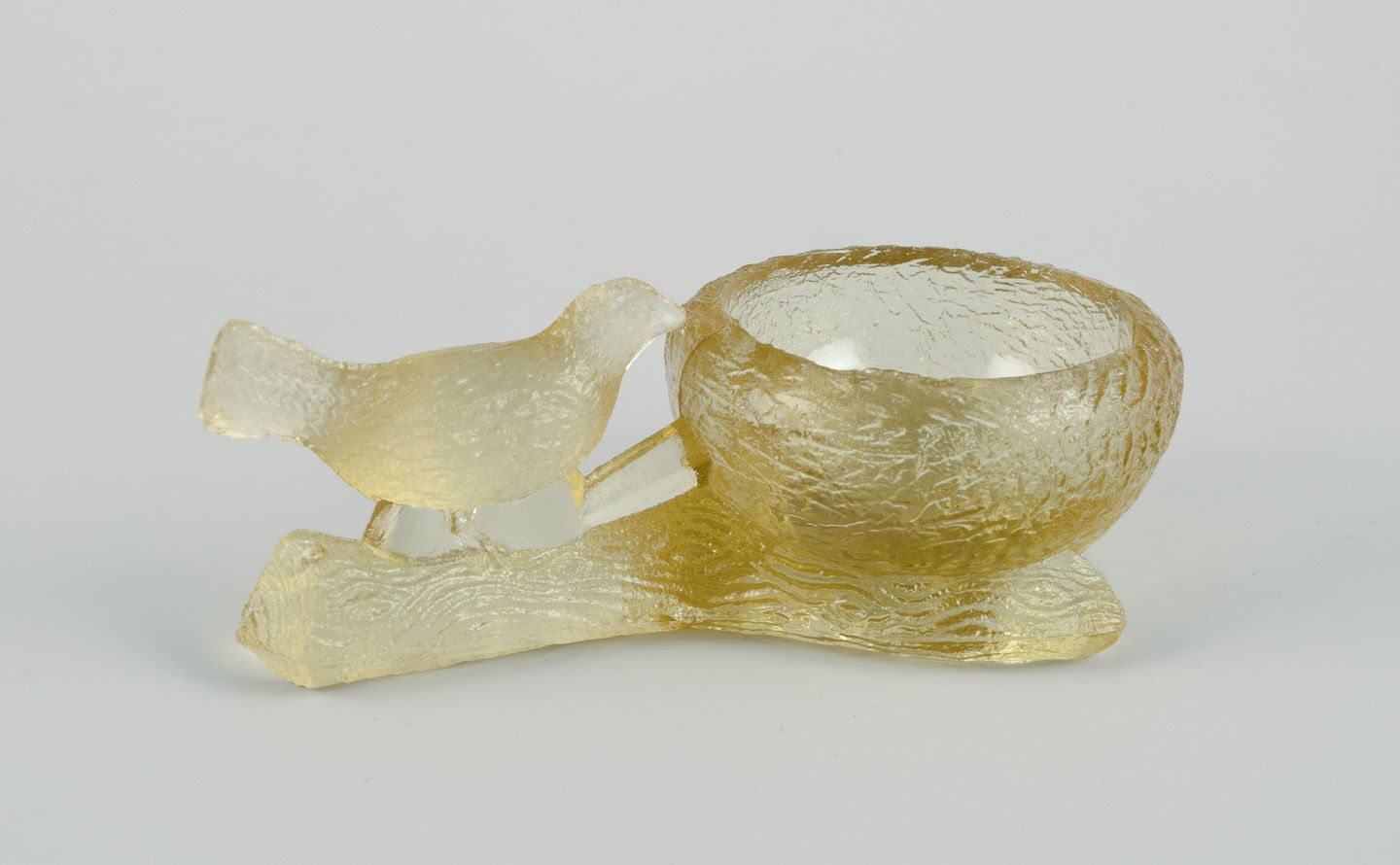 To saltkar med fugle i farvet glas. Gulbrunt håndlavet glas.