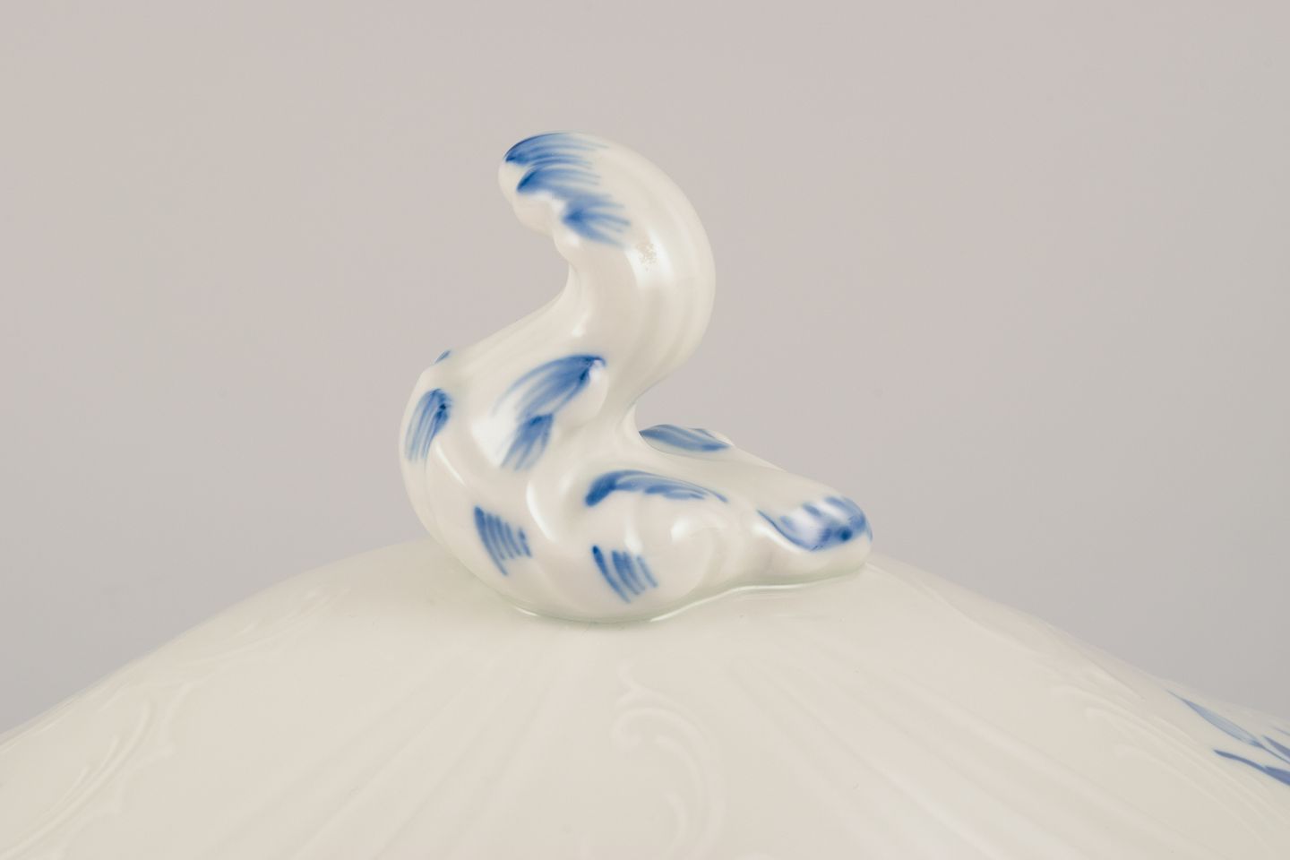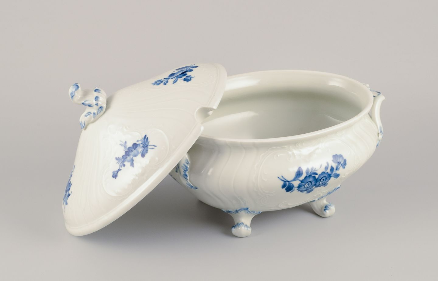 Royal Copenhagen, Juliane Marie Blå Blomst. Stor lågterrin i hvidt porcelæn håndmalet med blå blomster.