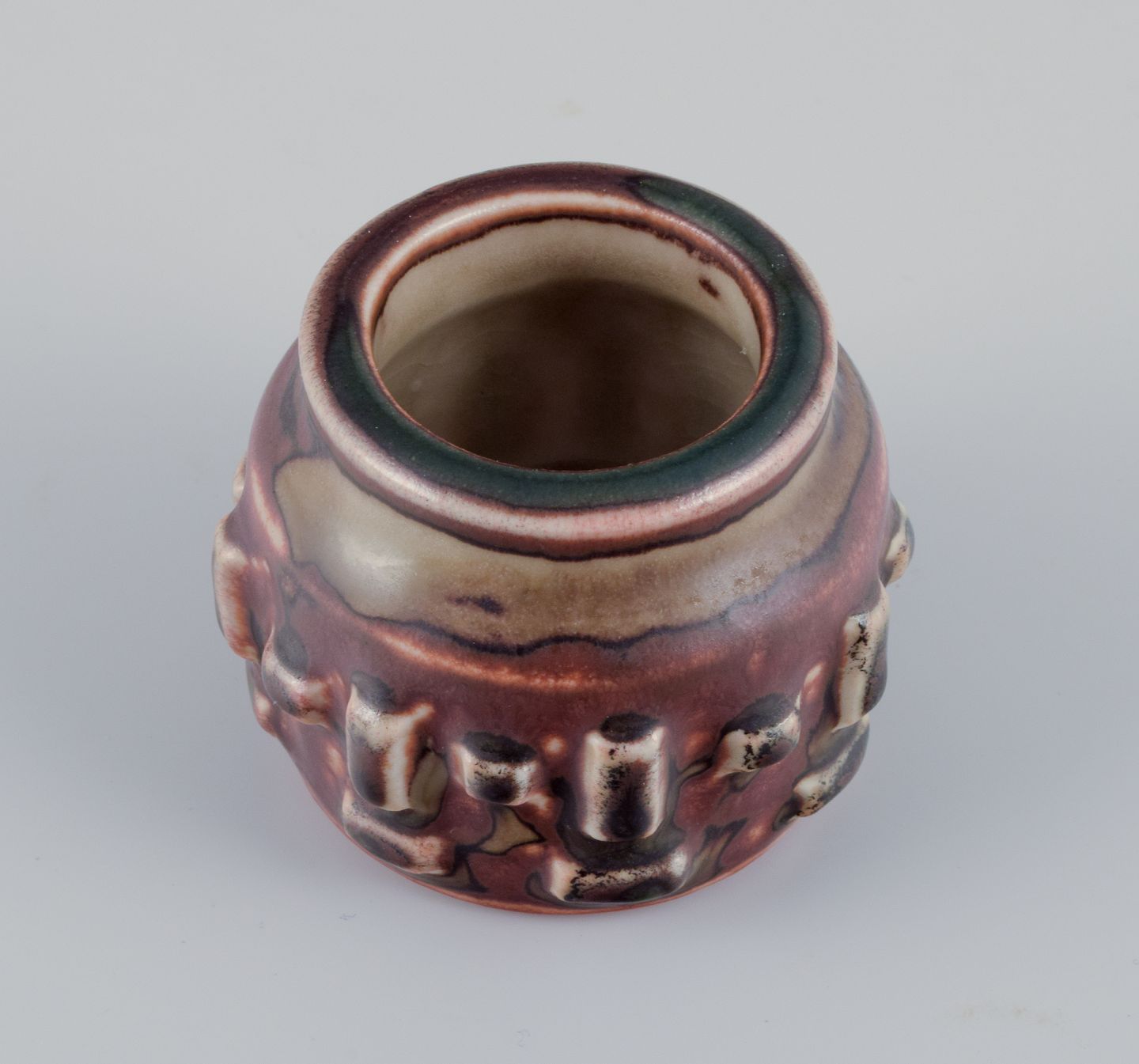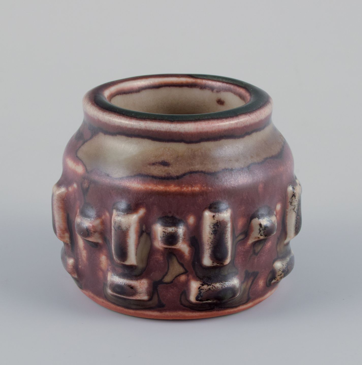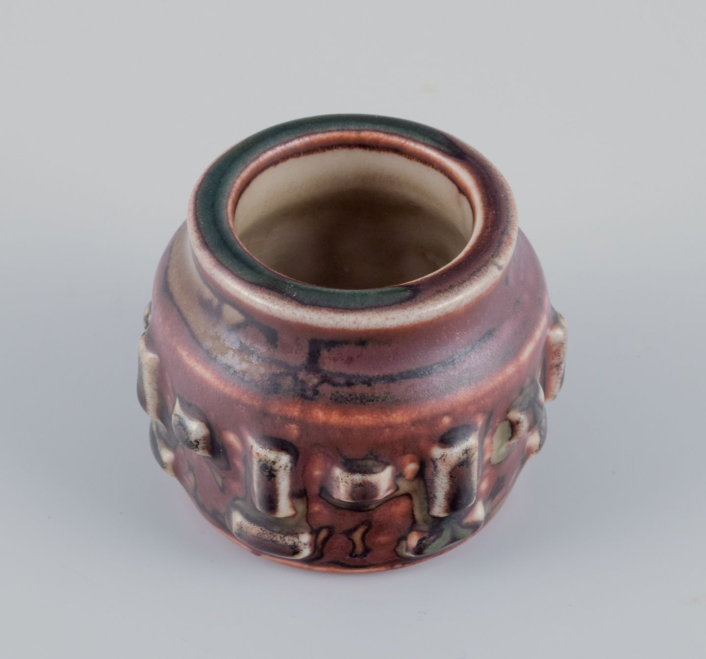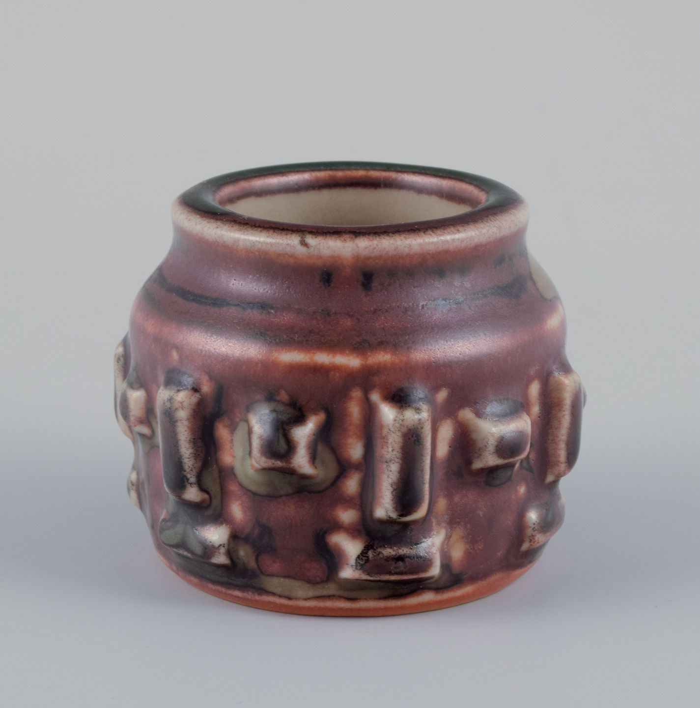 Jørgen Mogensen for Royal Copenhagen. Miniature keramikvase i sung glasur. Geometriske felter i relief. Ca. 1960’erne. Model 21583. Stemplet. Perfekt stand. Første sortering. Mål: D 5,0 cm. x H 4,5 cm.